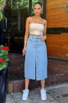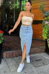 Açık Mavi Cepli Yırtmaçlı Uzun Denim Etek