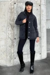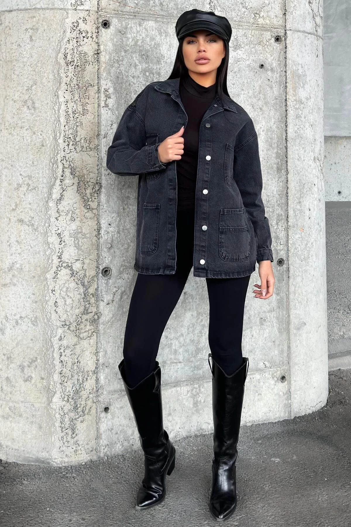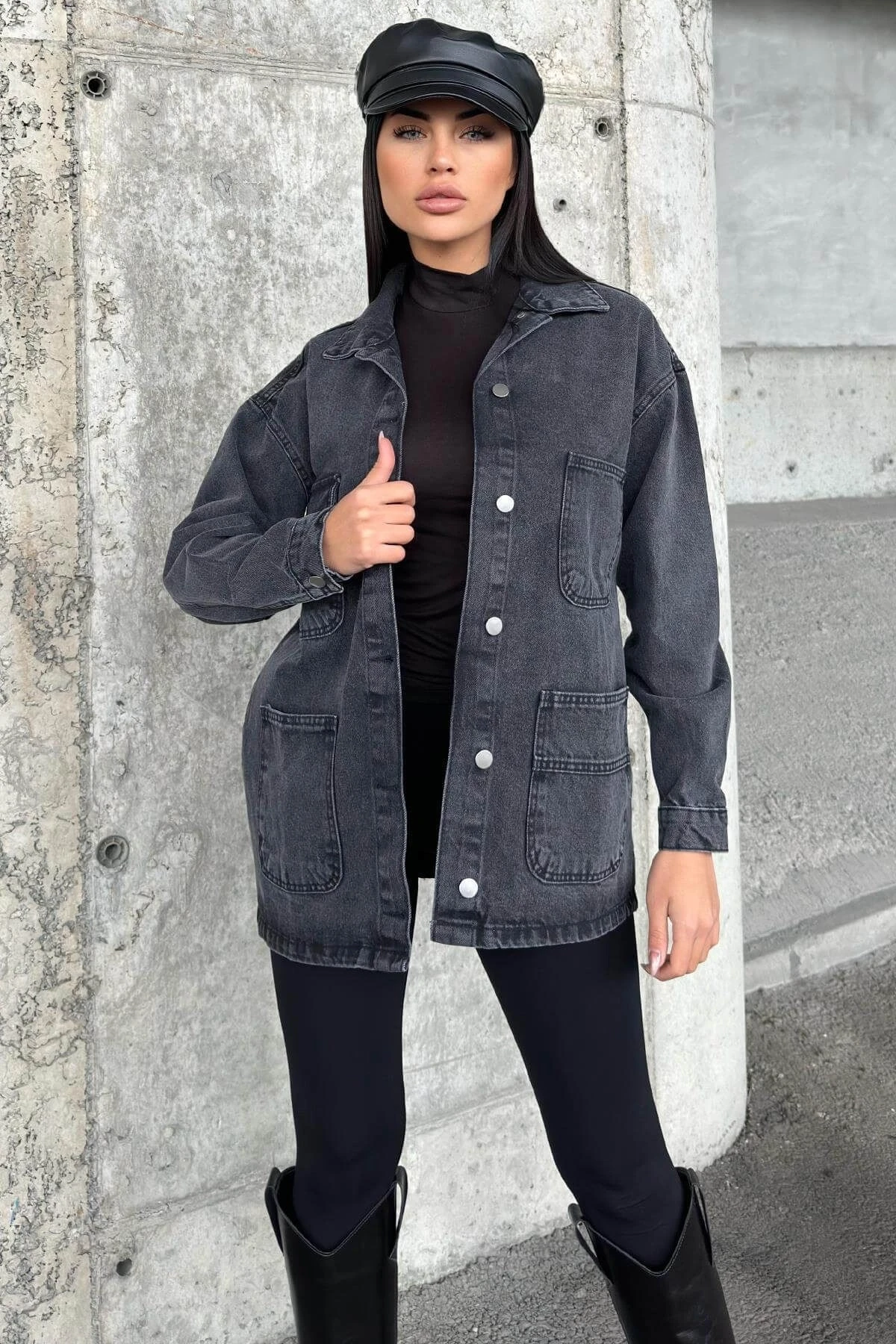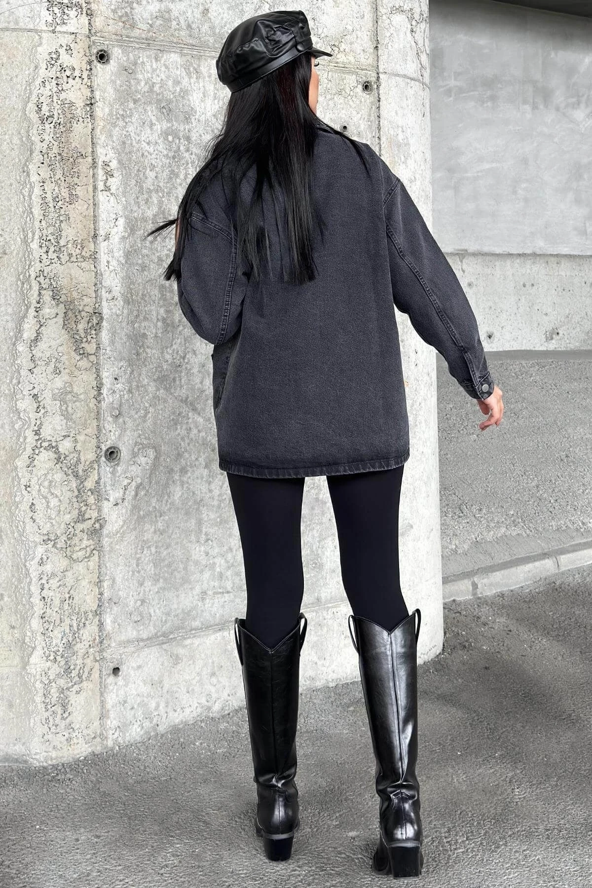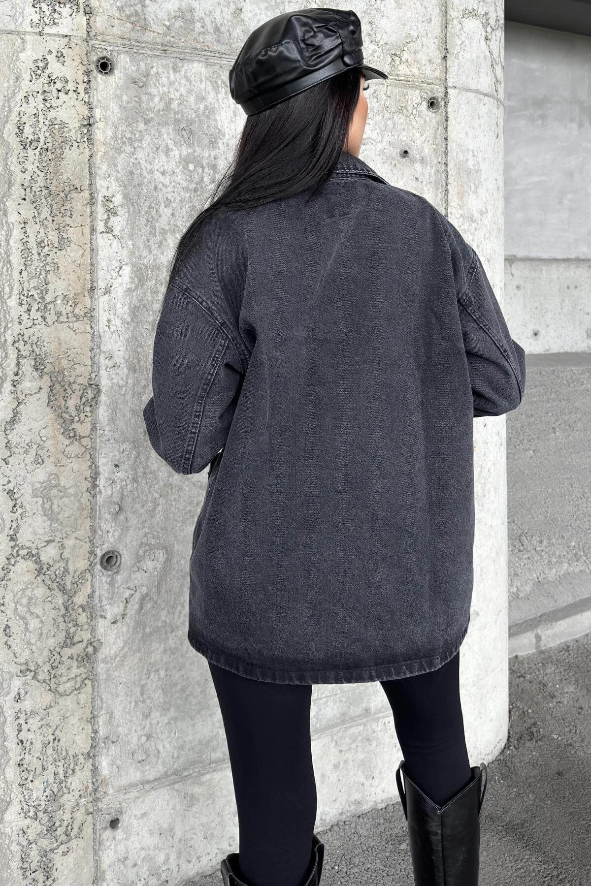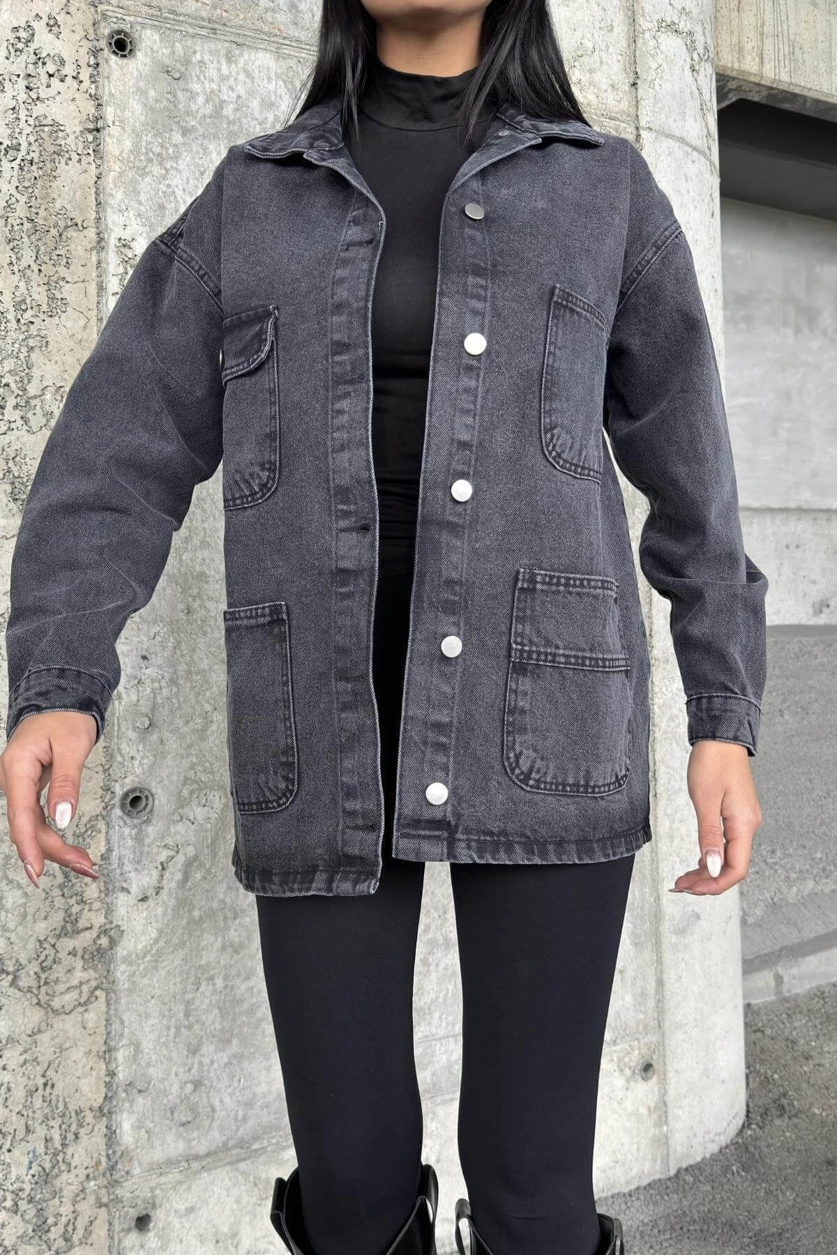 Antrasıt Geniş Cepli, Düğme Detaylı, Oversize Kot Ceket Gömlek
