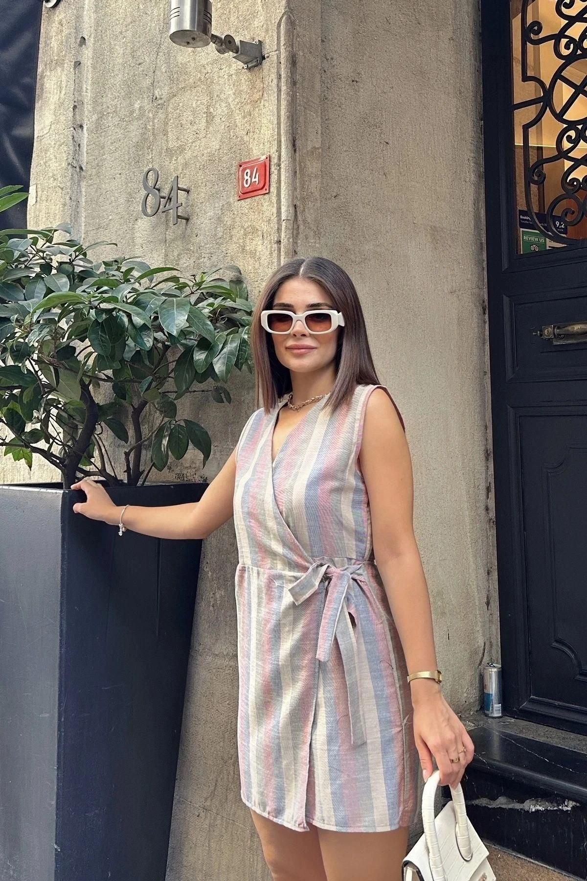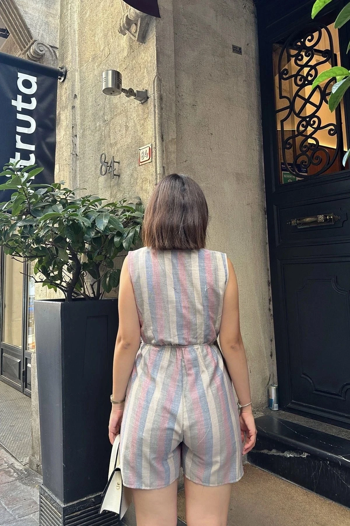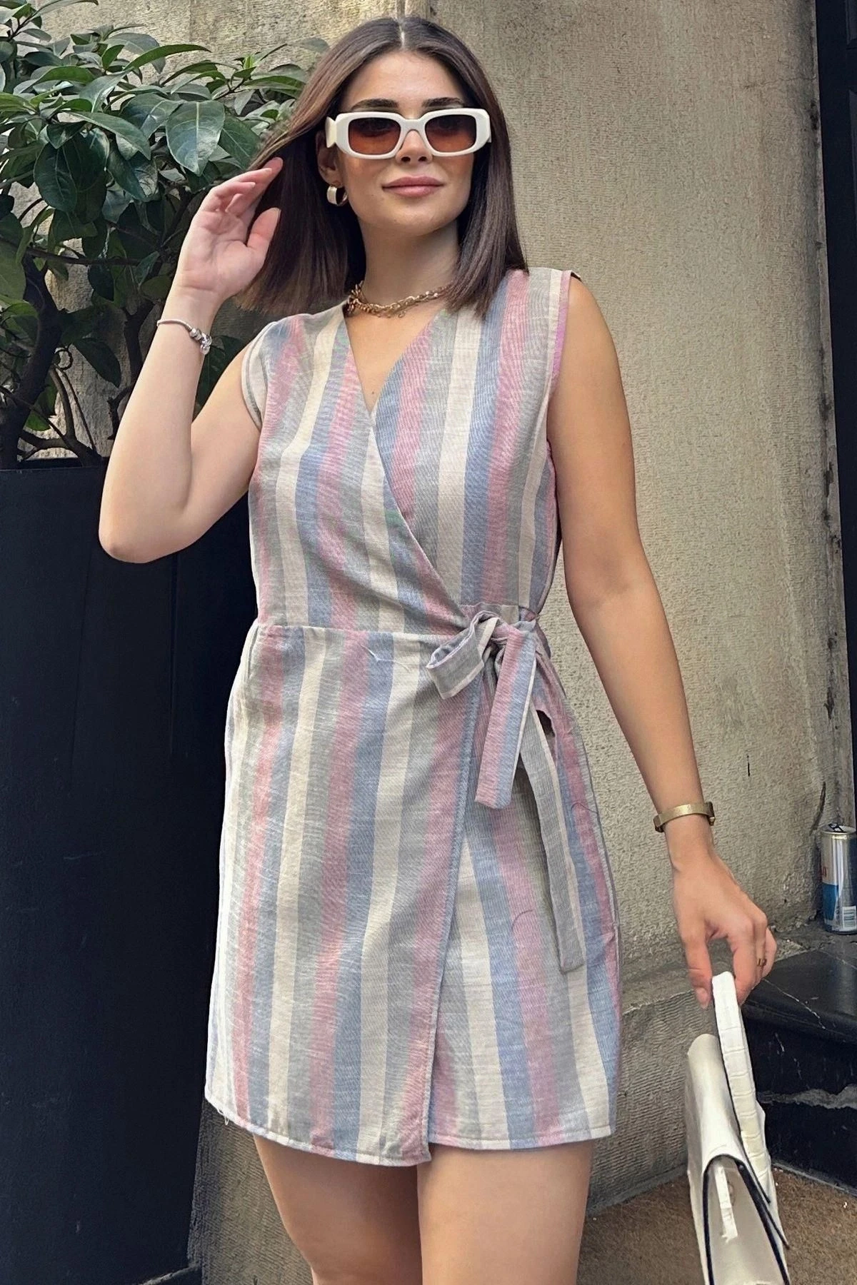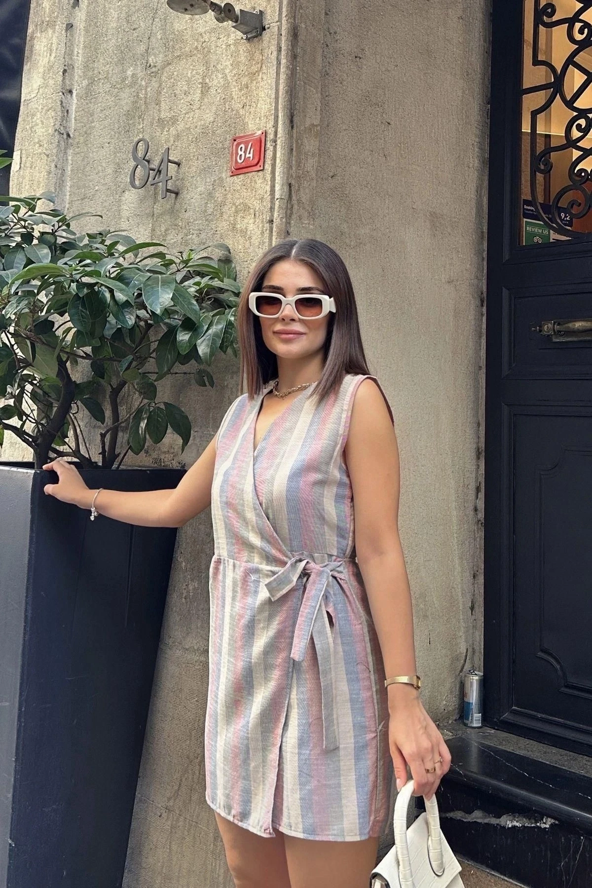 Antrasit & Vizon, Kolsuz, Keten, Kruvaze, Belden Bağlamalı, Elbise Görünüm Şort Etekli Kısa Tulum