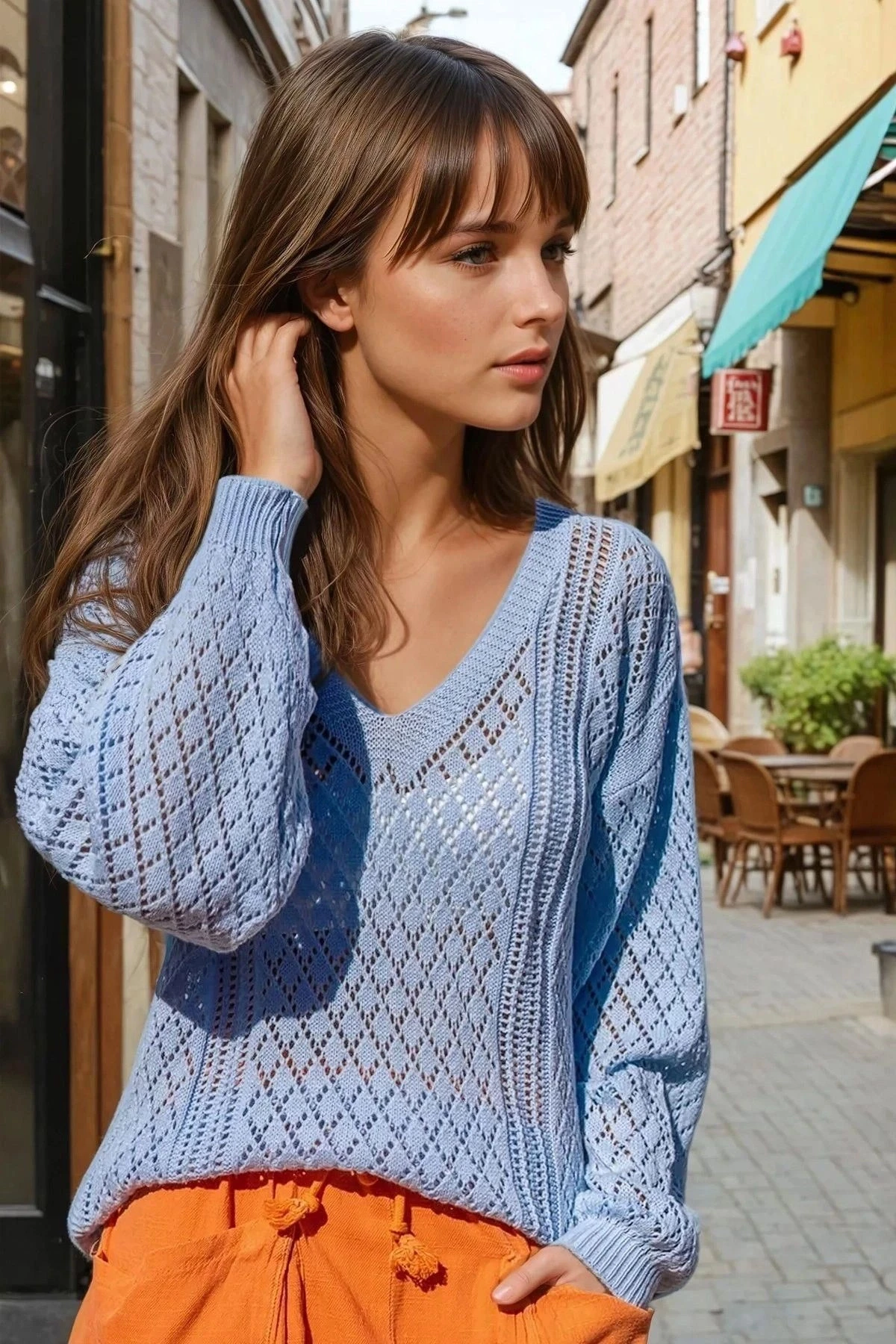 Bebe Mavi Derin V Yaka, Ajurlu Salaş Triko Kazak