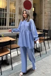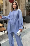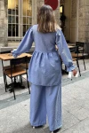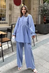 Bebe Mavi Hakim Yaka, Balon Kol, Tunik & Bol Paça Pantolon - Fırfırlı Salaş Alt & Üst Pamuklu Takım