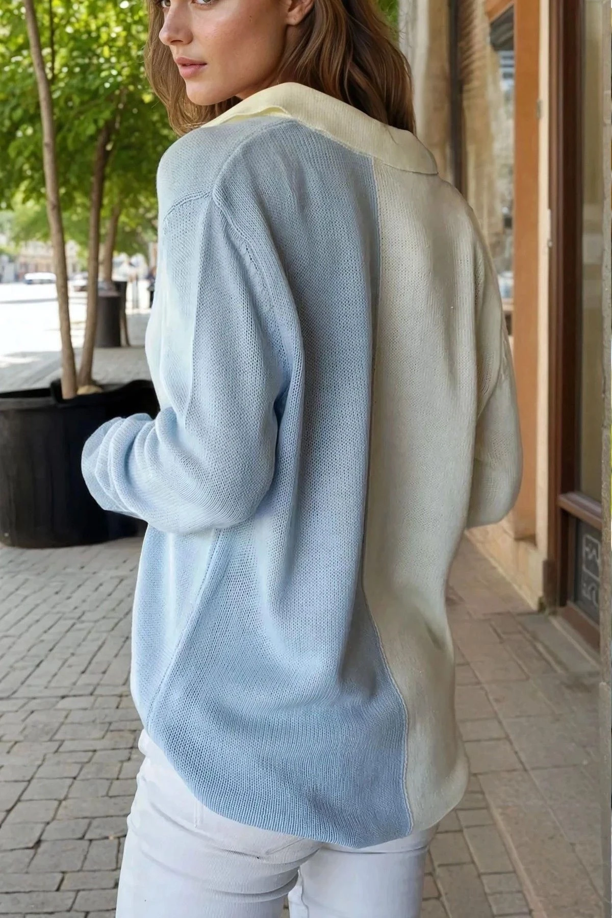 Bebe Mavi Ve Ekru Renk Bloklu, Polo Yaka, Salaş Triko Kazak