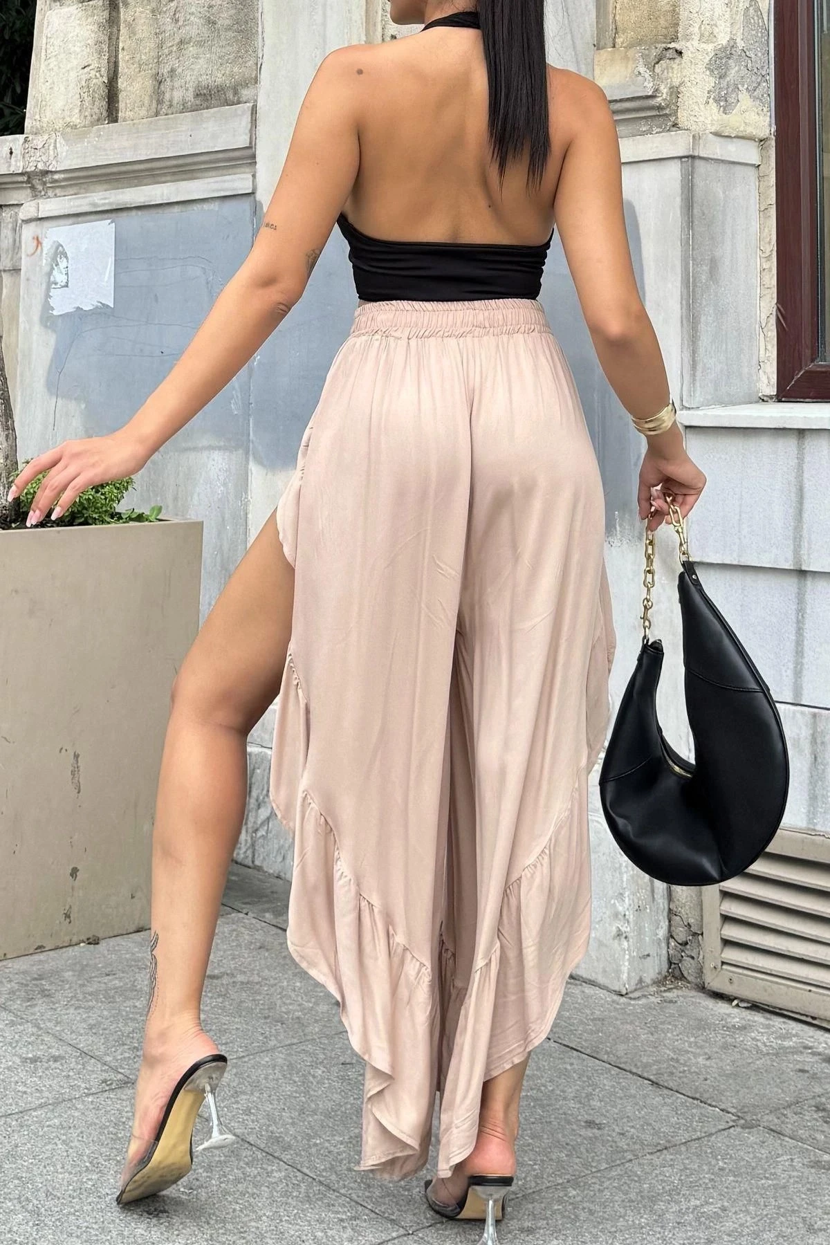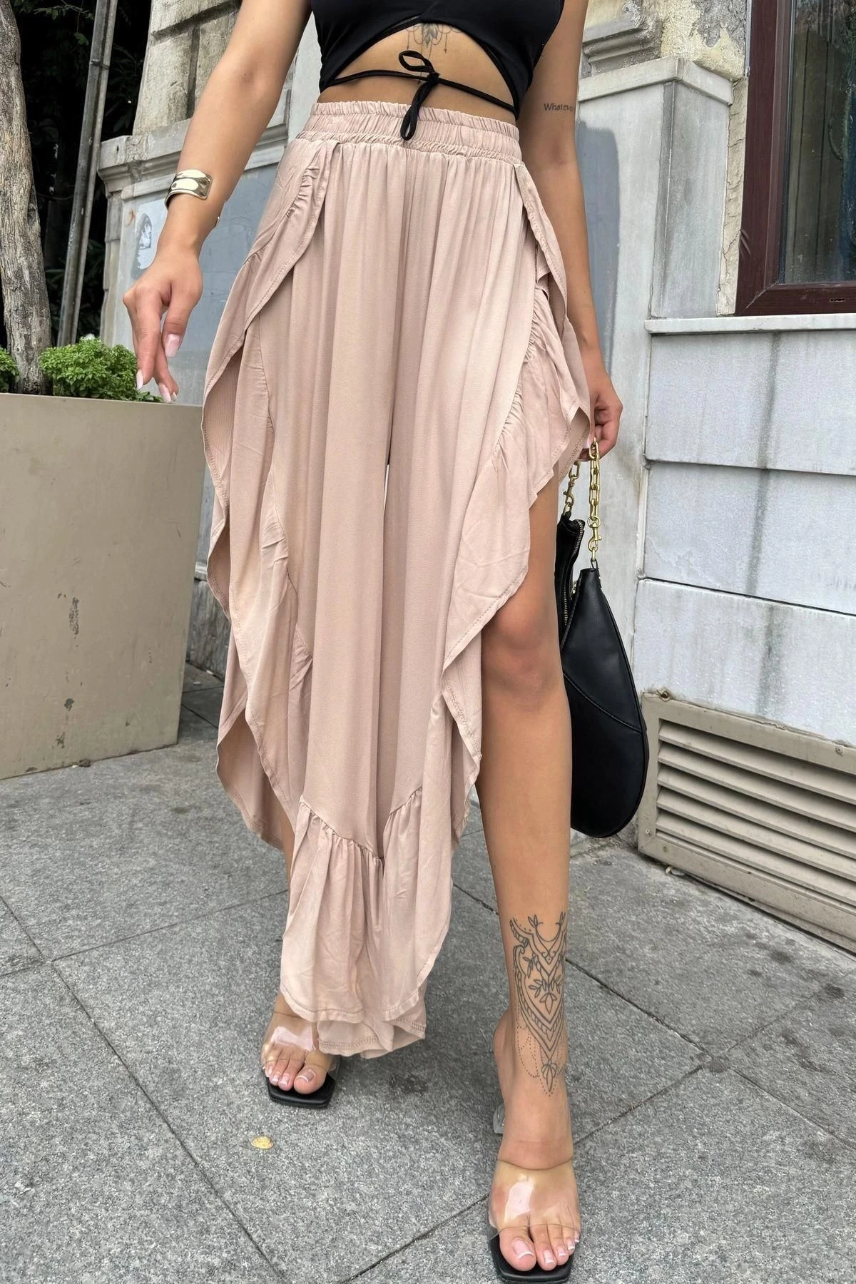Bej Bohem Tarz, Yüksel Bel, Derin Yan Yırtmaçlı, Fırfırlı Asimetrik Kesim, Salaş Etek Pantolon