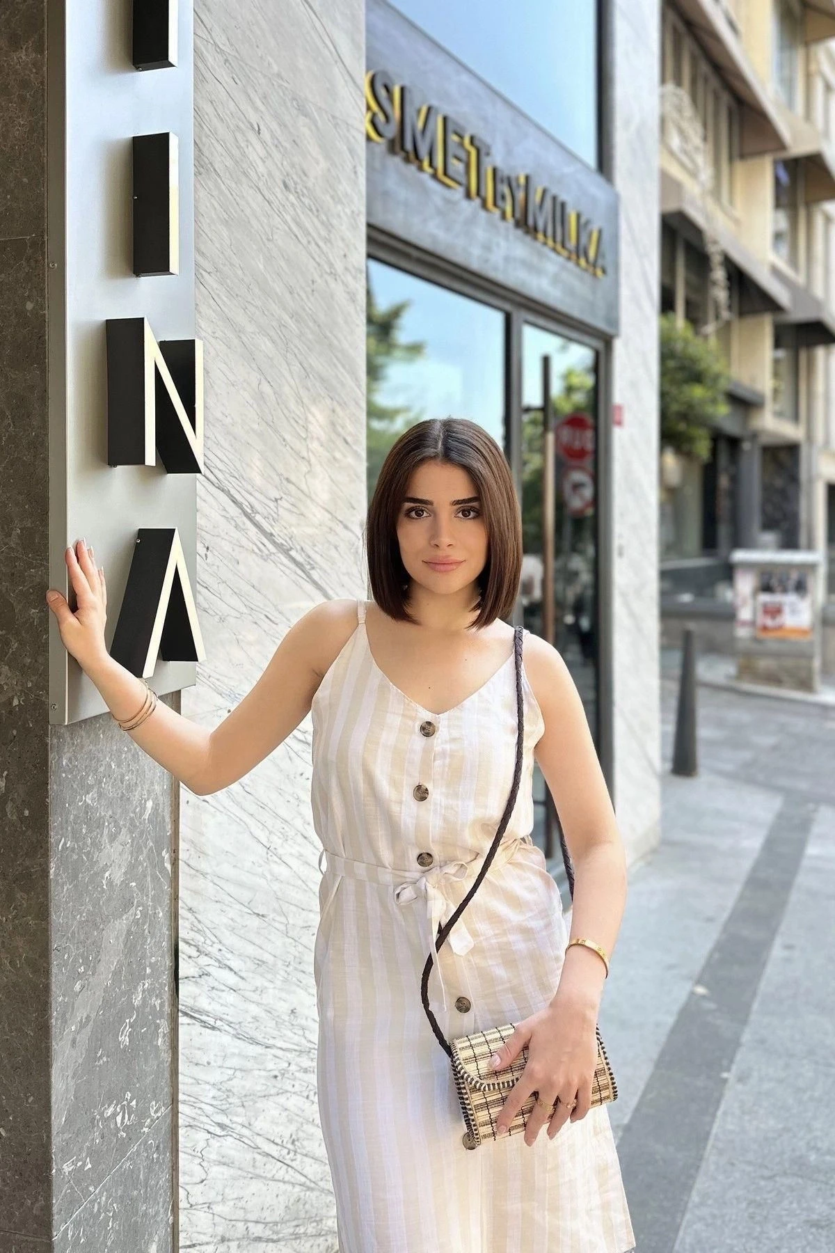 Bej & Ekru Geniş Yaka, Askılı Kol, Çizgili, Keten Kumaşlı Gömlek Elbise, zarafeti ve rahatlığı bir araya getiriyor.; Bu elbise, %60 keten ve %40 pamuk karışımı kumaş kullanılarak özenle tasarlanmıştır.; Kumaş seçimi, elbisenin yaz aylarında serinlik ve hava alabilirlik sağlamasını garanti eder.; %60 keten ve %40 pamuk karışımı, hafif ve doğal bir hissiyat sunar.; Bu kumaş, yaz sıcaklarında bile rahatlıkla giyilebilecek bir dokunuş sağlar.; Renk olarak bej ve ekru çizgili desen tercih edilmiştir.; Bu kombinasyon, elbiseye şıklık ve klasik bir görünüm katar.; Çizgili desen, elbiseye dinamik bir görünüm ve özgün bir tarz kazandırır.; Geniş yaka ve askılı kol detayları, elbiseye feminen bir hava katar ve sizi serin tutar.; Bu detaylar, elbiseye zarif bir dokunuş eklerken aynı zamanda hareket özgürlüğü sağlar.; Kemerli veya kuşaklı seçenekleriyle belinizi vurgulayabilirsiniz.; Midi boyu, elbiseye sofistike bir görünüm katar.; Hem gündüz hem de gece giyilebilecek bu elbise, her mevsimde gardırobunuzun vazgeçilmez bir parçası olacak.; Bej & Ekru Geniş Yaka, Askılı Kol, Çizgili, Keten Kumaşlı Gömlek Elbise, kaliteli kumaşı, şık renkleri ve özgün tasarımıyla tarzınızı tamamlar.; Hem rahat hem de şık bir görünüm sunan bu elbiseyle her anınızda kendinizi özel hissedeceksiniz.