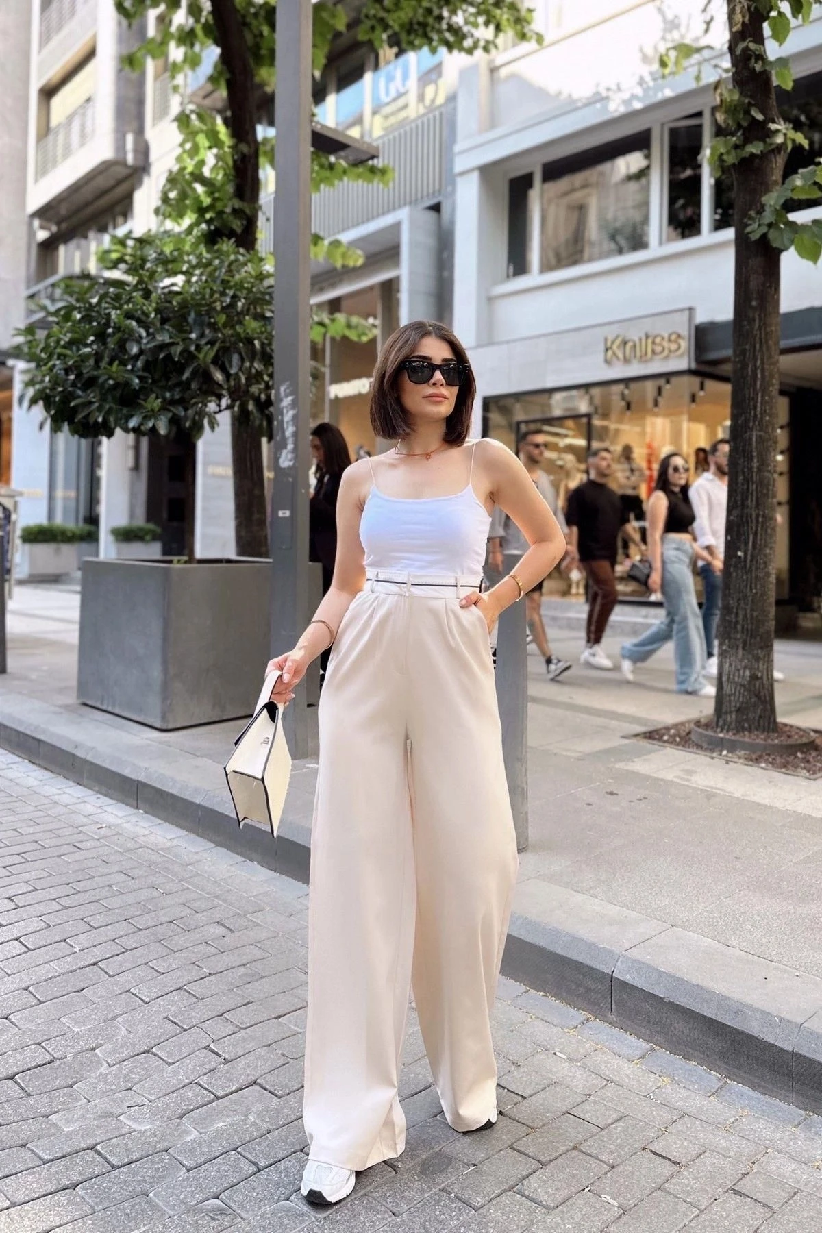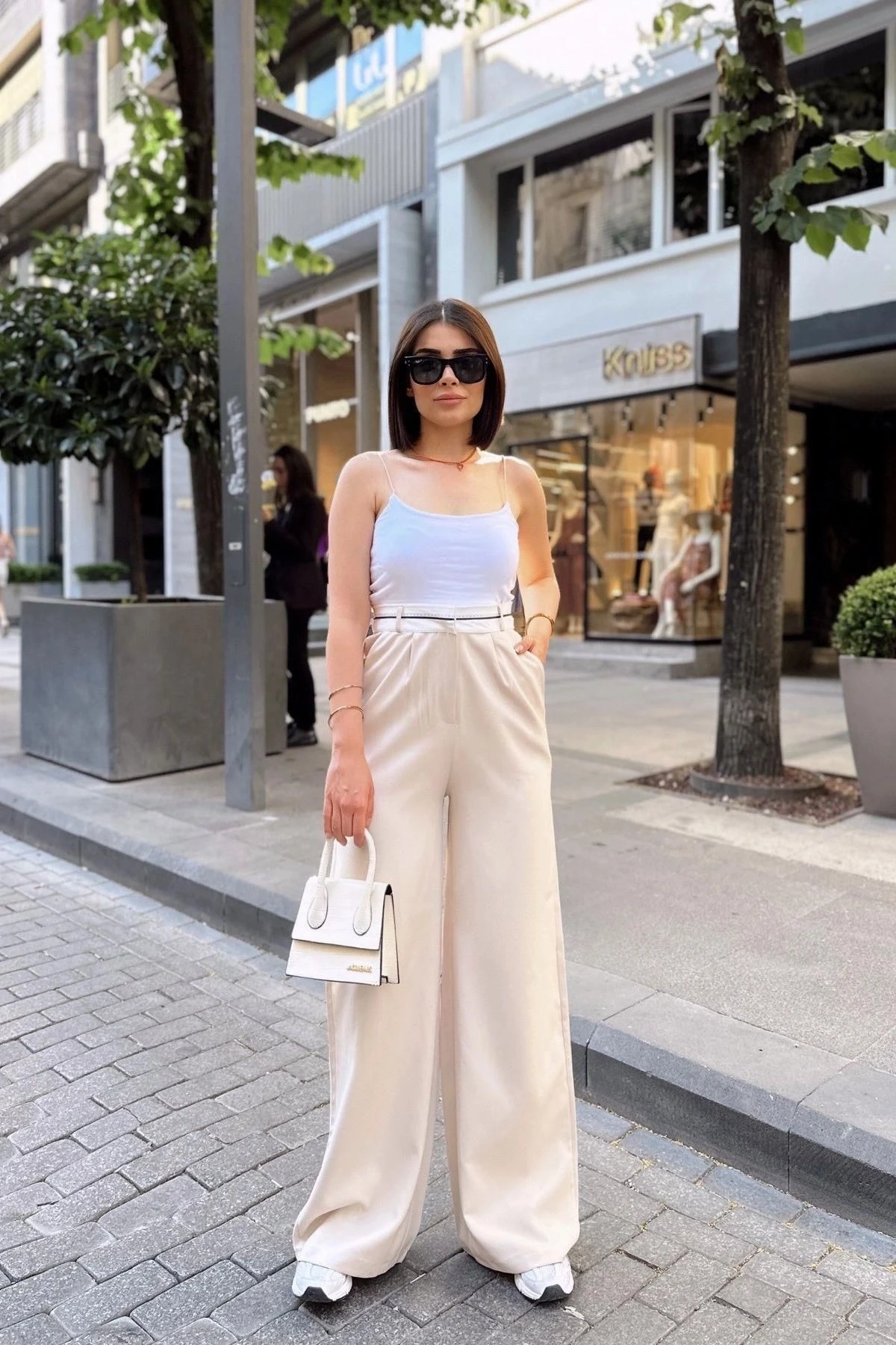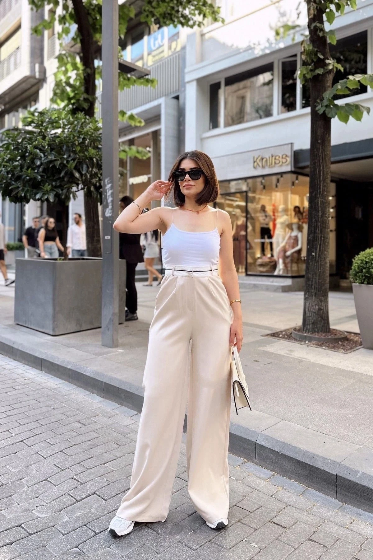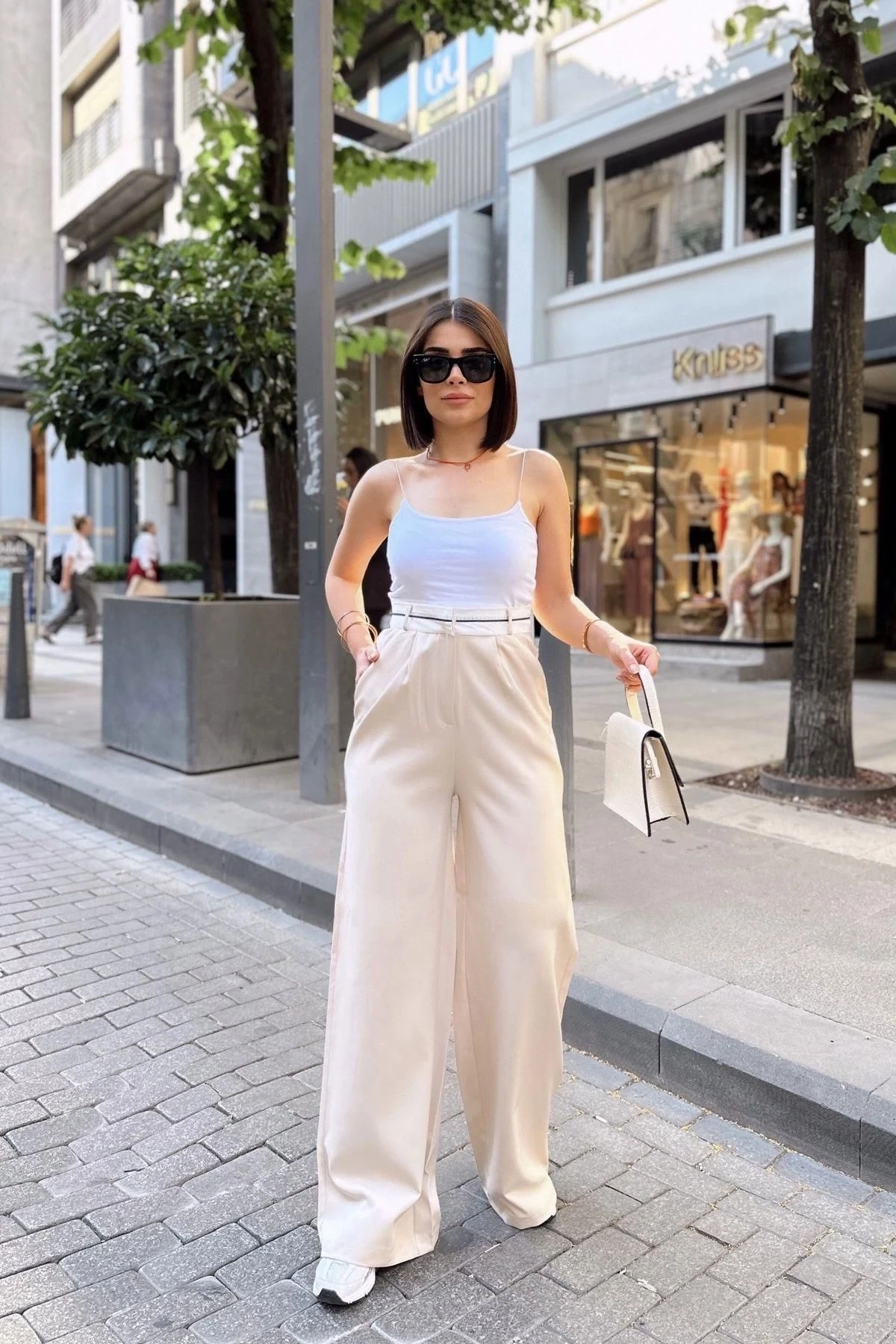 Bej İspanyol Bol Paça, Yüksek Bel, Kaliteli Kumaşlı Palazzo Pantolon, hem şıklığı hem de rahatlığı bir arada sunuyor.; Bu pantolon, %65 polyester ve %35 viskon karışımı kumaş kullanılarak özenle tasarlanmıştır.; Kumaş seçimi, pantolonun kalite ve konfor sağlamasını hedefler.; %65 polyester ve %35 viskon karışımı kumaş, pürüzsüz bir dokuya sahiptir ve uzun ömürlü kullanım sağlar.; Bu kumaş, pantolonun rahat bir şekilde şekil almasını ve hareket özgürlüğü sunmasını sağlar.; Bej renk seçimi, pantolonu doğal ve sıcak bir görünüm sunan bir seçenektir.; İspanyol bol paça detayı, pantolona salaşlık ve özgünlük katarken yüksek bel tasarımı, bel bölgesinde rahatlık ve oturuş sağlar.; Salaş ve rahat kalıp/kesimiyle pantolon, hareket özgürlüğü sağlar ve günlük kullanımda rahatlık sunar.; Ters Kemer detayı, pantolona zarif bir dokunuş ekler ve tarzınızı tamamlar.; Bu detay, pantolonun tasarımını öne çıkarır ve dikkat çekici bir görünüm sağlar.; Bej İspanyol Bol Paça, Yüksek Bel, Kaliteli Kumaşlı Palazzo Pantolon, hem günlük hayatta hem de özel etkinliklerde şıklığı ve rahatlığı bir arada sunan bir seçenektir.; Kaliteli kumaşı ve özgün tasarımıyla, gardırobunuzun vazgeçilmez bir parçası olacak.; Tarzınızı yansıtan ve konforlu bir giyim deneyimi sunan bu pantolonla her anınızda kendinizi özel hissedeceksiniz.