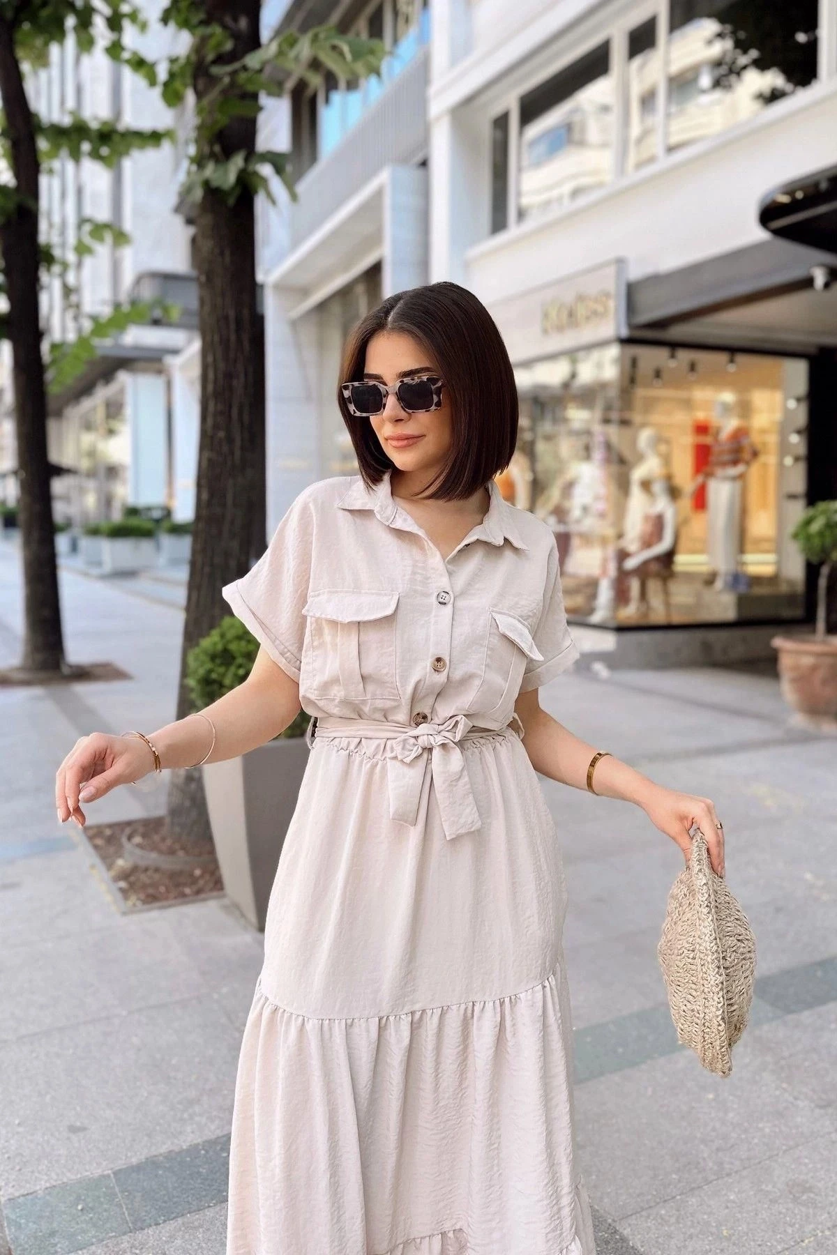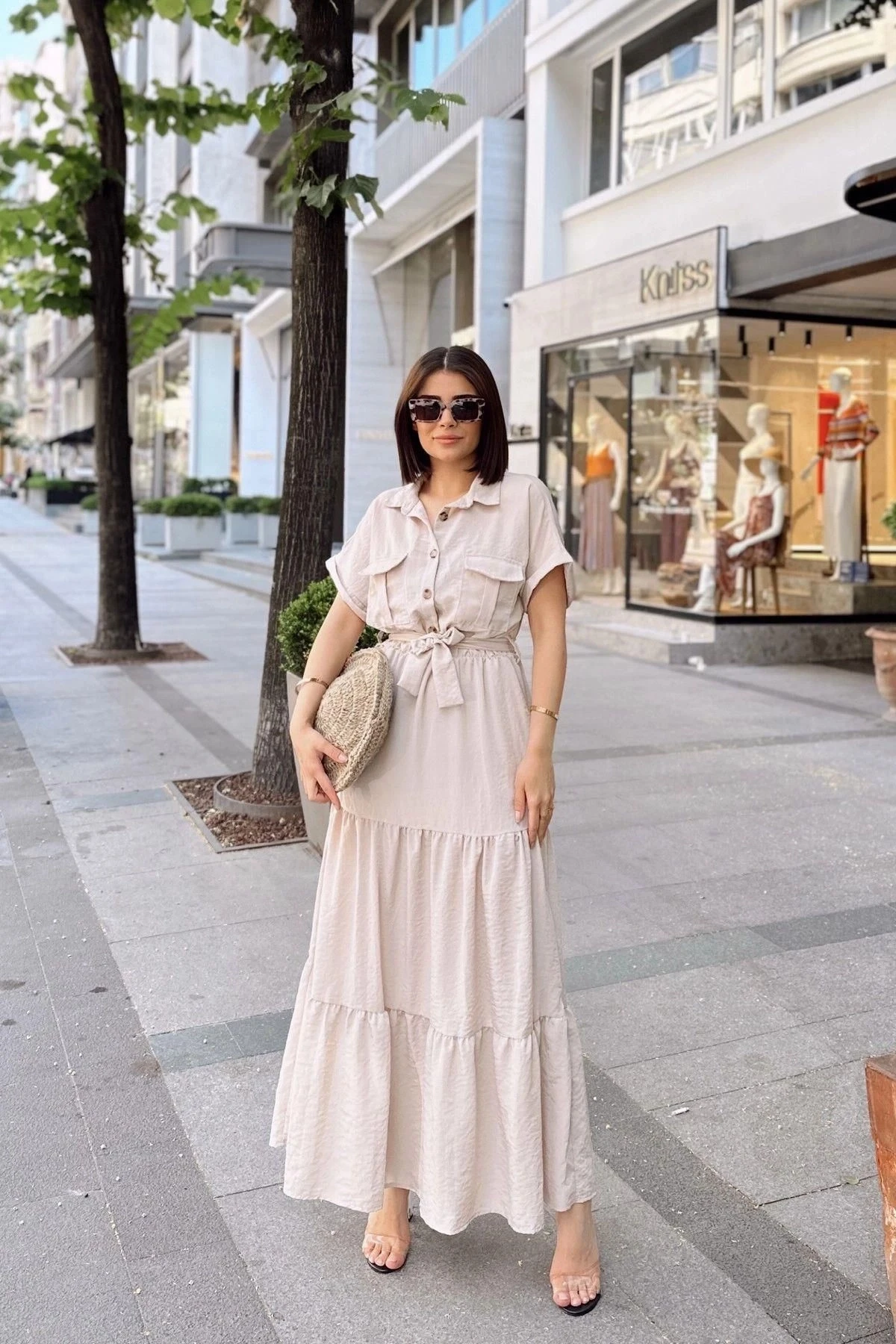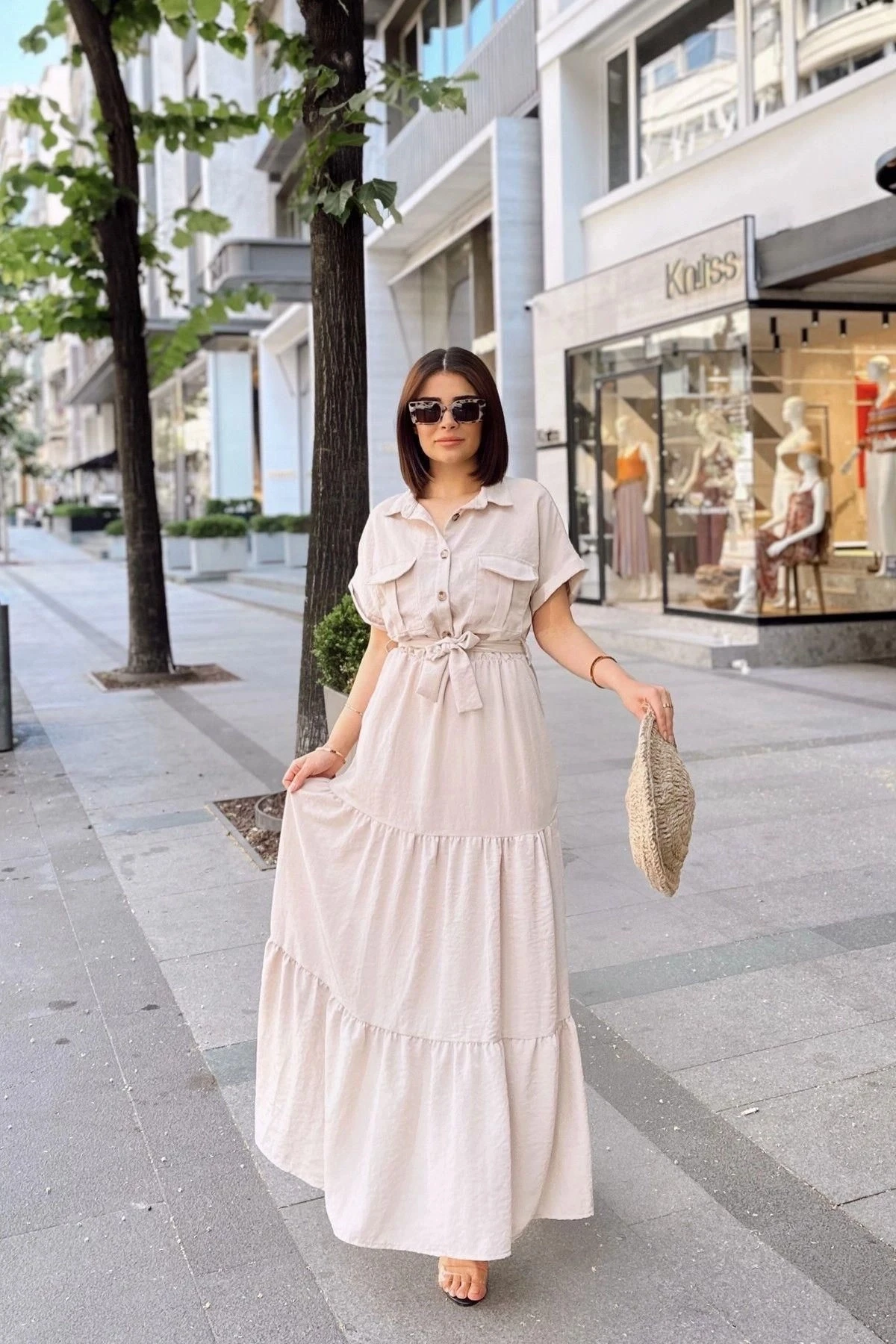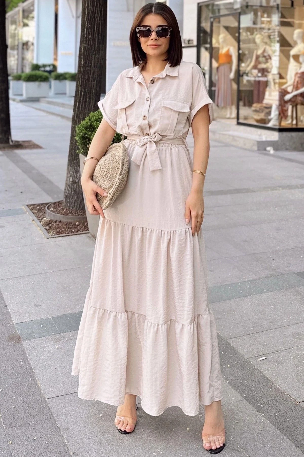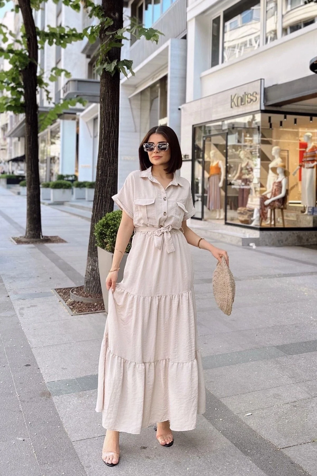 Bej Kısa Kol, Airobin Kumaşlı Maxi Uzun Elbise, hem şıklığı hem de rahatlığı bir arada sunuyor.; Bu elbise, %60 pamuk ve %40 polyester karışımı kumaş kullanılarak özenle tasarlanmıştır.; Kumaş seçimi, elbisenin konfor ve dayanıklılık sağlamasını hedefler.; %60 pamuk ve %40 polyester karışımı kumaş, yumuşak bir dokuya sahiptir ve aynı zamanda dayanıklı bir yapıya sahiptir.; Airobin kumaşın kullanımı, elbiseye hafiflik ve nefes alabilirlik özelliği kazandırır.; Bej renk seçimi, elbiseye sakin ve doğal bir görünüm sağlar.; Kısa kol detayı, elbiseye ferahlık ve yaz havası katar.; Yarım patlı tasarımı, elbiseye özgün bir dokunuş ekler ve tarzınızı tamamlar.; Kemerli/kuşaklı özelliği, elbiseye beli vurgulayan bir detay katarken aynı zamanda şekil verme imkanı sağlar.; Eteği pliseli tasarımı, elbiseye hareketlilik ve zarafet kazandırır.; Pliseler, elbiseye dinamik bir görünüm ve özgün bir tarz katarken aynı zamanda hareket özgürlüğü sunar.; Cepli detaylar, elbisenin pratik kullanımını artırırken şıklığını da korur.; Bu detaylar, elbiseye işlevsellik kazandırır ve kullanışlı bir parça haline getirir.; Bej Kısa Kol, Airobin Kumaşlı Maxi Uzun Elbise, hem günlük hayatta hem de özel etkinliklerde şıklık ve rahatlık sunan bir seçenektir.; Doğal kumaşı ve özgün tasarımıyla, gardırobunuzun vazgeçilmez bir parçası olacak.; Kendinizi özel hissetmek ve tarzınızı ön plana çıkarmak için bu elbiseyi tercih edebilirsiniz.