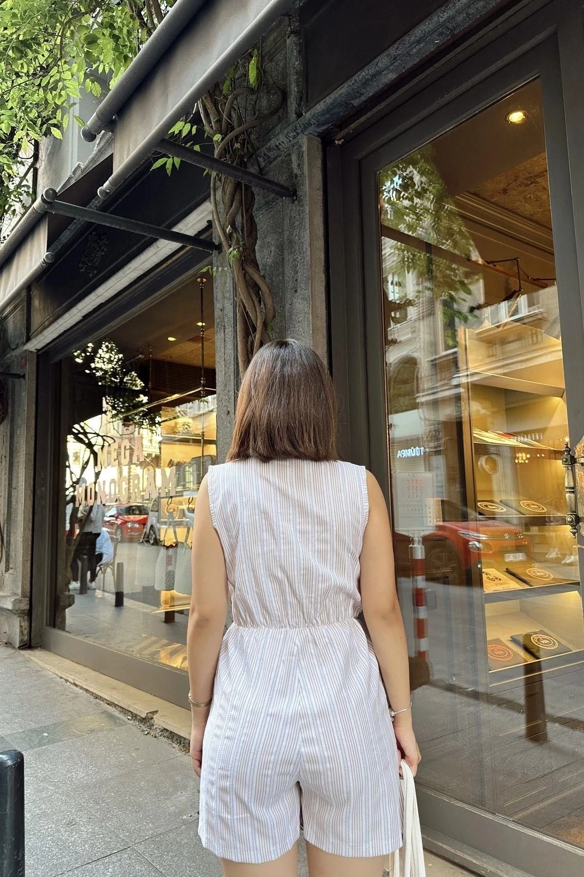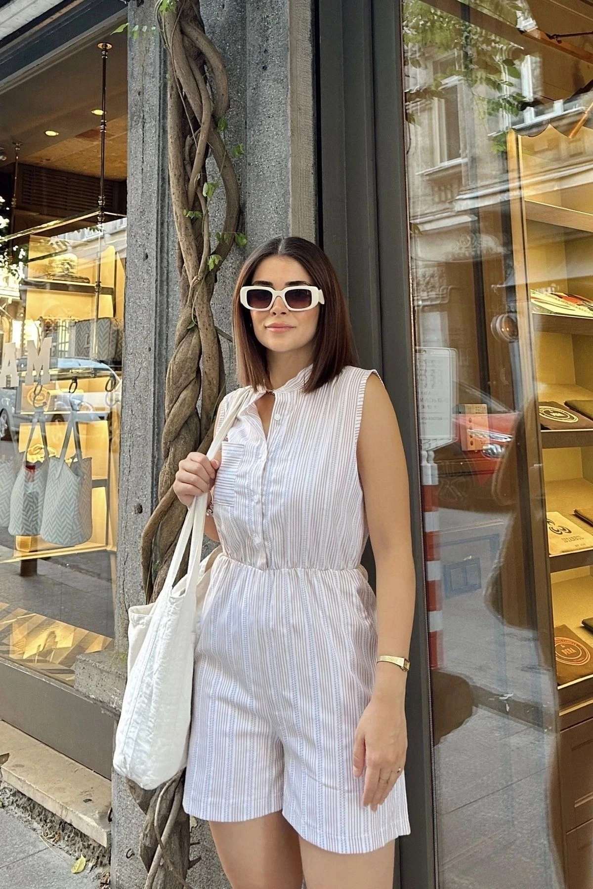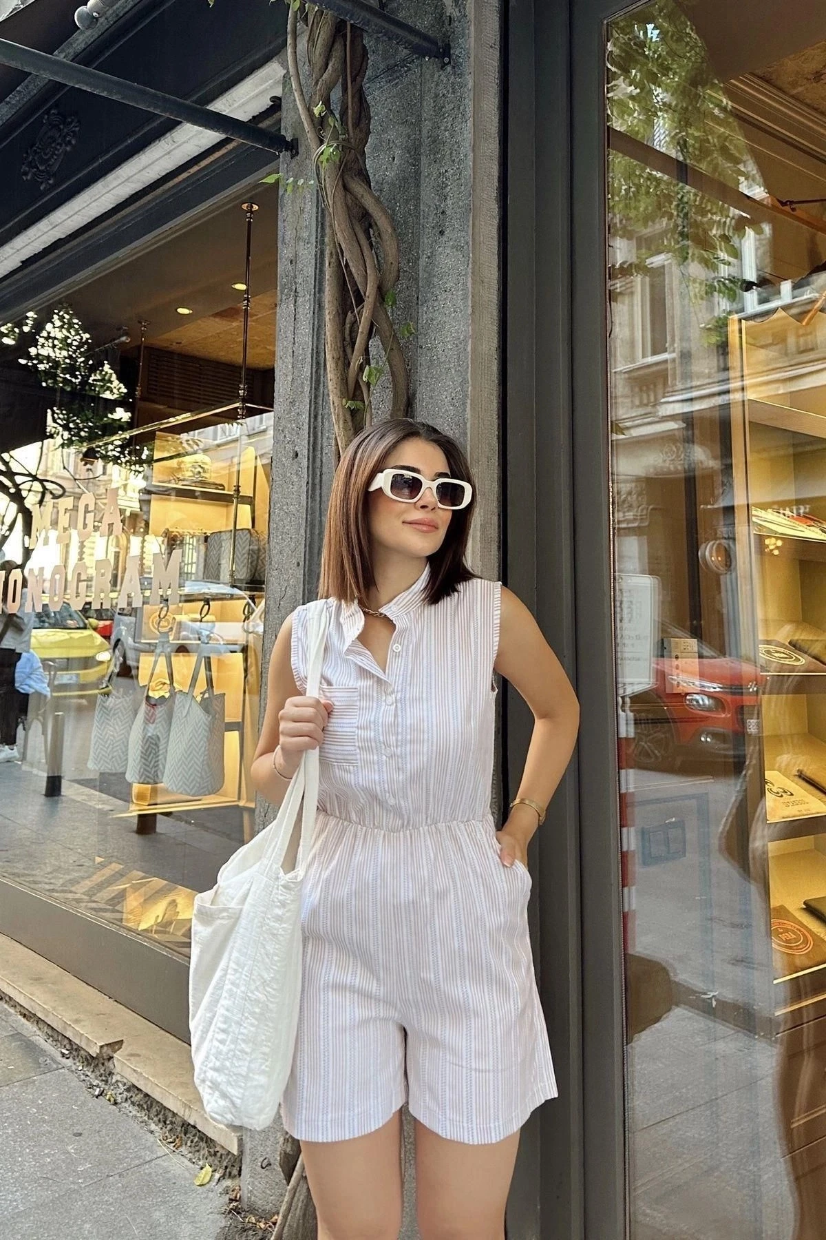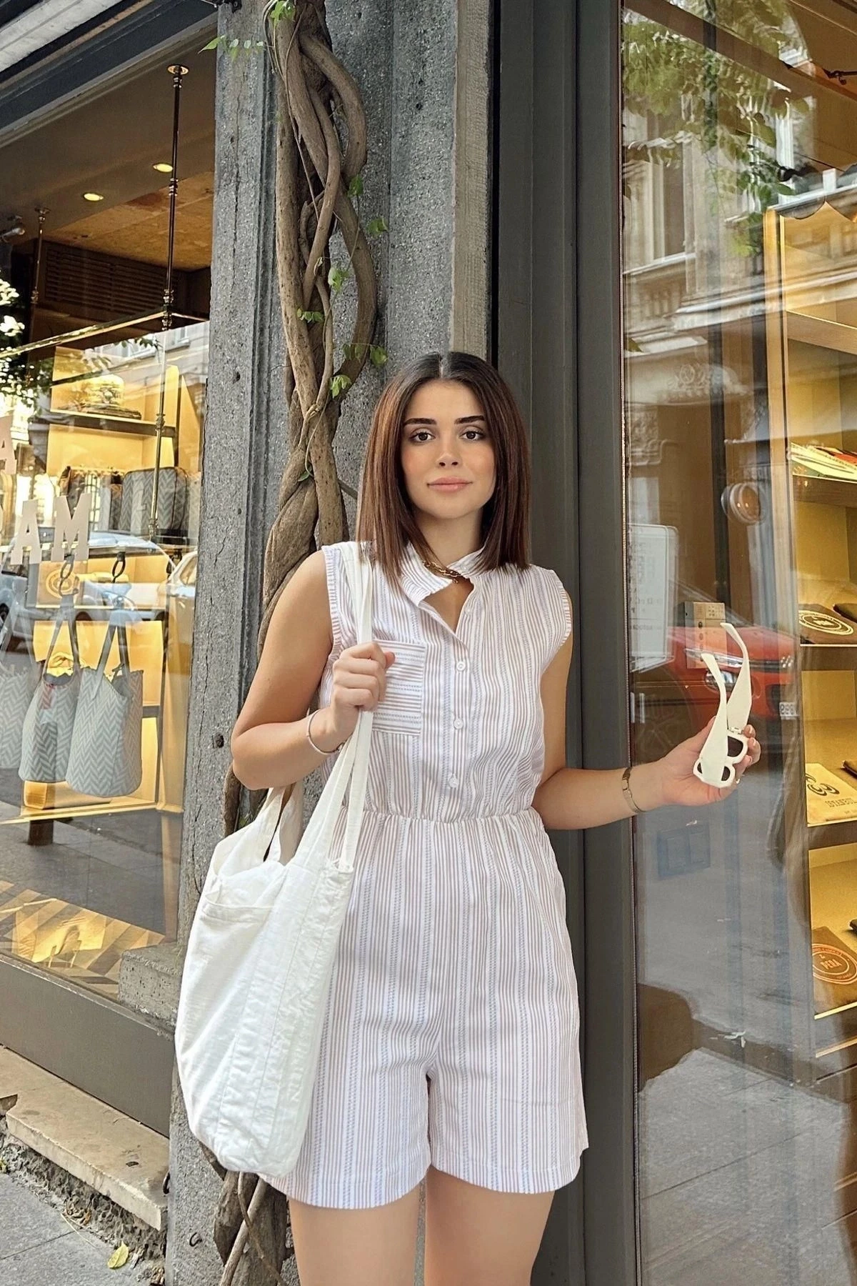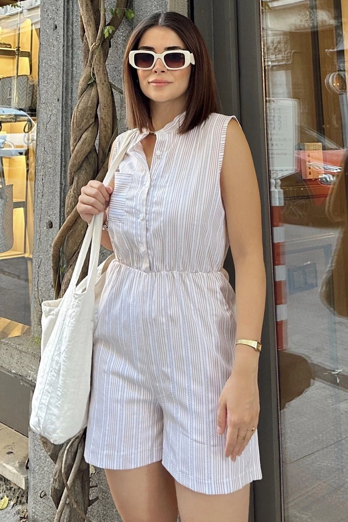 Bej Kolsuz, Düğmeli Hakim Yaka, Beli Lastikli, Cepli, Şort Modelli Kısa Çizgili Tulum