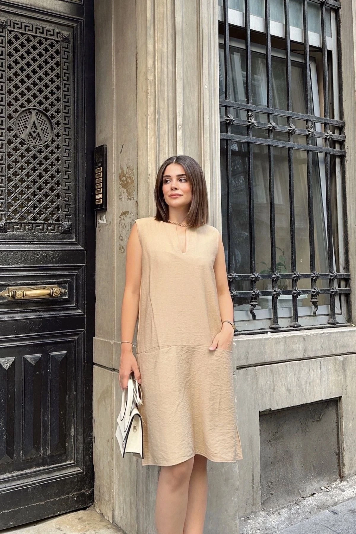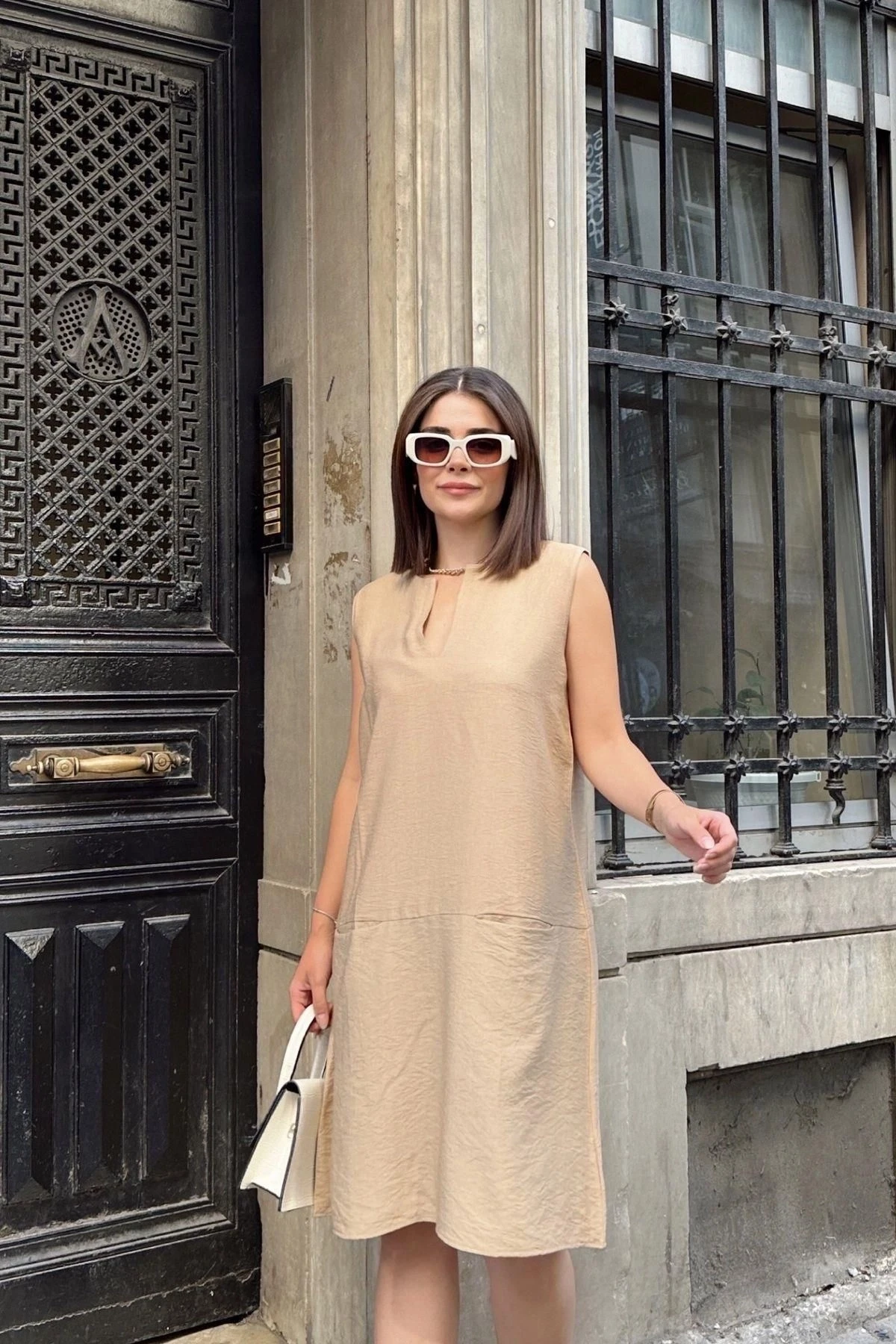 Bej Kolsuz Yakası Yırtmaçlı, Gizli Çift Cepli, A Kesim Rahat Midi Elbise