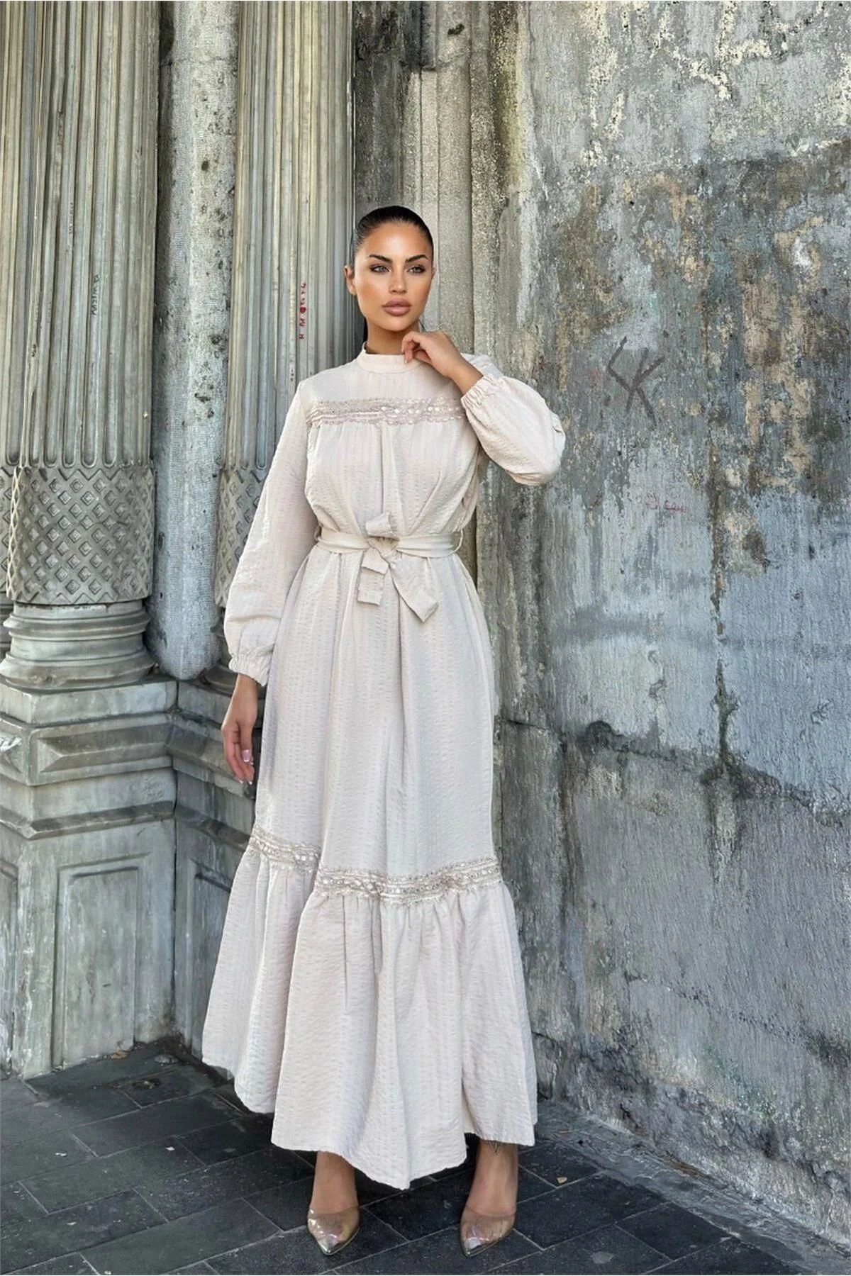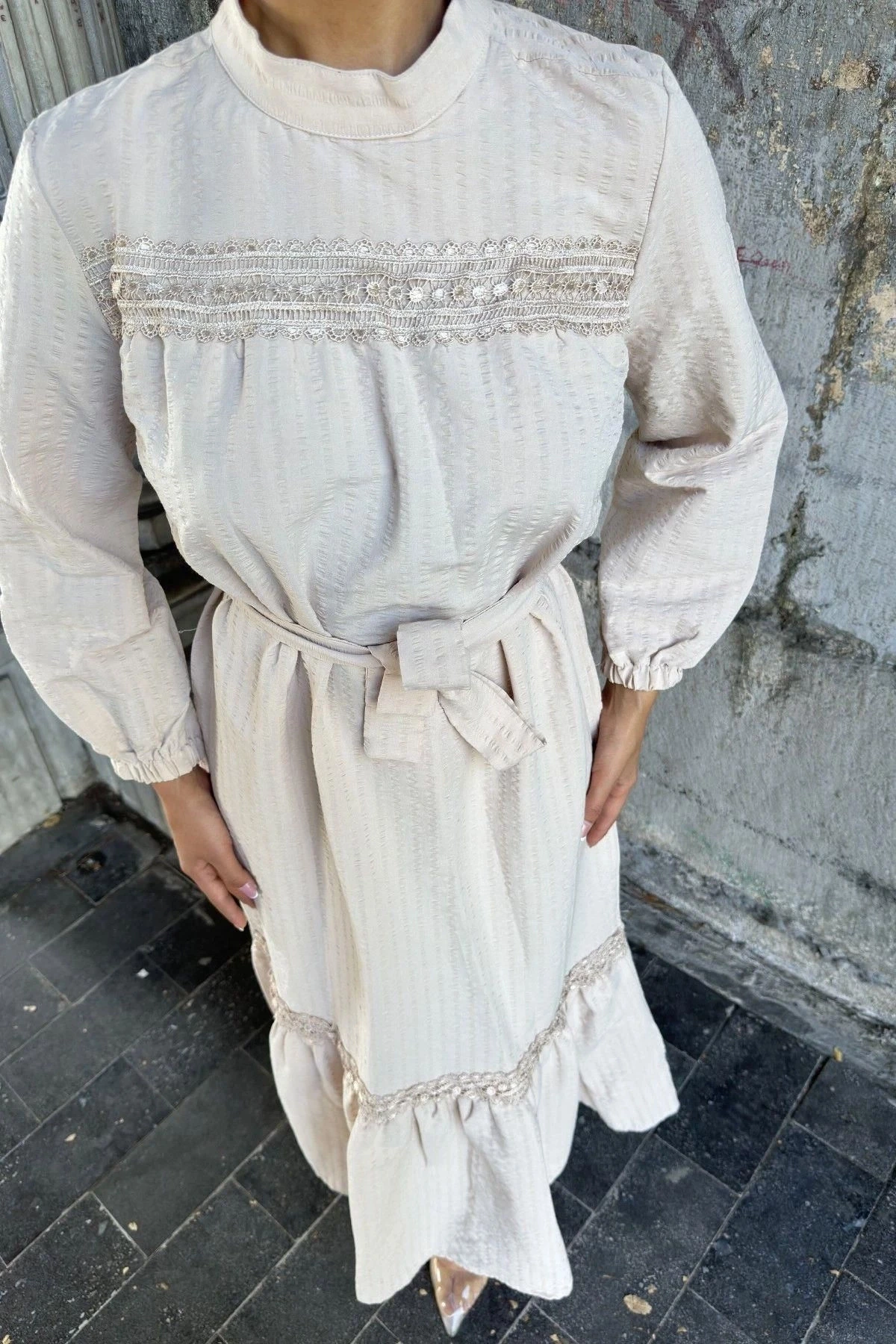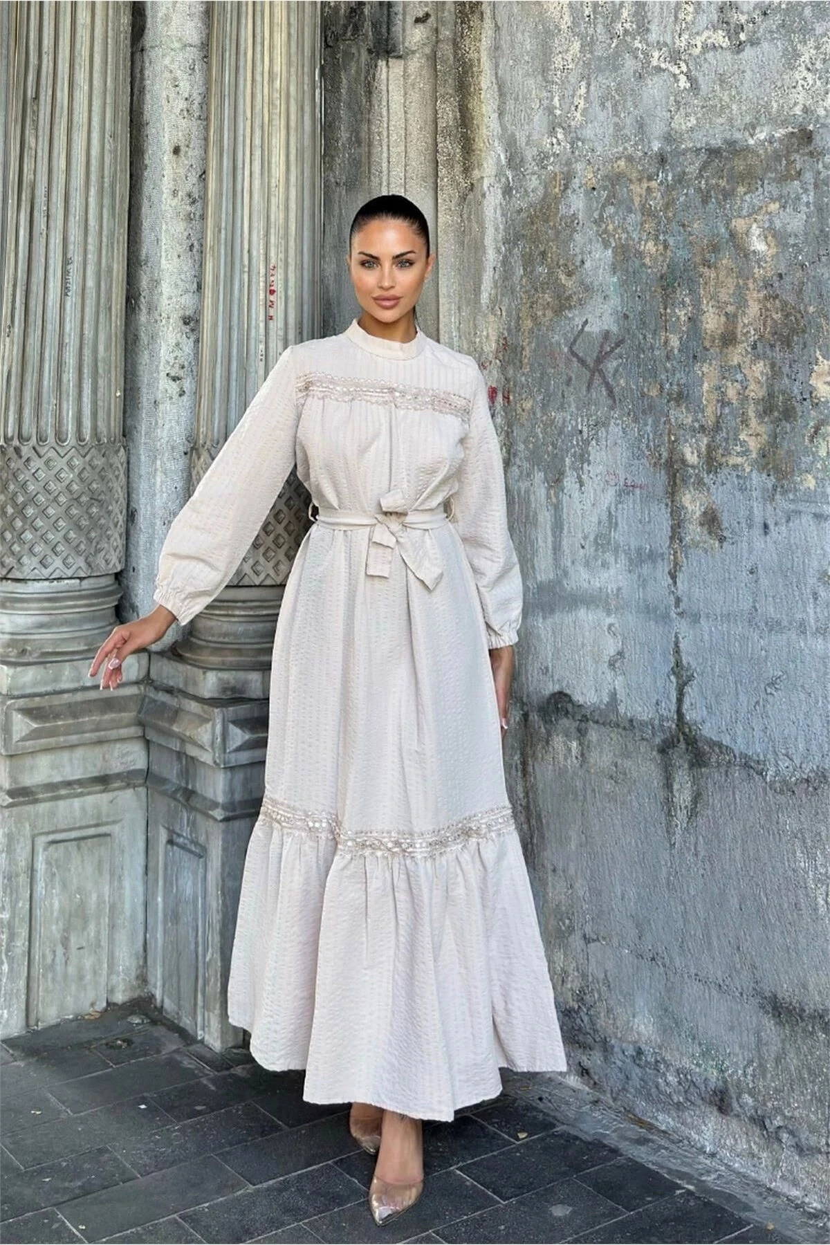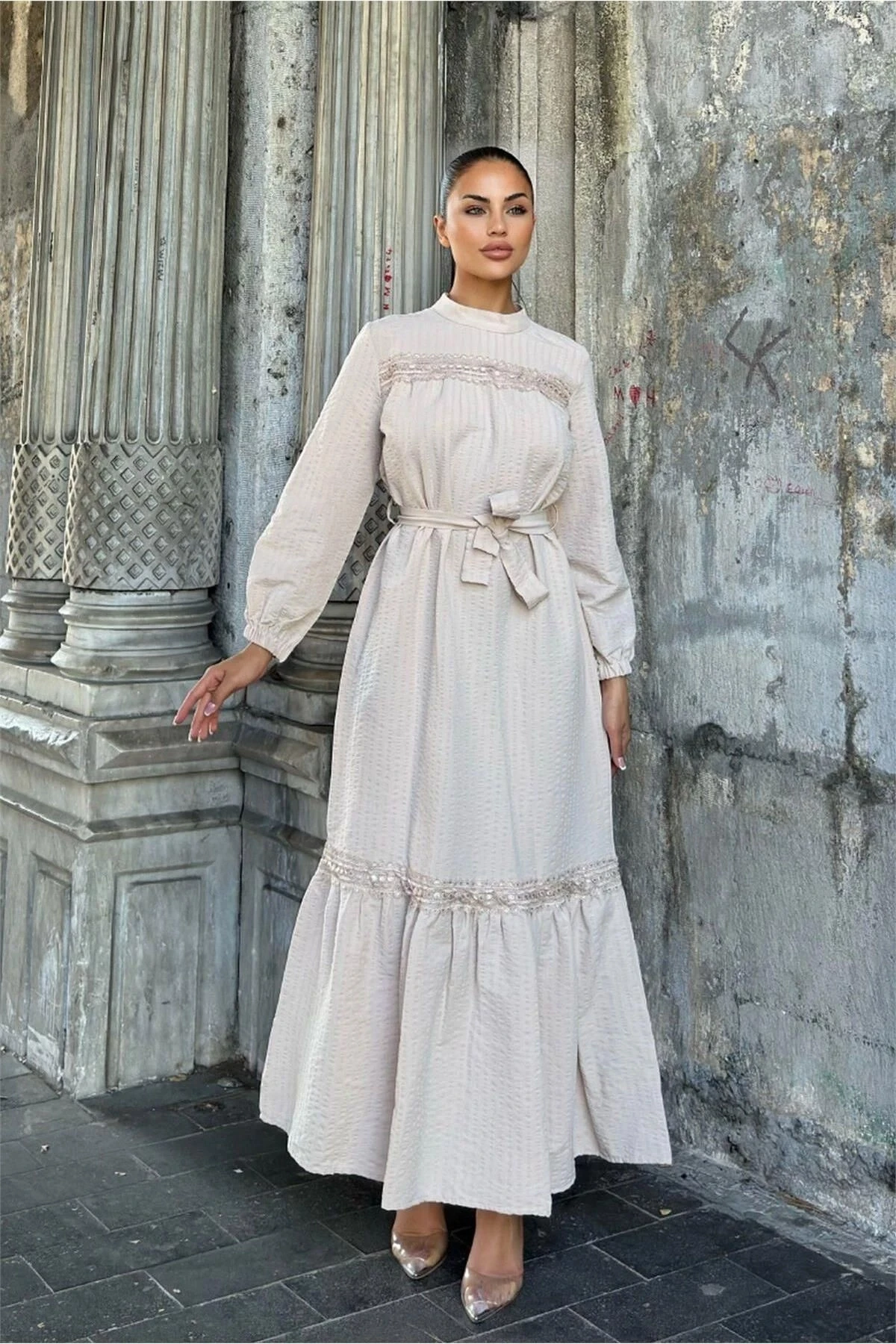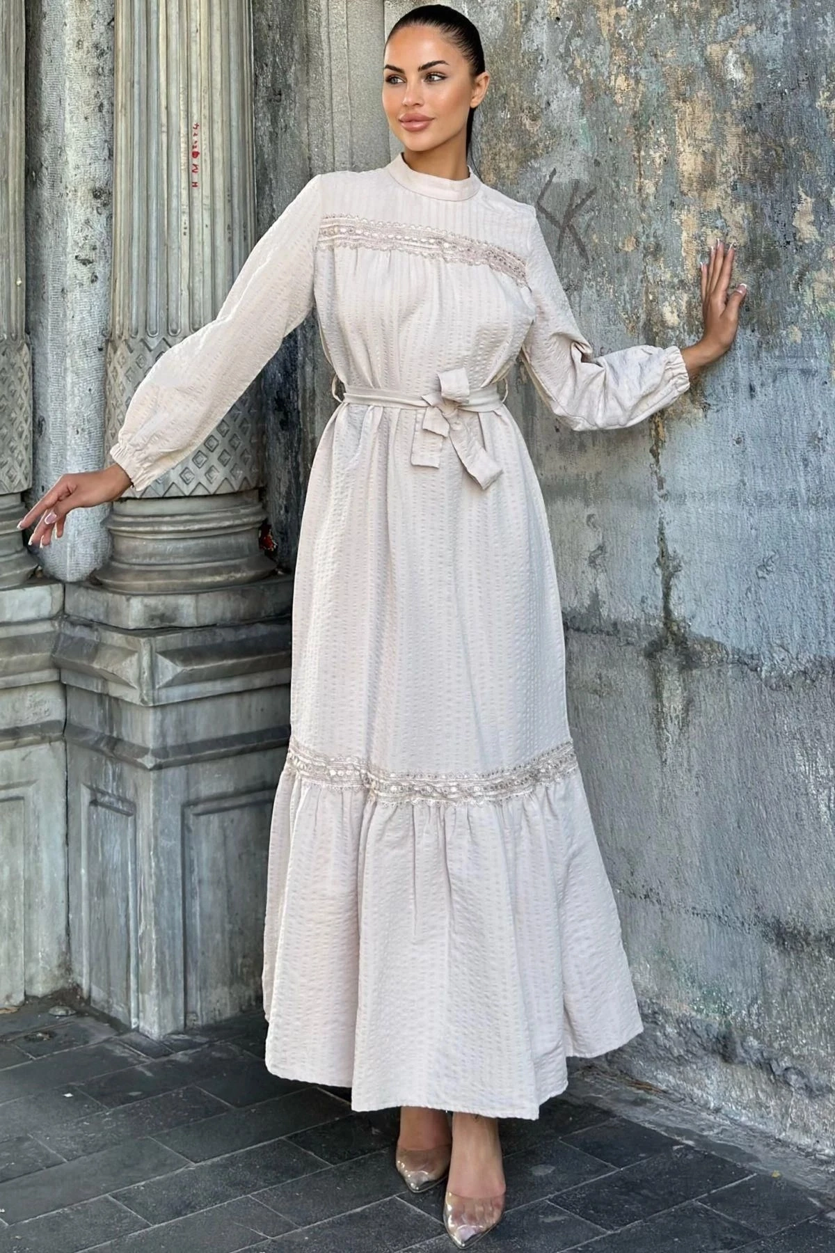 Bej Kuşaklı, Dantel Detaylı, Maksi Lotus Elbise