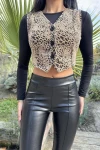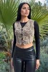 Bej Leopar Desen, Arkası Deri, Önü Örme Kısa Yelek
