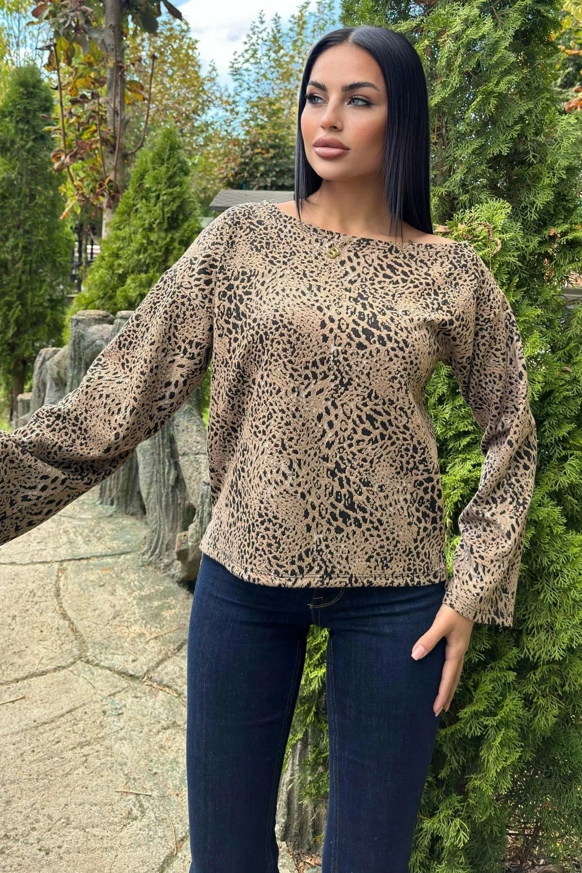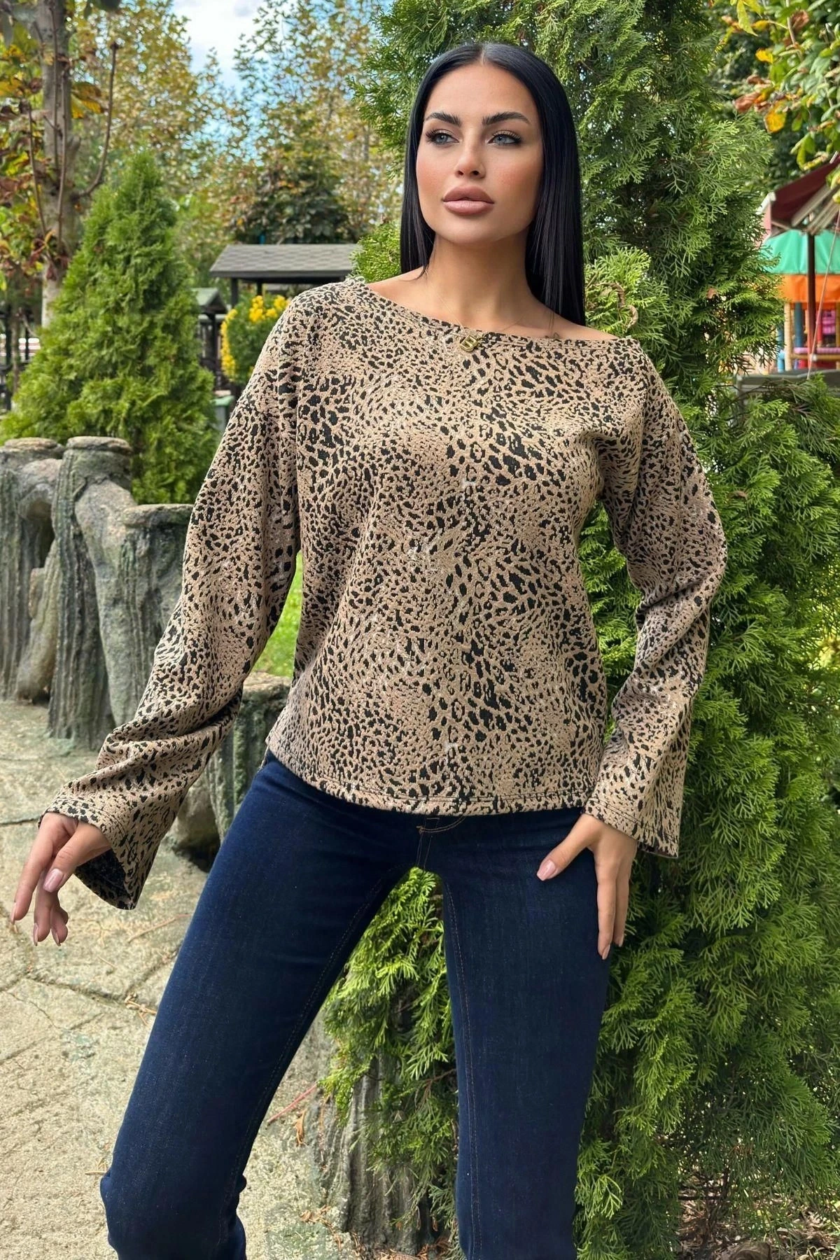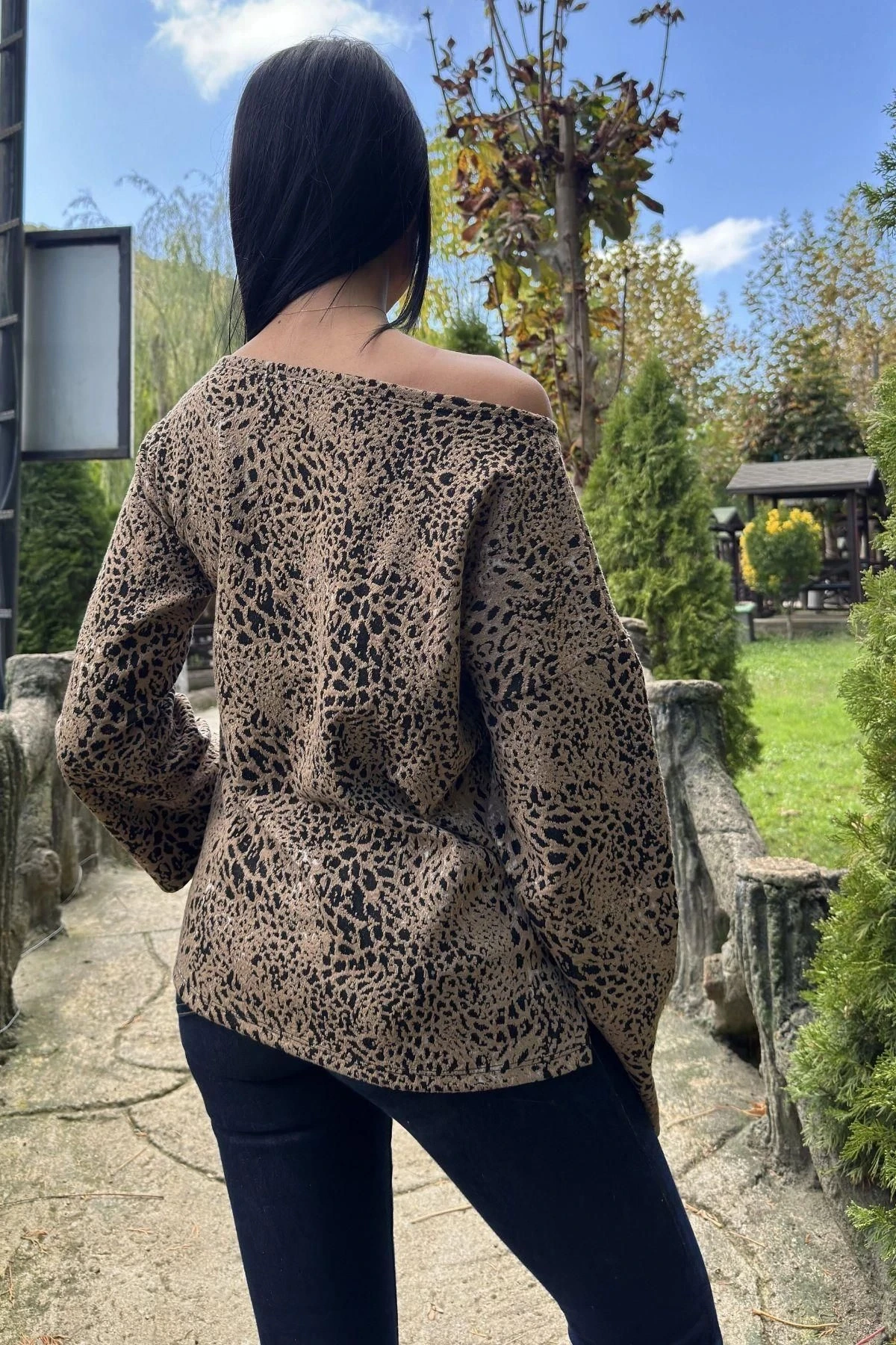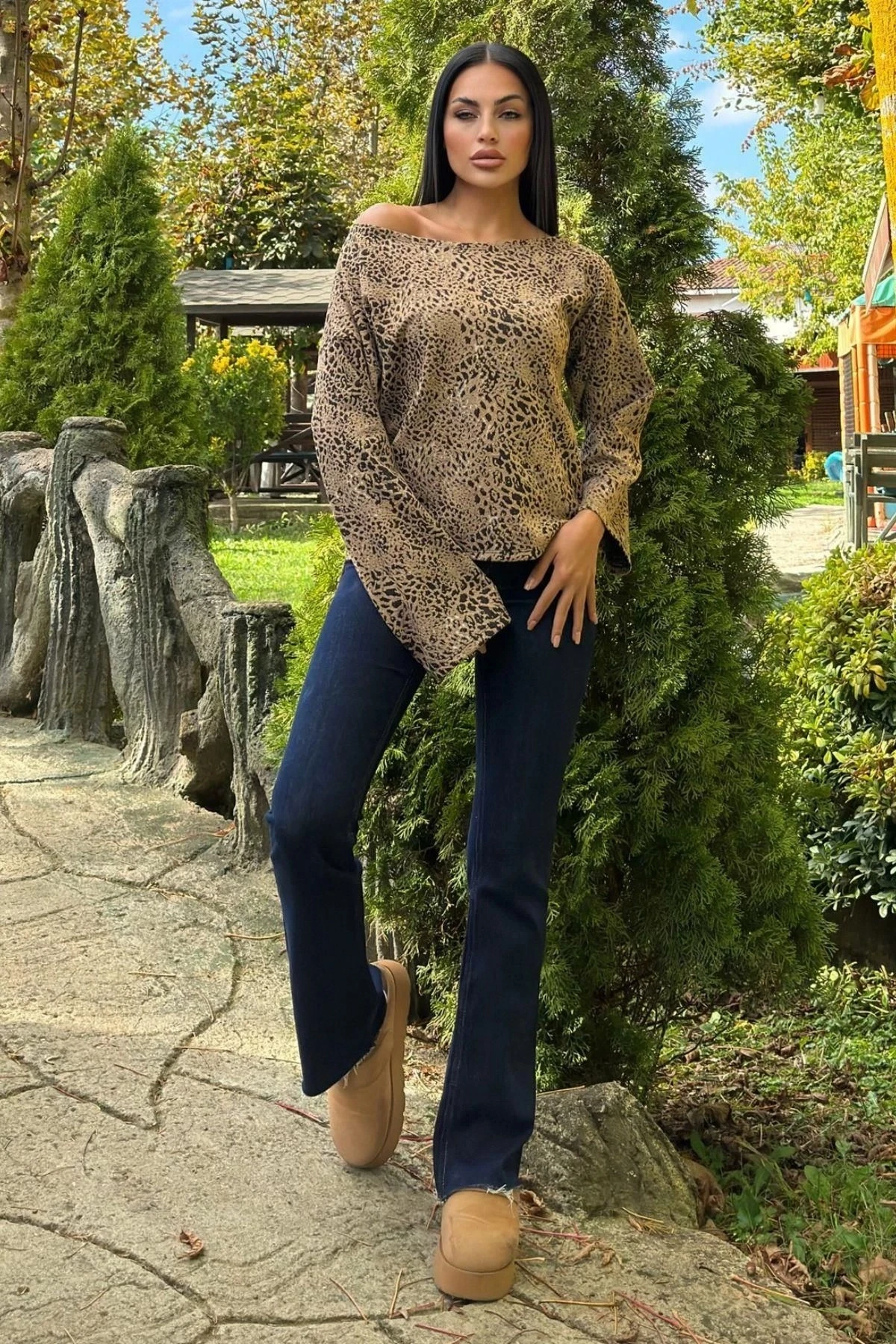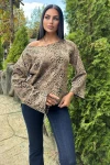 Bej Leopar Desen, Geniş Yaka, Salaş Örme Bluz