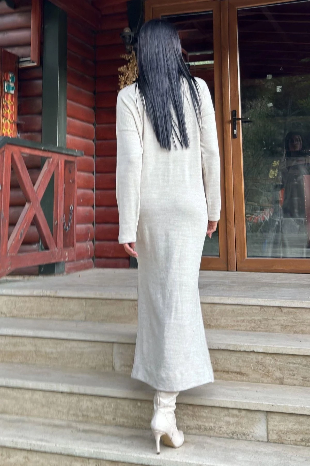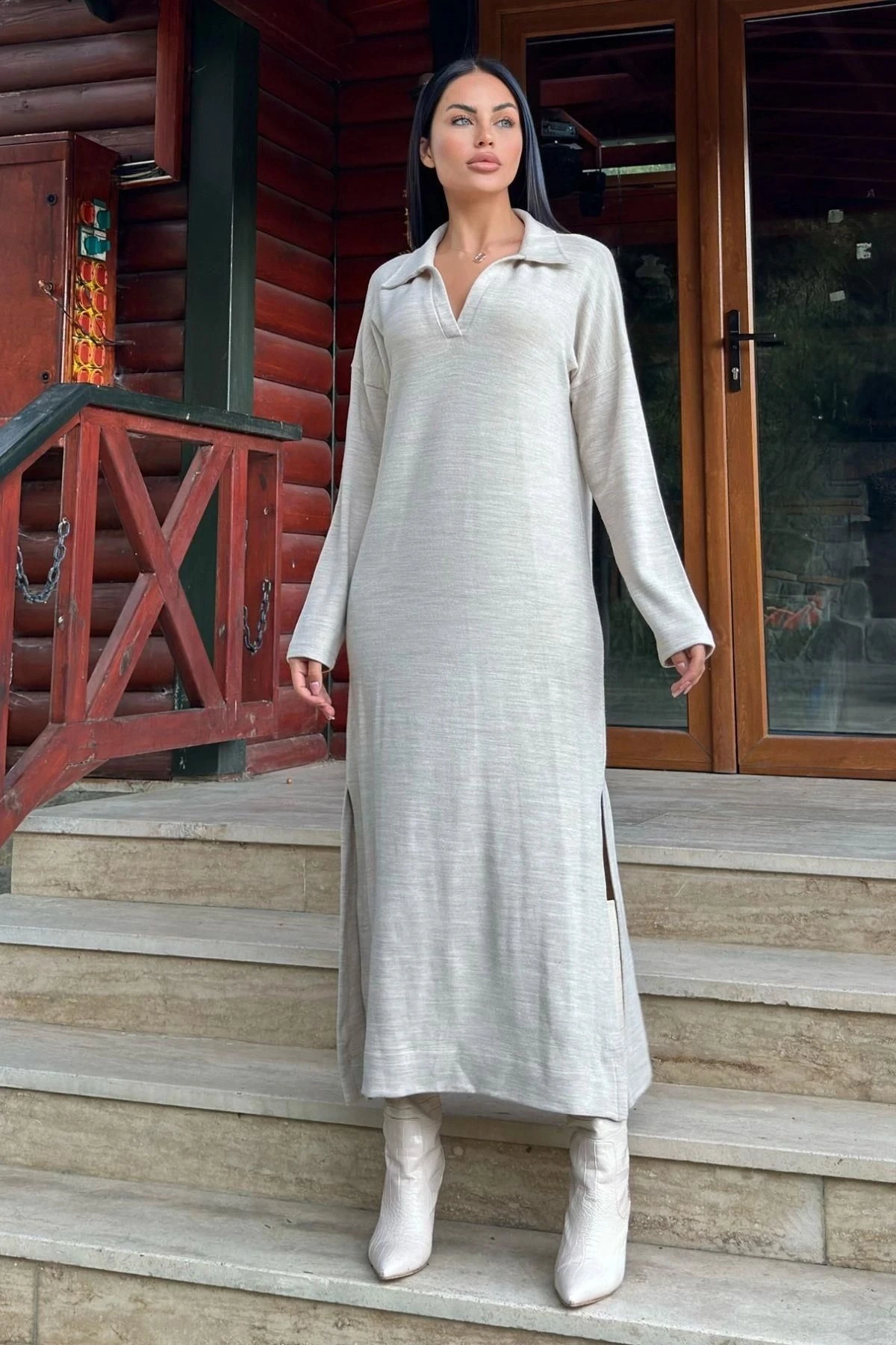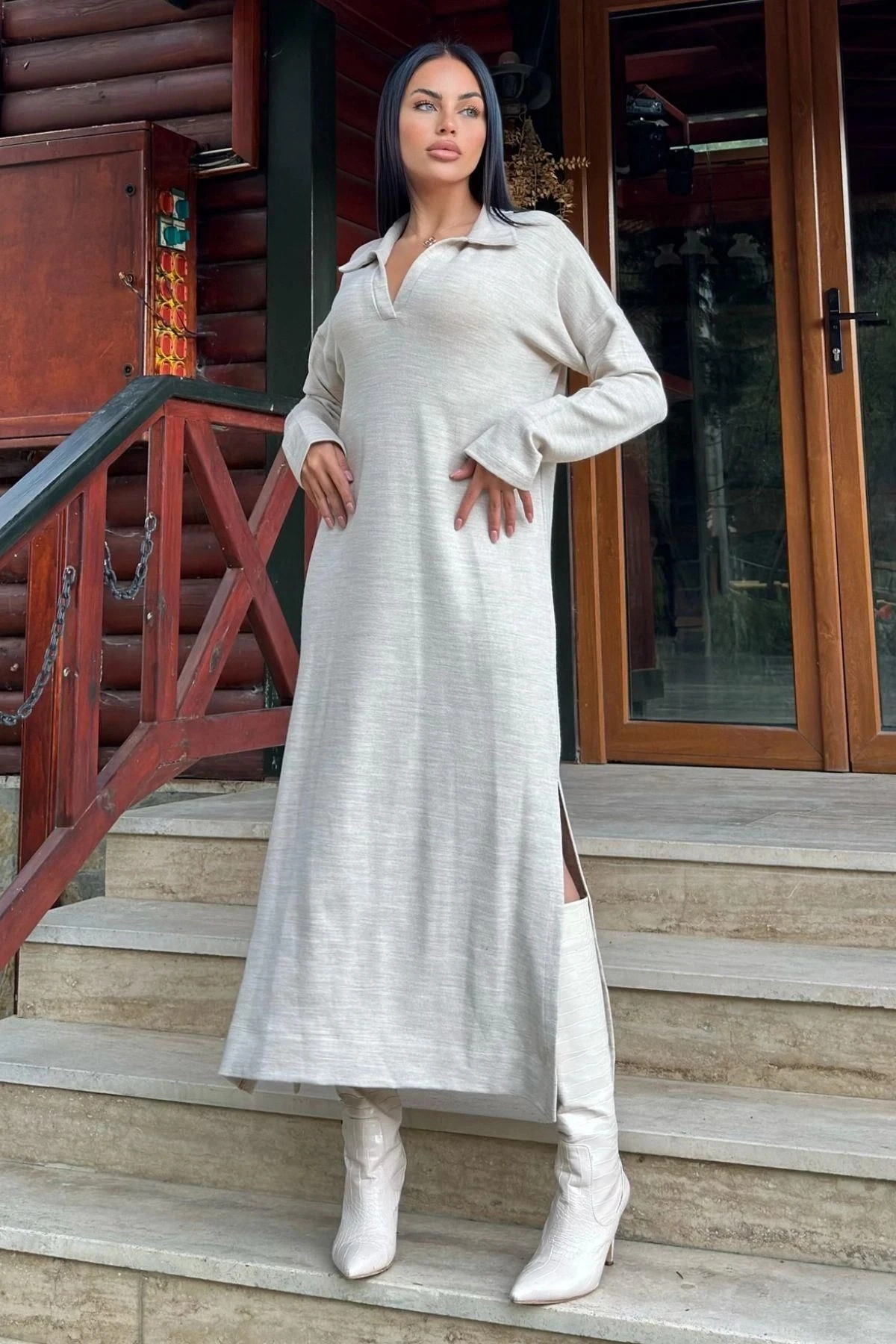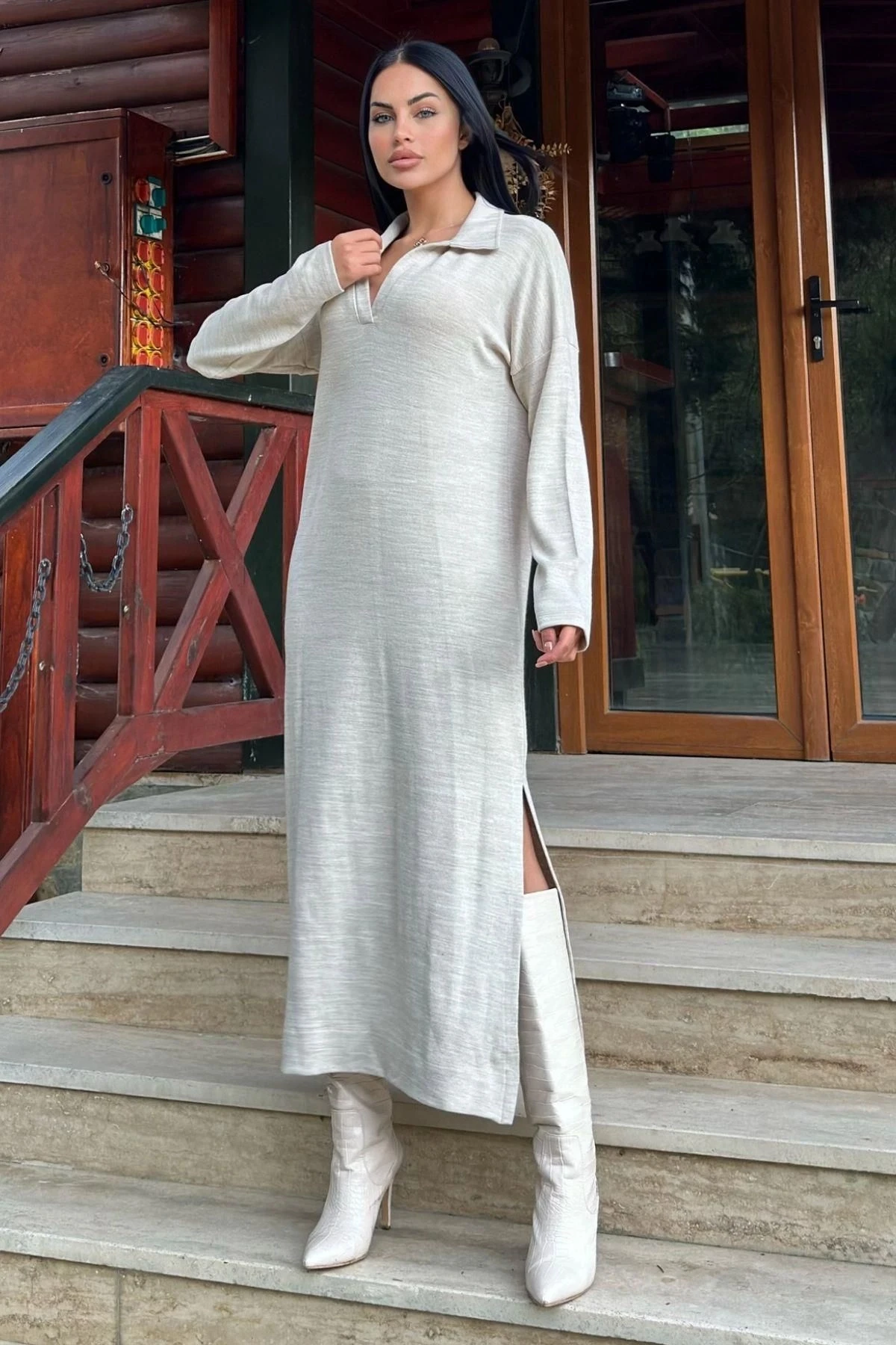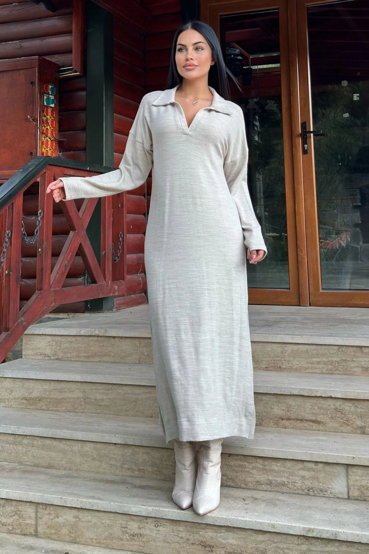 Bej Polo Yaka, Uzun Kol, Yırtmaçlı, Salaş, Akrilik Örme Uzun Elbise