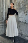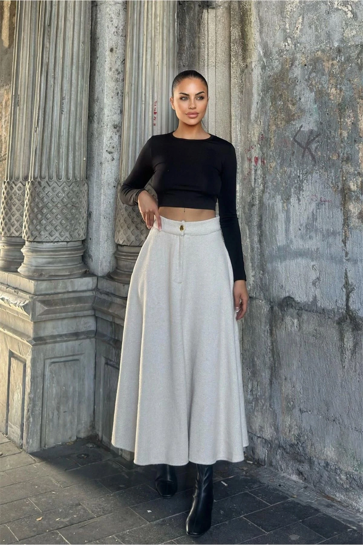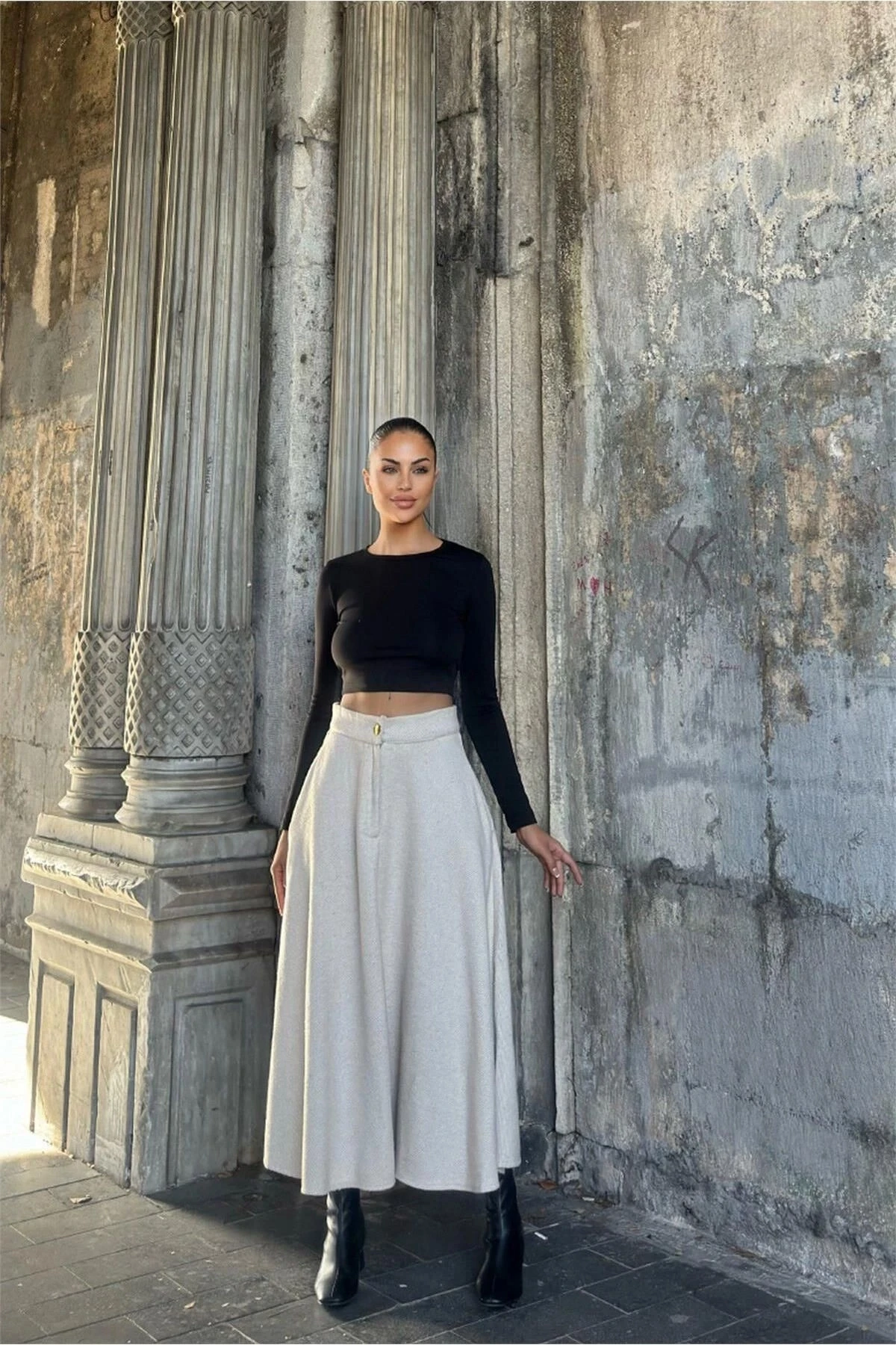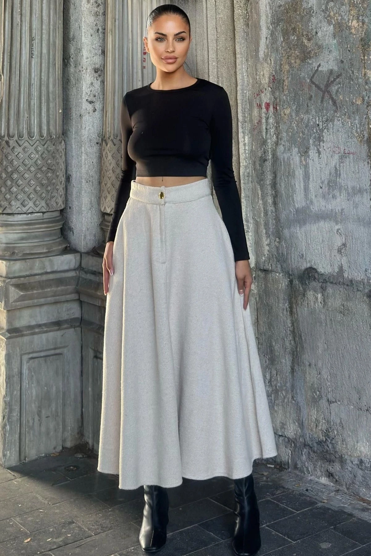 Bej Yüksek Bel, Cepli, Kiloş Kesim, Pötikare Örme Kaşe Uzun Etek