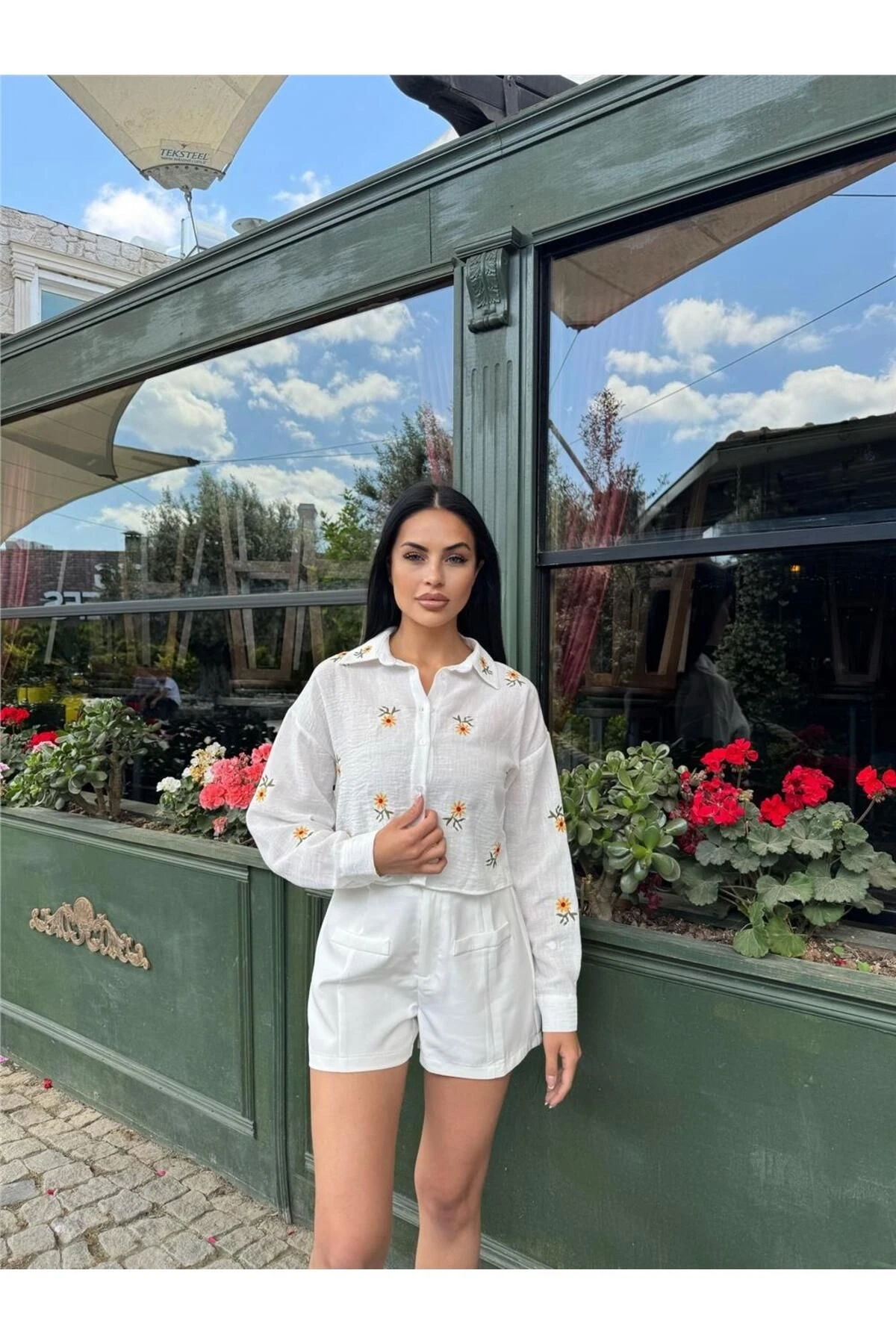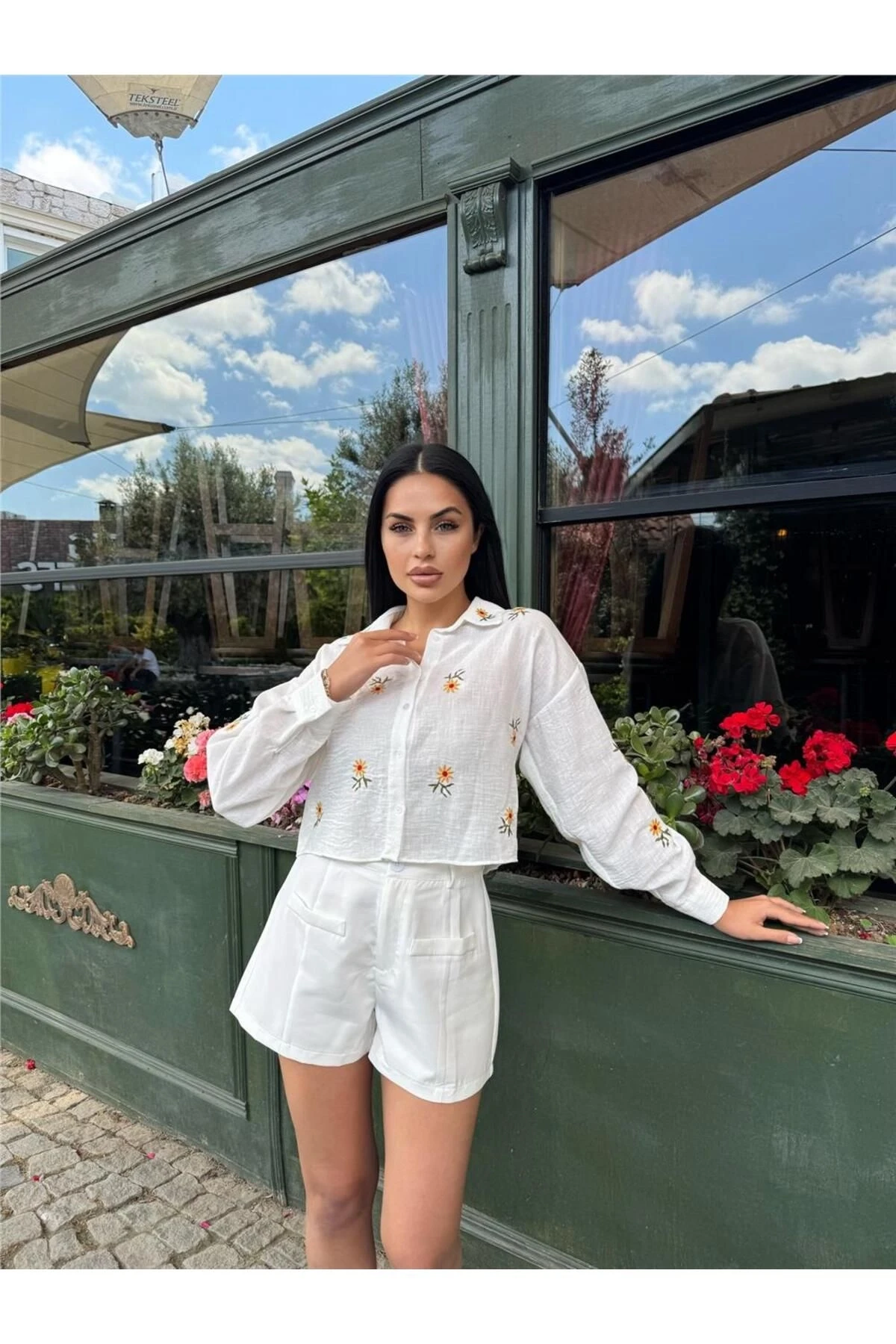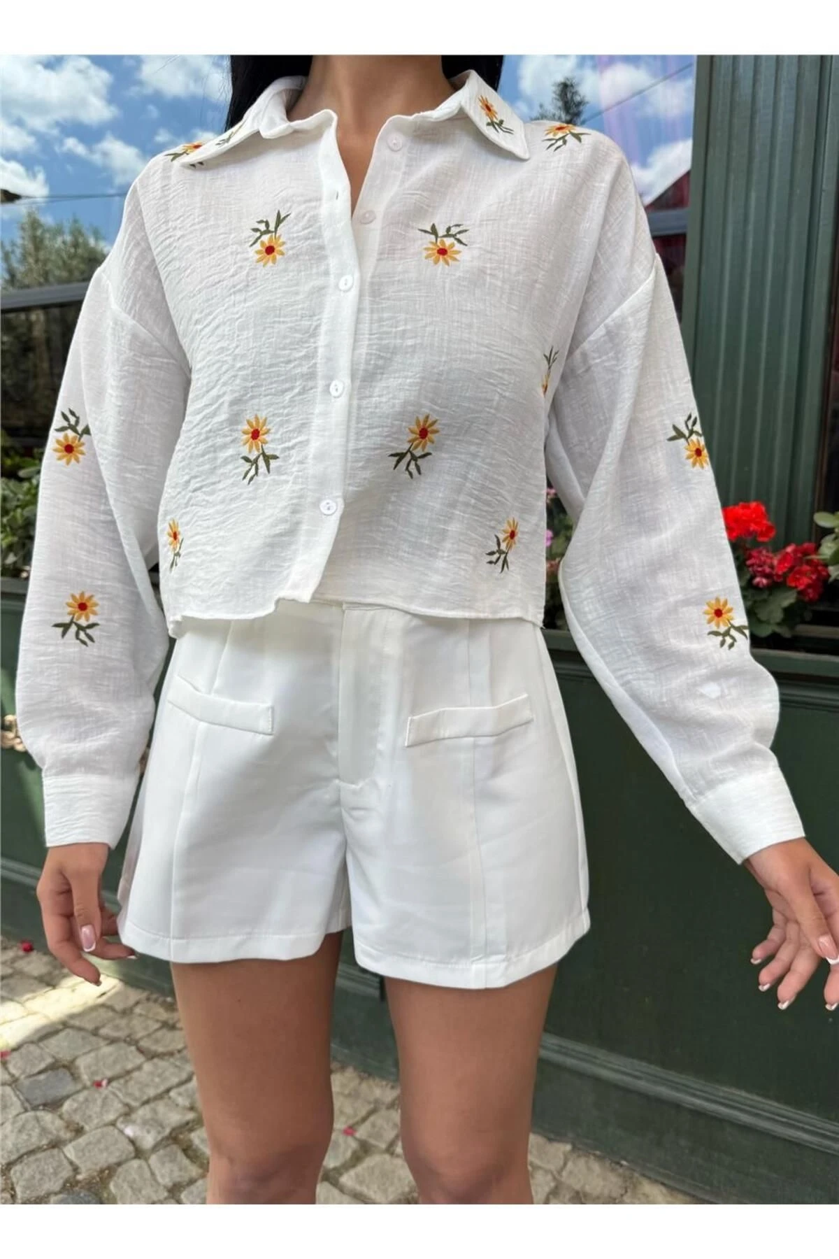 Beyaz Çiçek Nakışlı Kısa Kol Gömlek