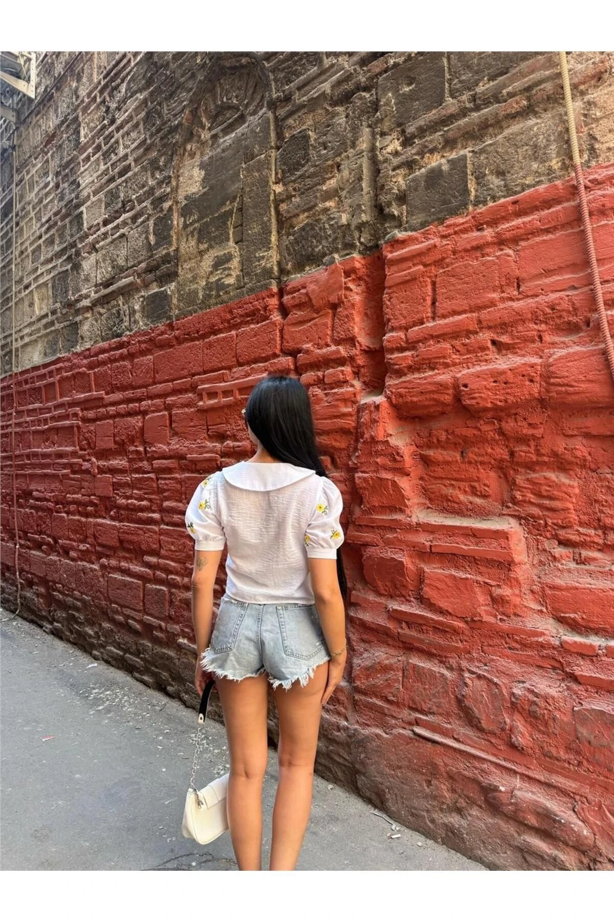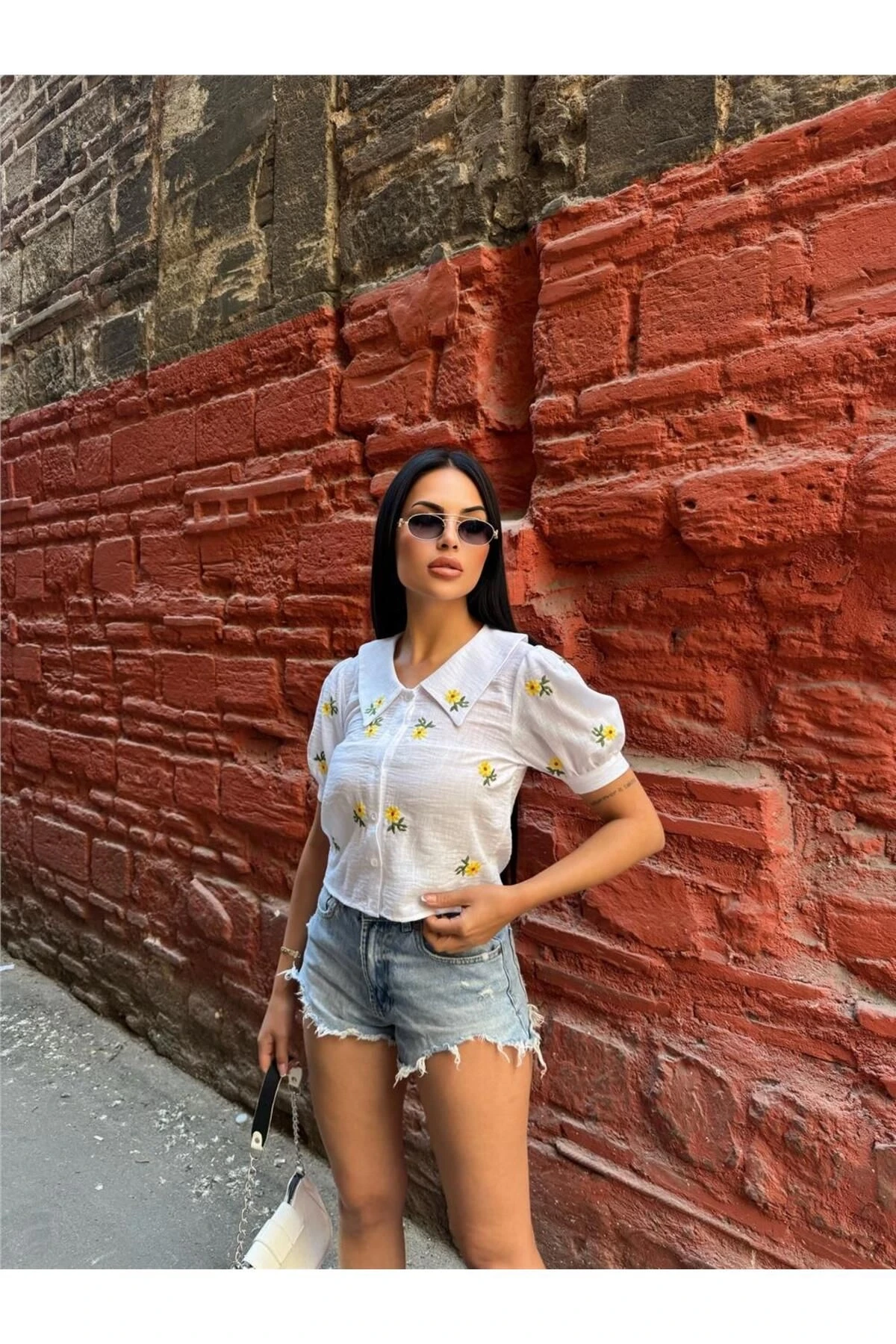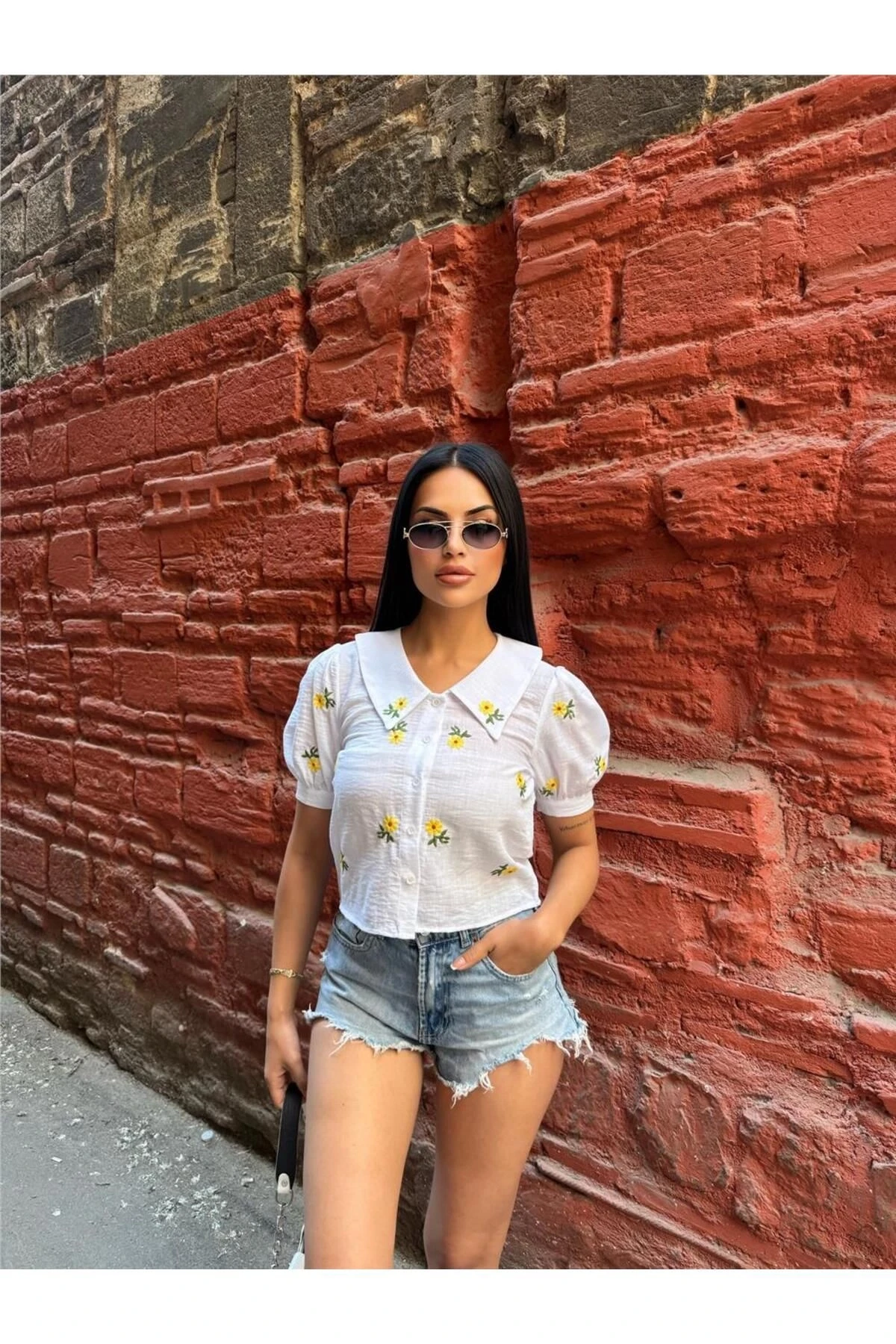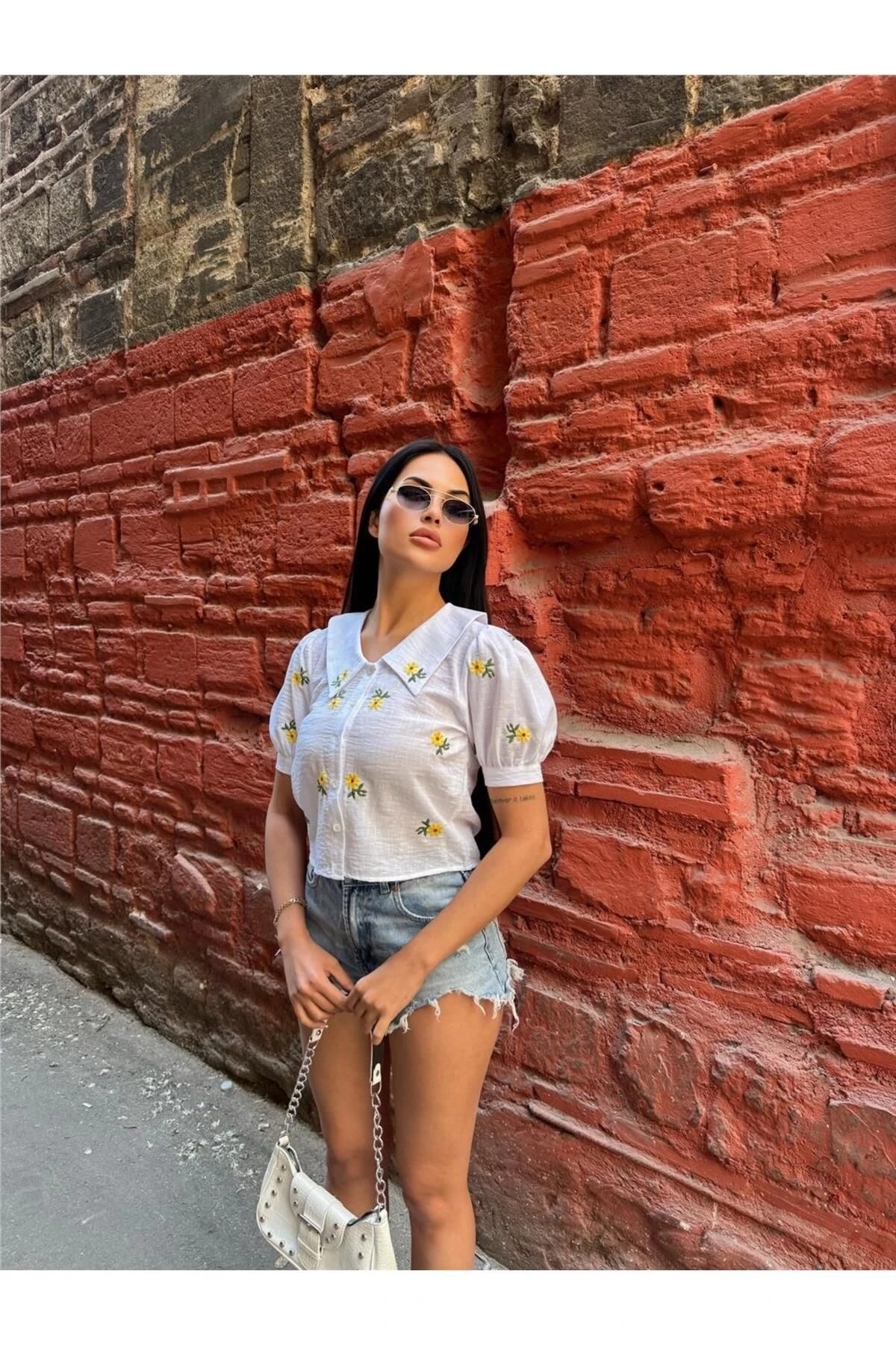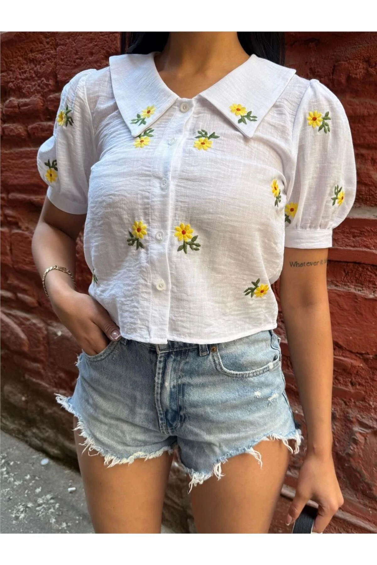Beyaz Çiçek Nakışlı Kısa Kollu Gömlek