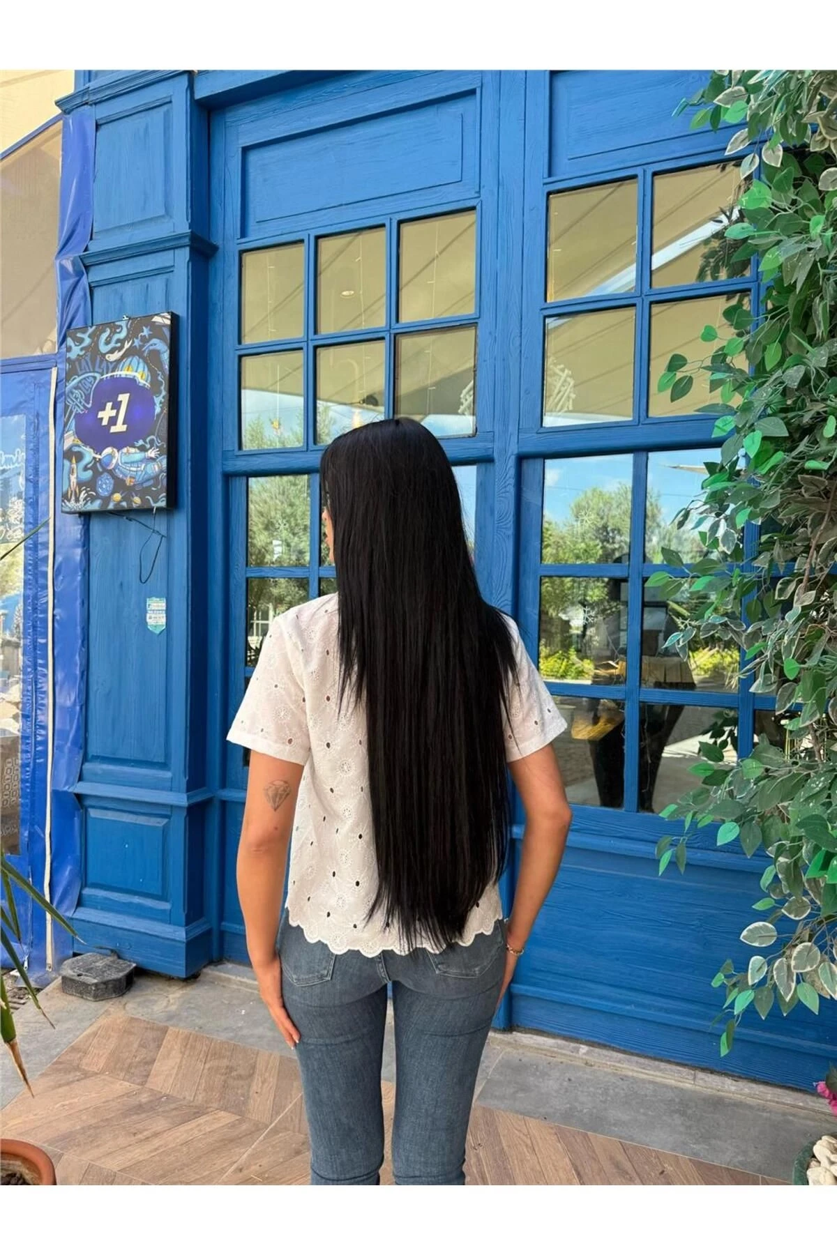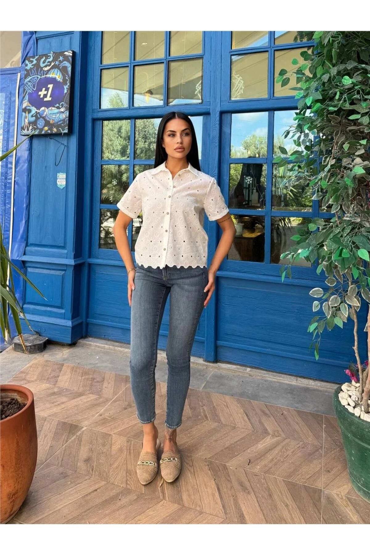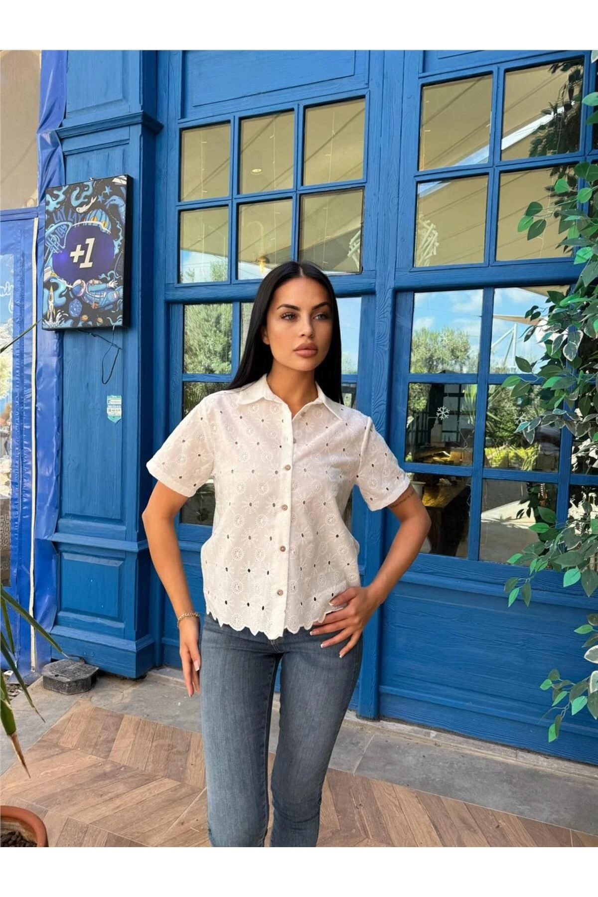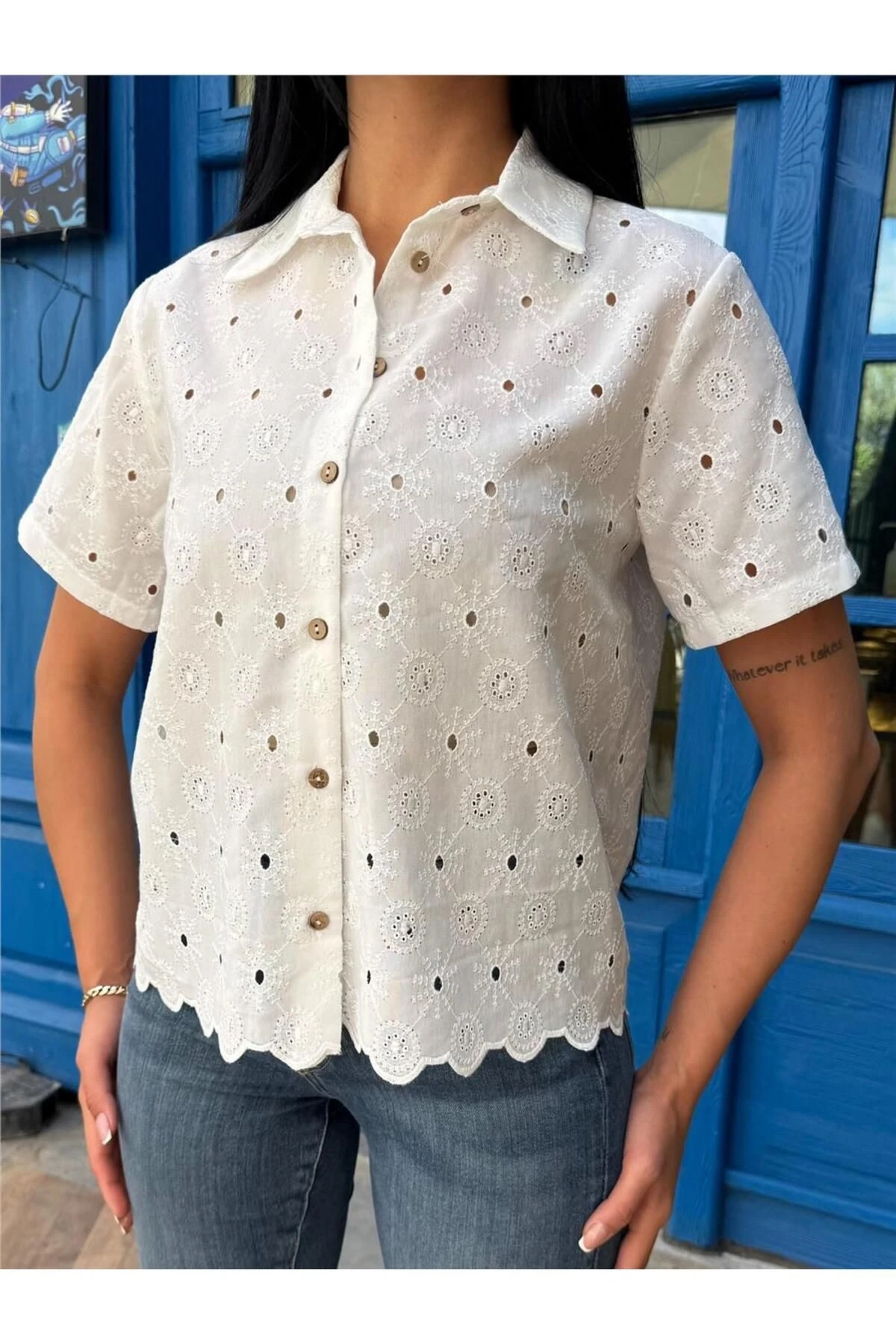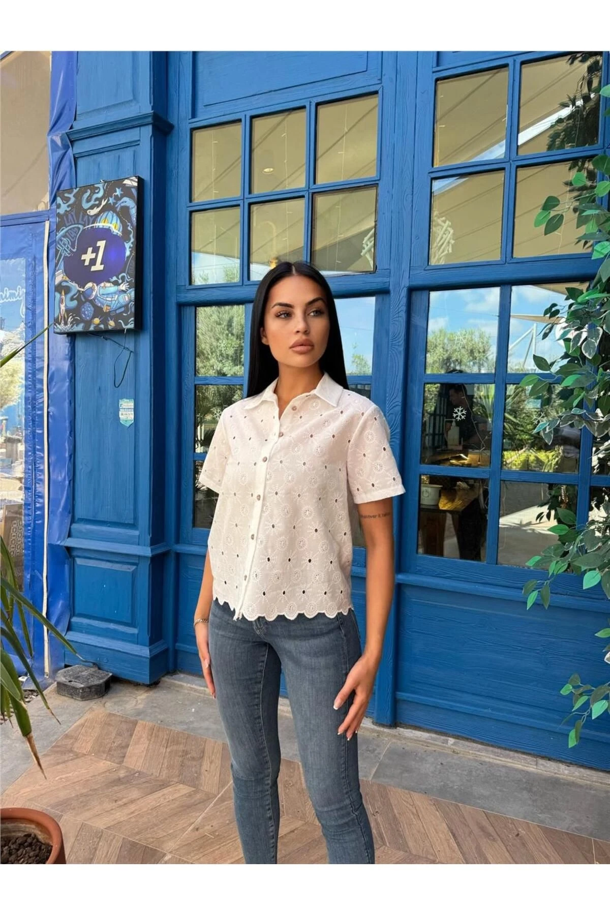 Beyaz Delikli Nakışlı Dantel Gömlek