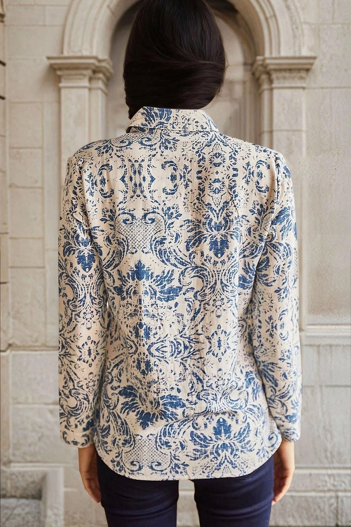 Beyaz Etnik Desenli, Klasik Kesim, Uzun Kollu Gömlek