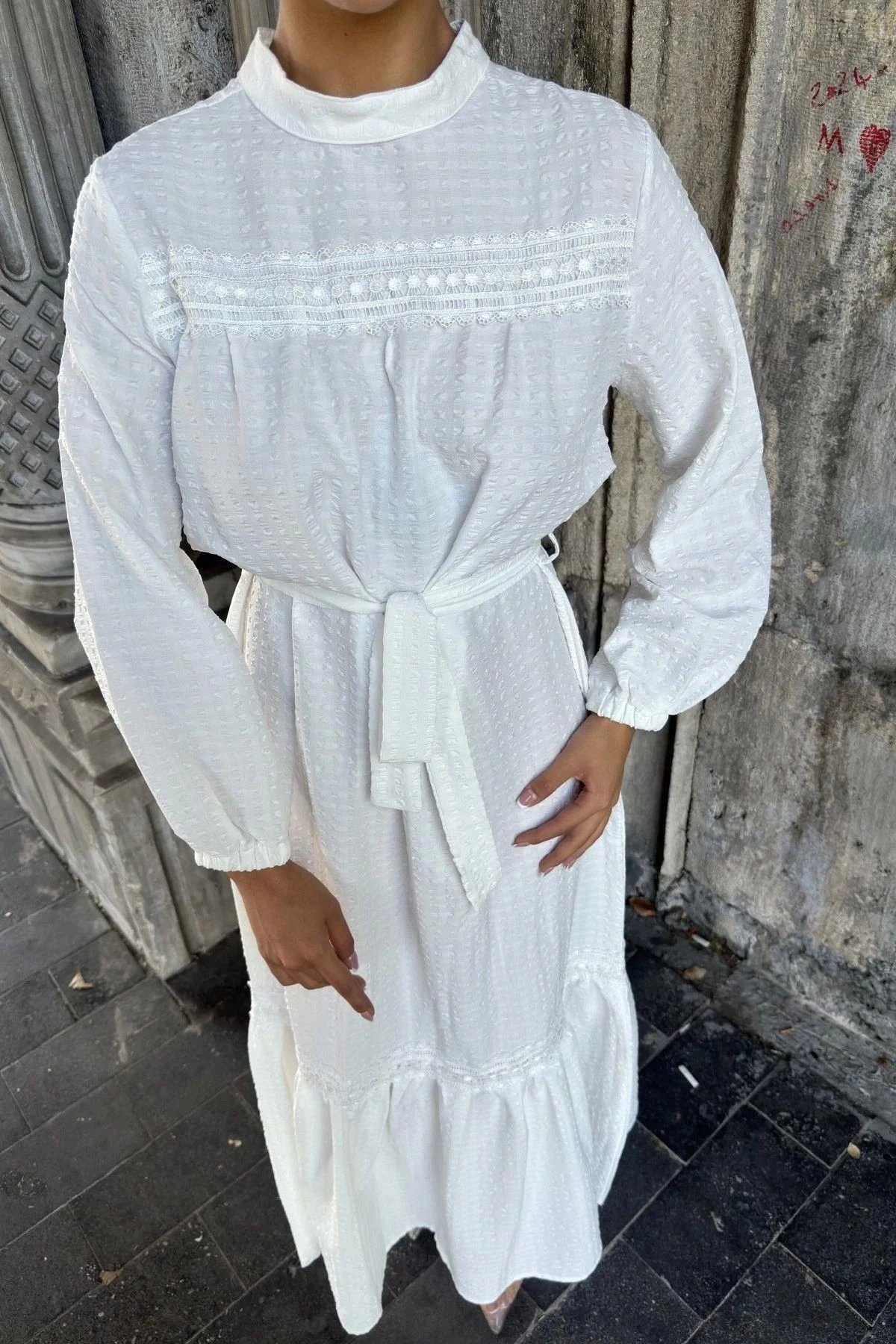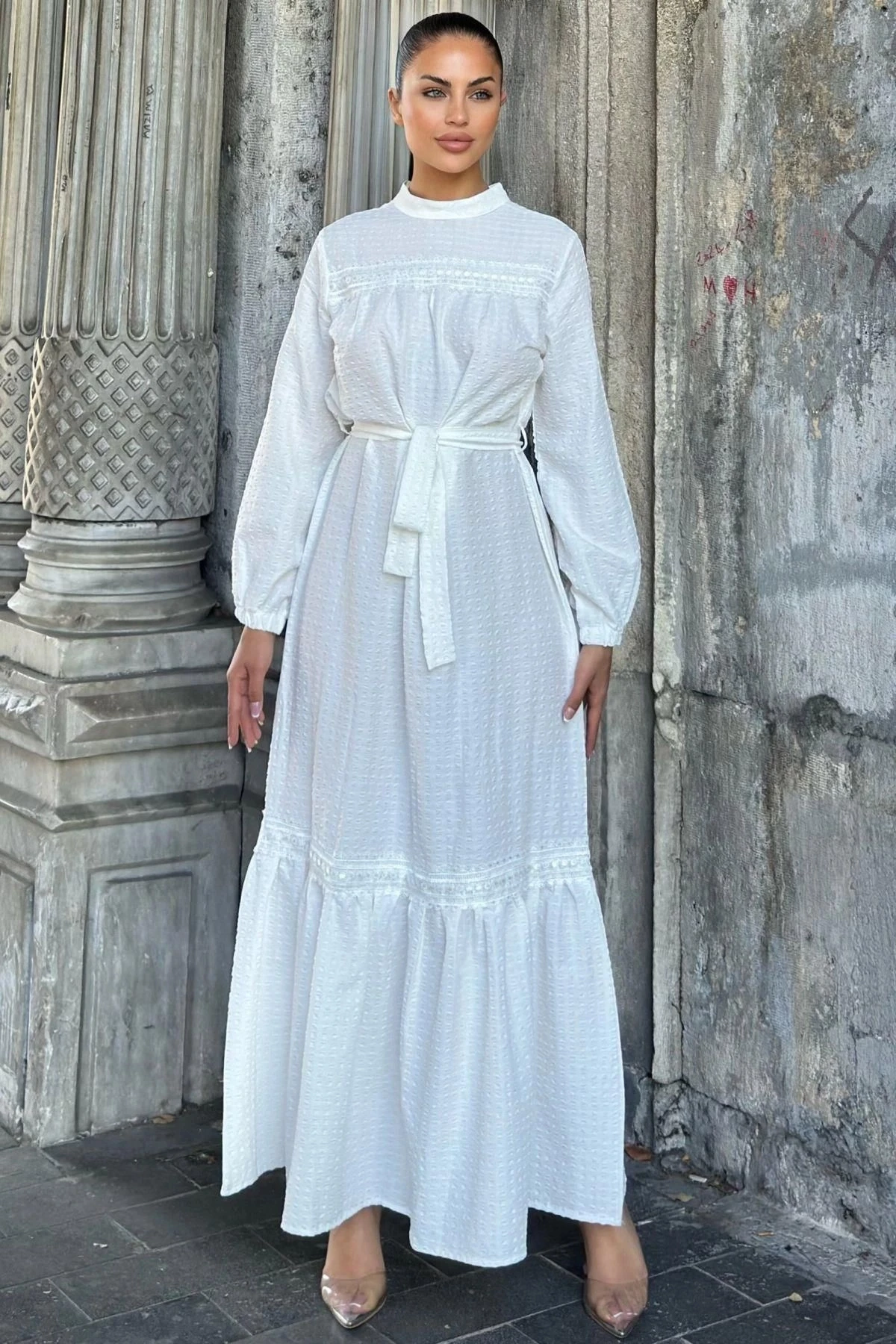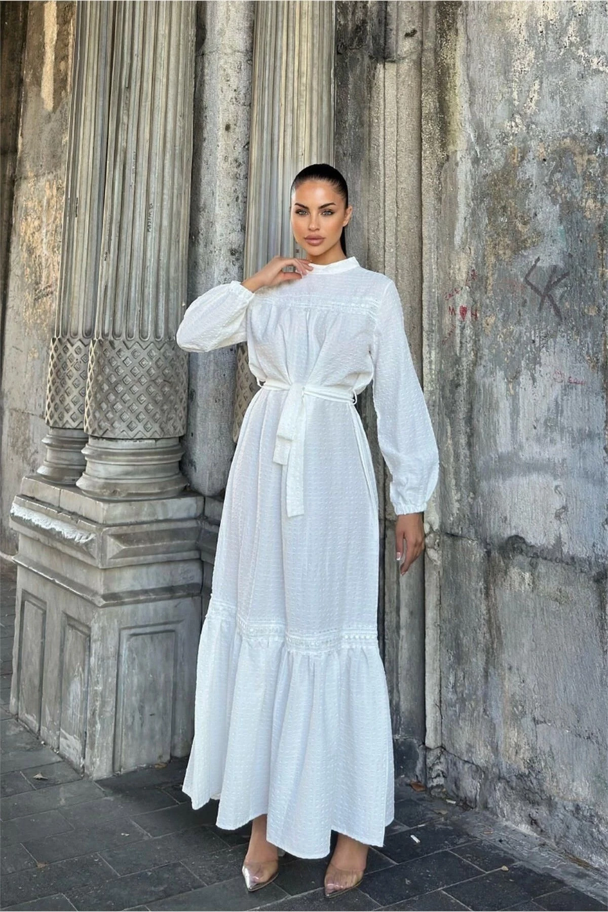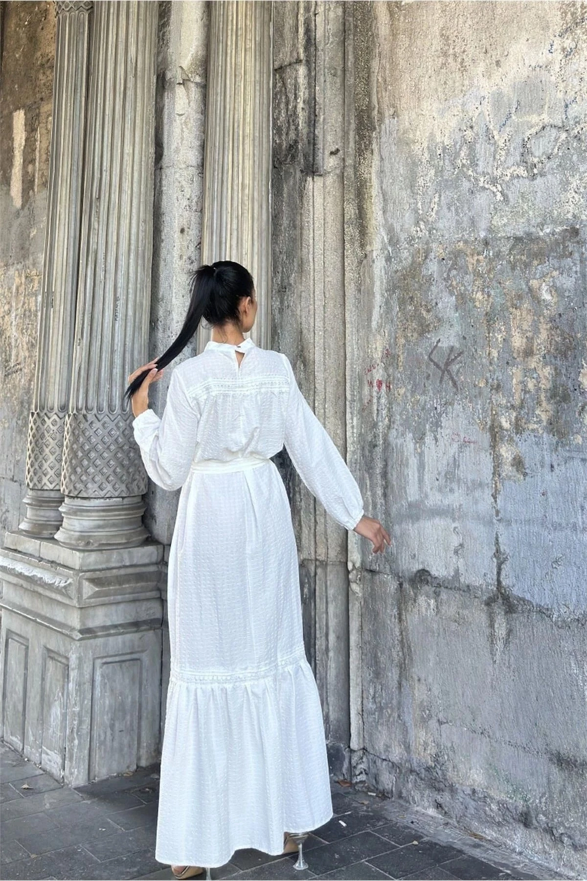 Beyaz Kuşaklı, Dantel Detaylı, Maksi Lotus Elbise
