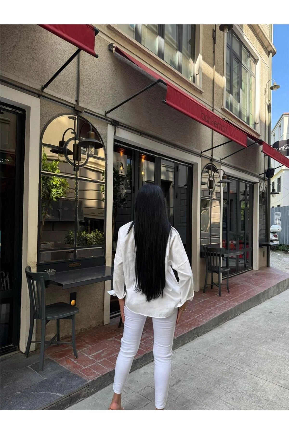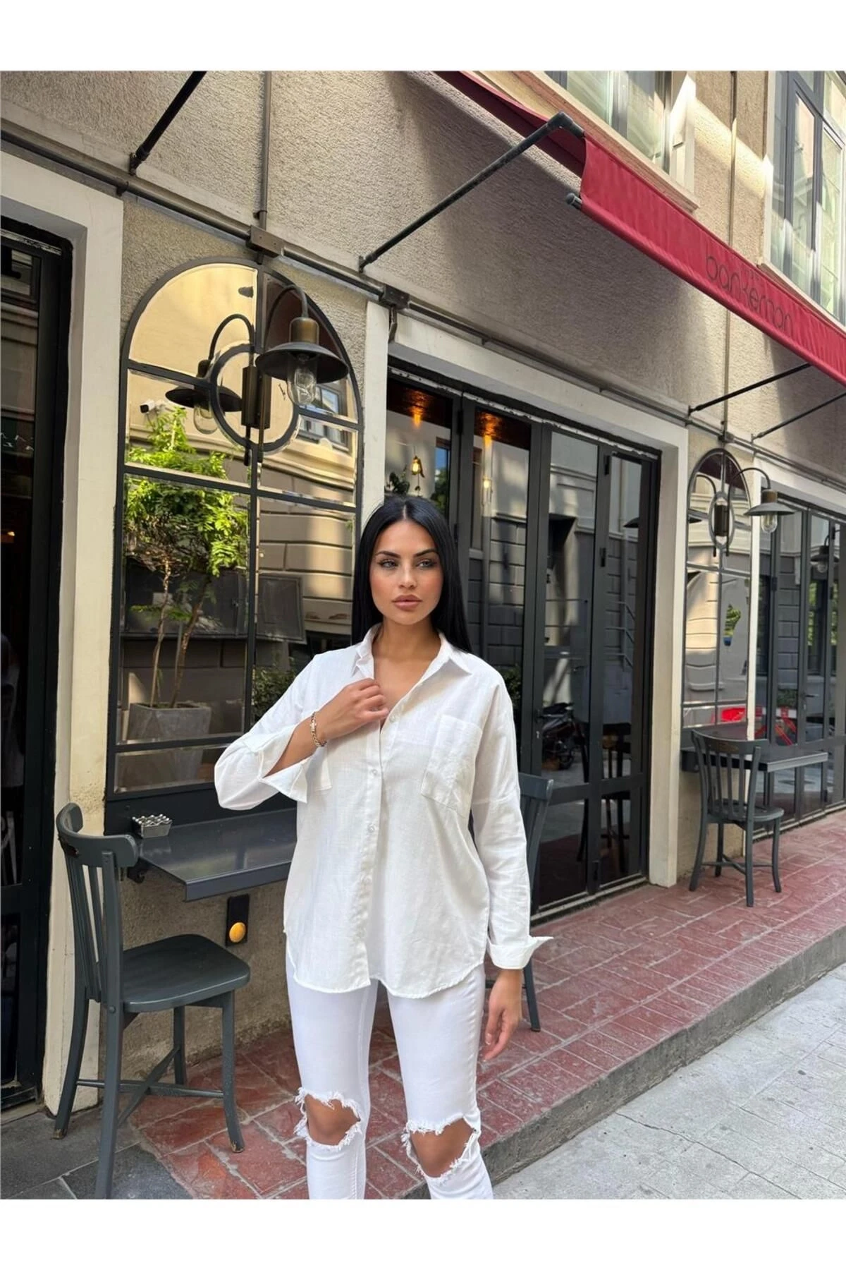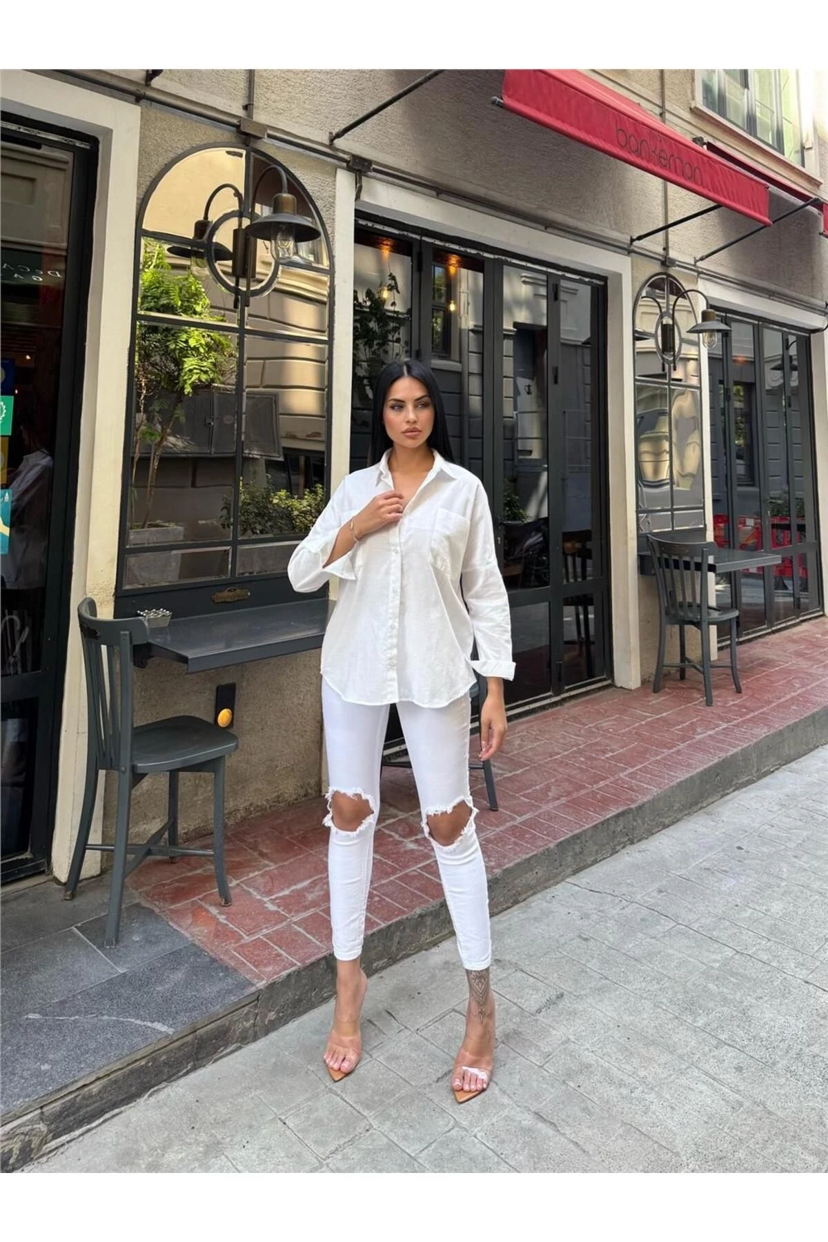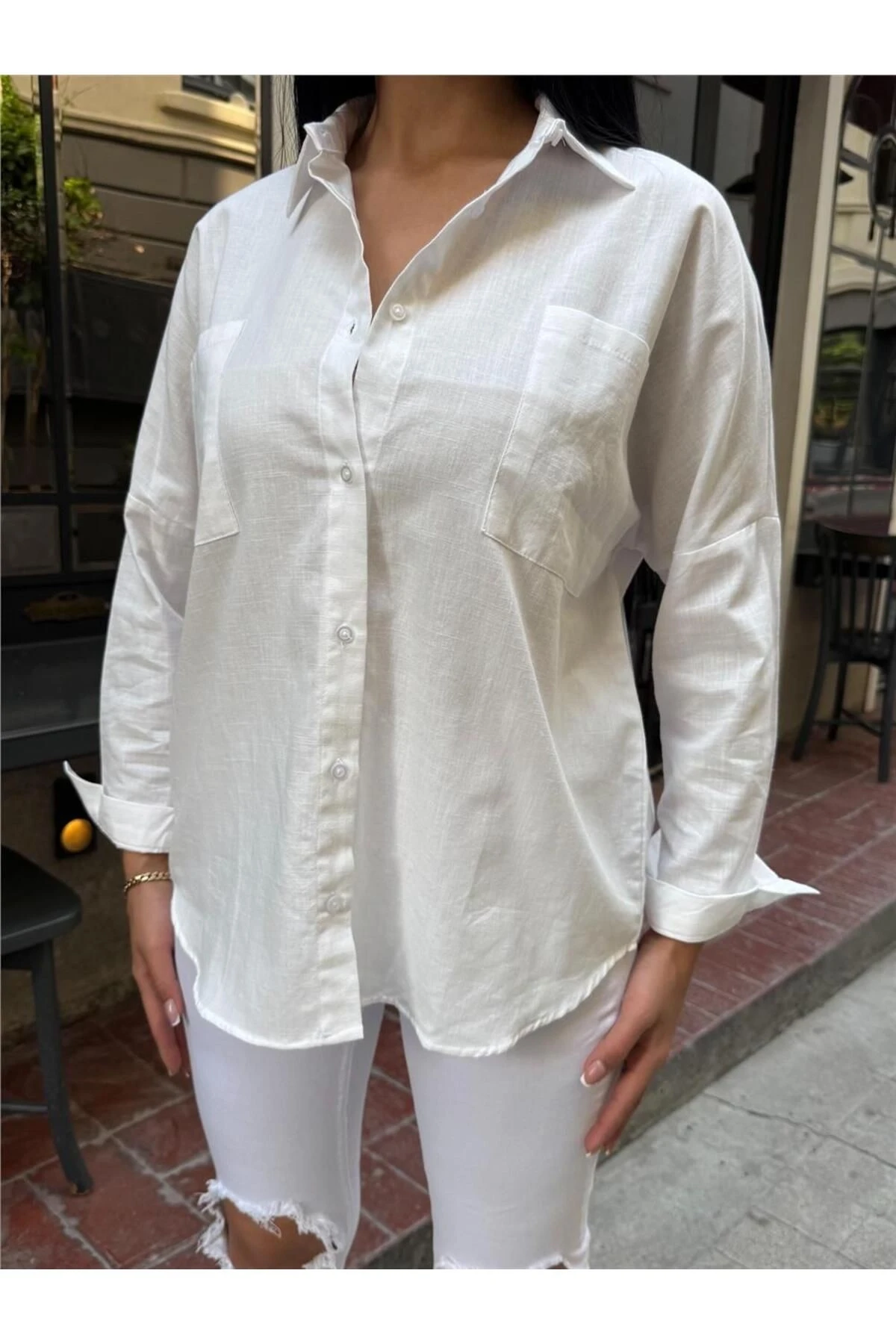 Beyaz Oversize Akrilik Pamuk Cepli Gömlek