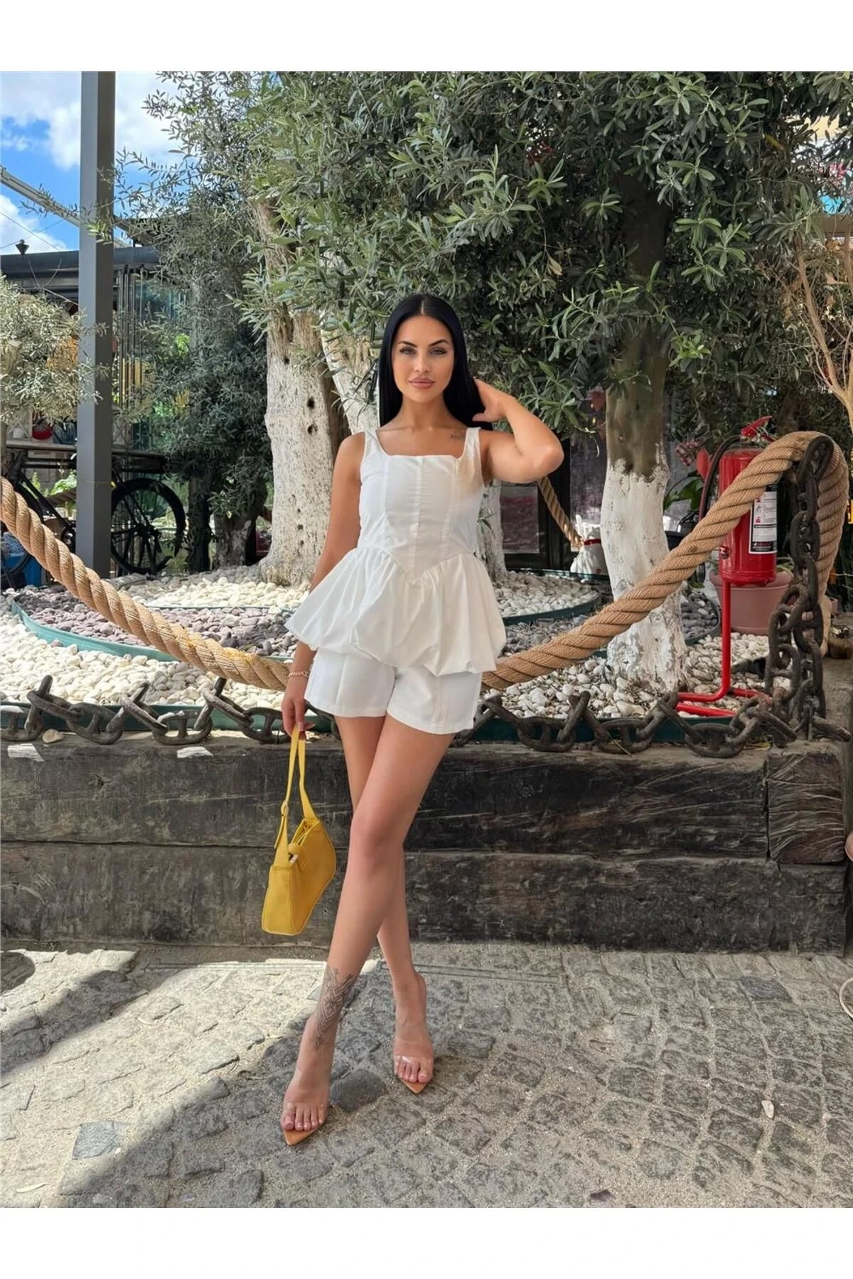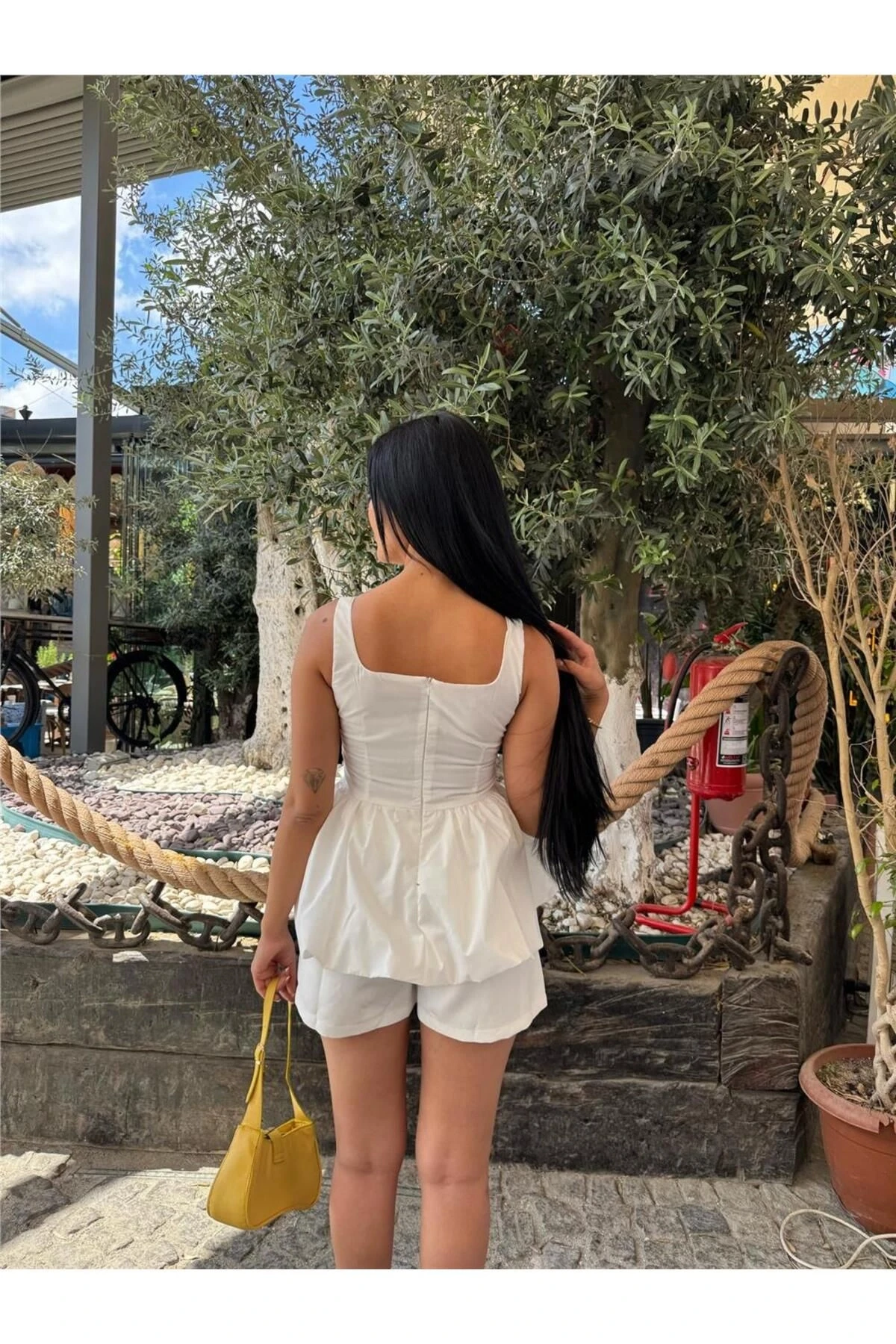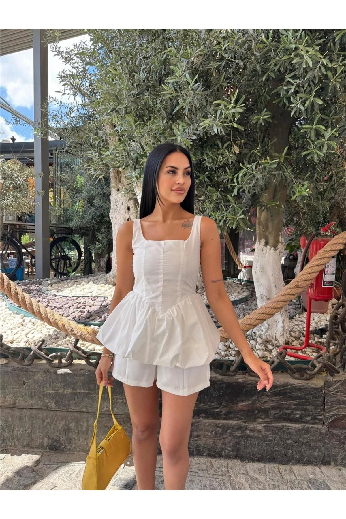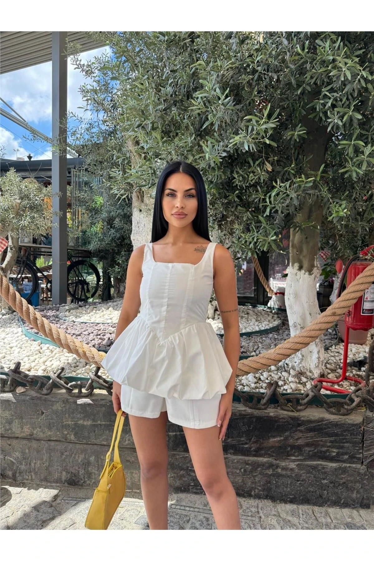 Beyaz Pamuk Polyester Kare Yaka Balon Bluz