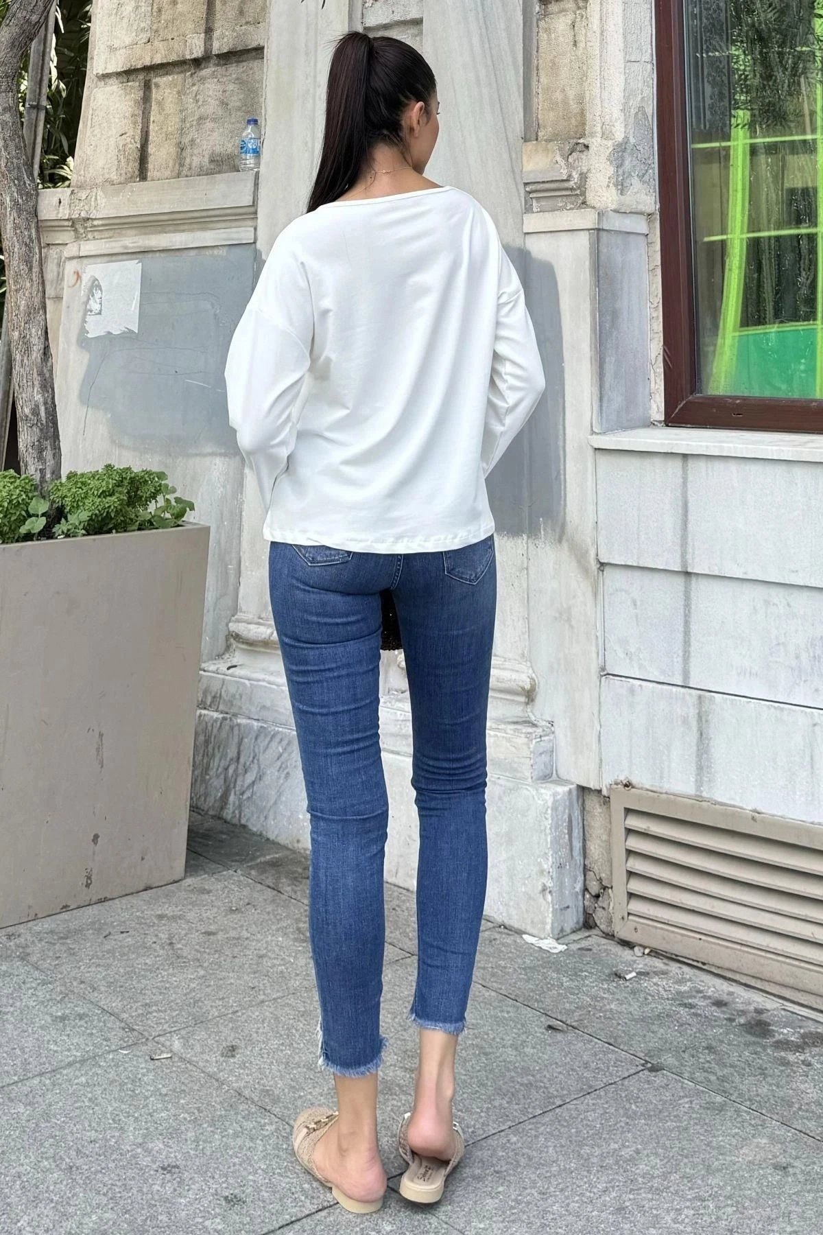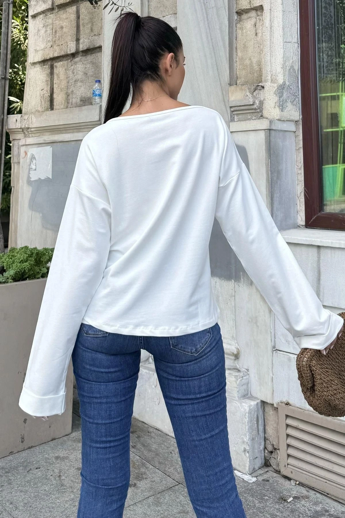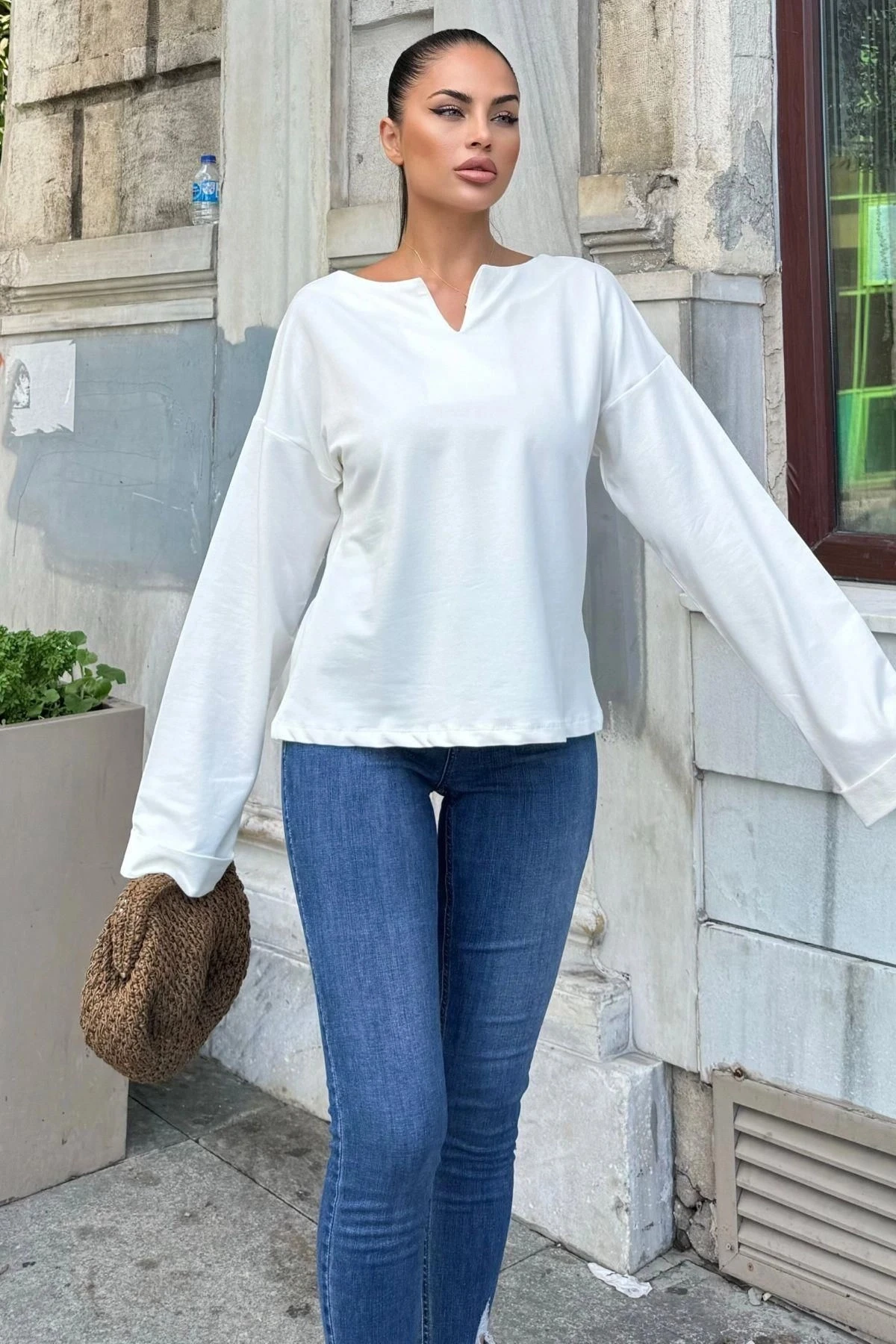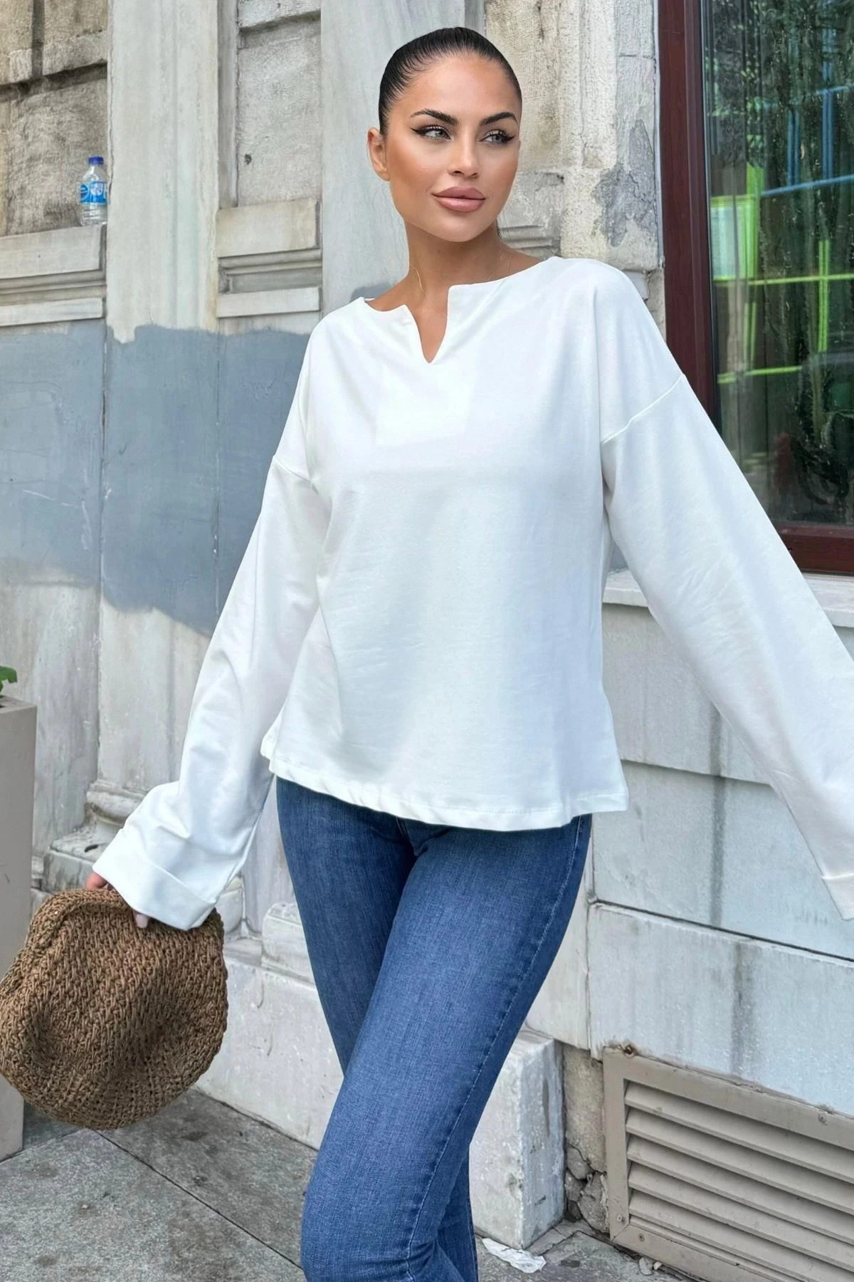 Beyaz Pamuklu Yaka ve Katlama Kol Bluz