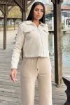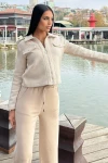 Ekru Balıksırtı Desenli, Fermuarlı, Kısa Kaşe Ceket