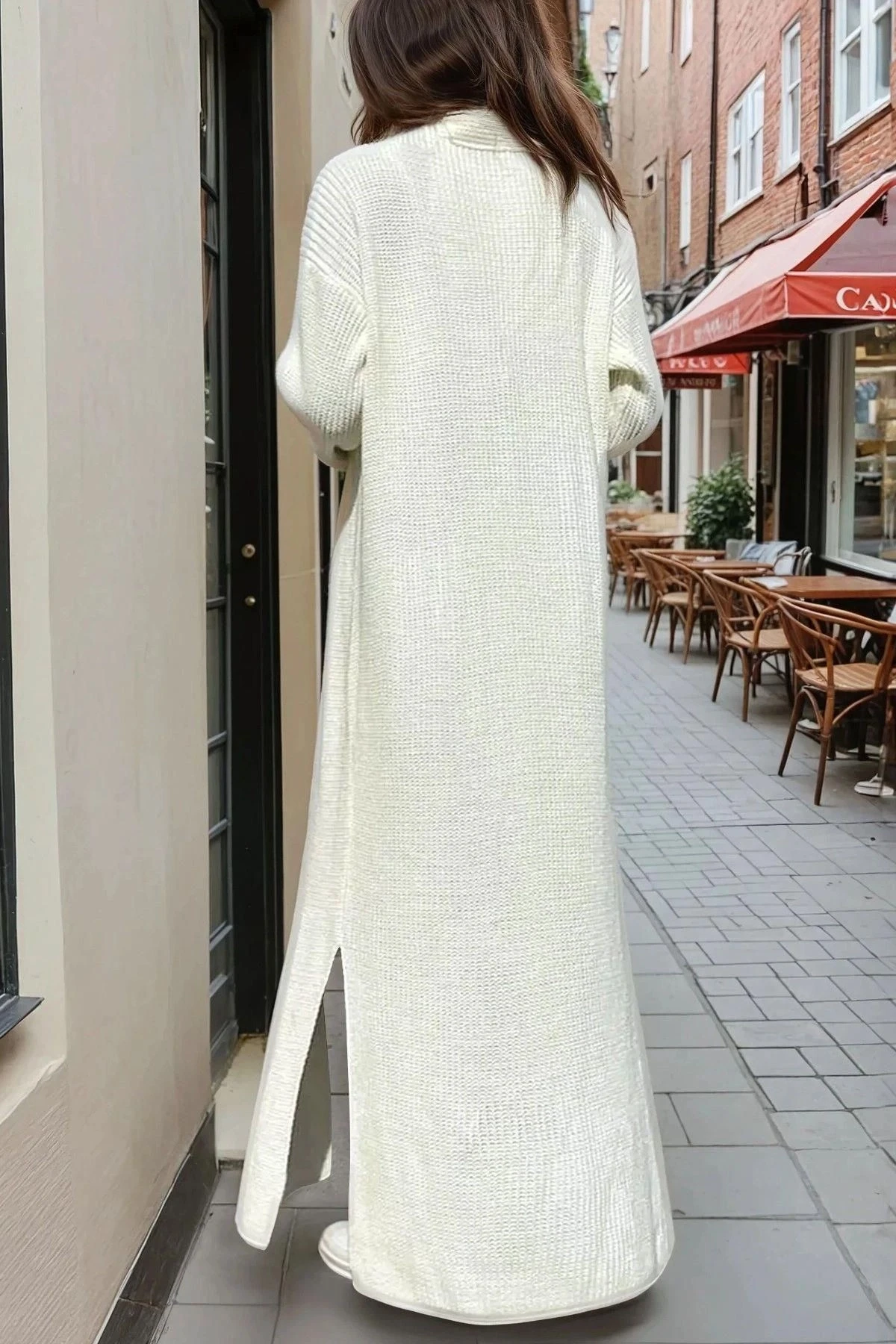 Ekru Boğazlı, Çapraz Yırtmaç Detaylı, Salaş Ve Uzun Panço Triko Elbise