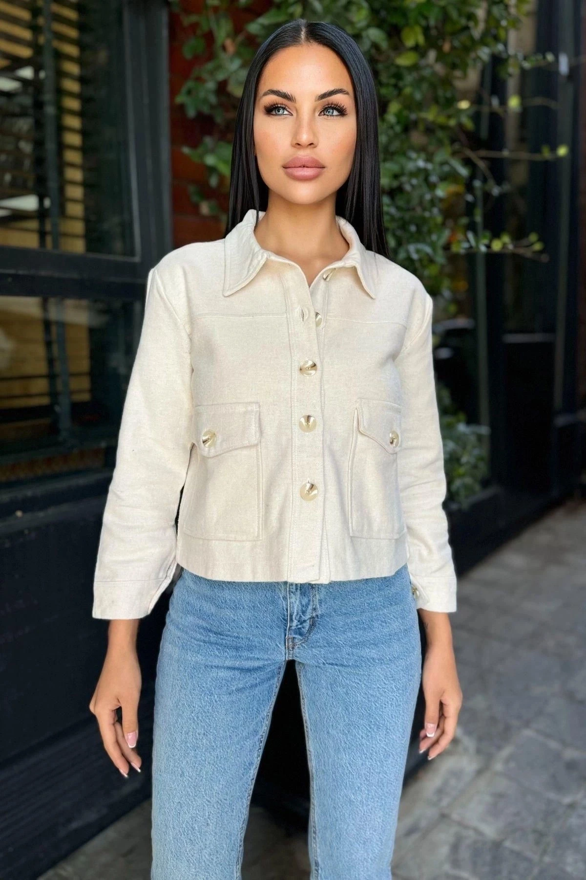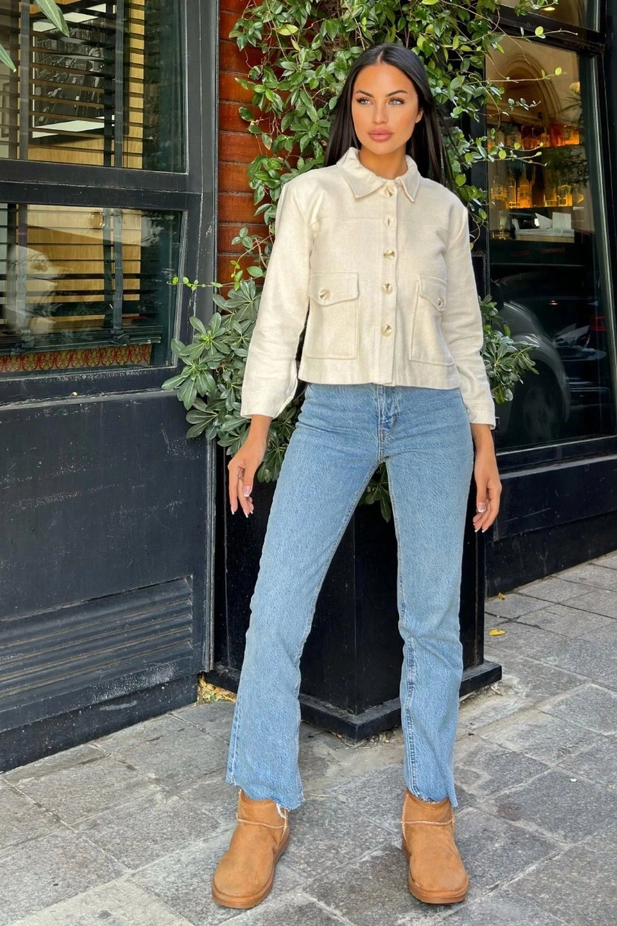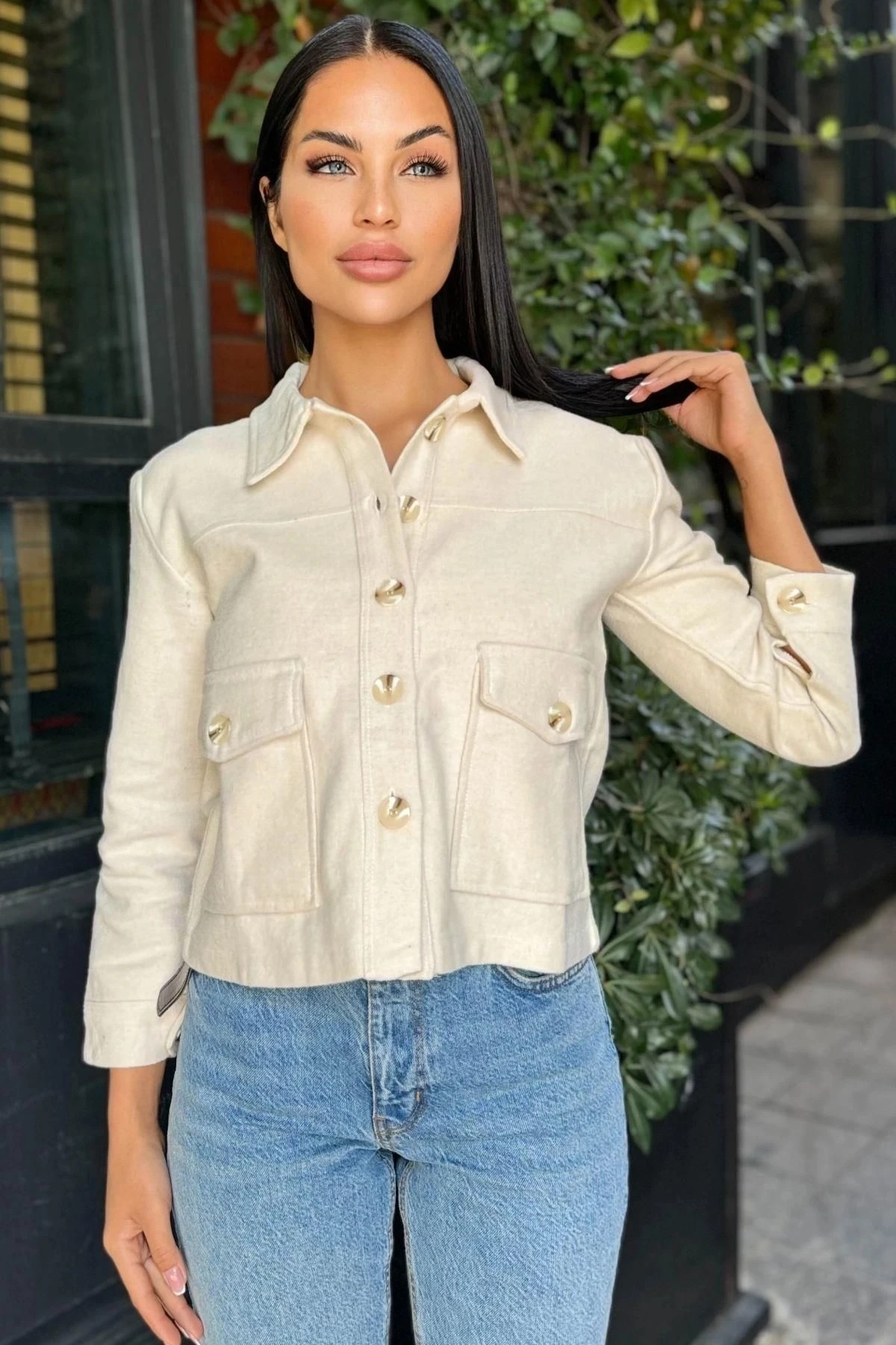 Ekru Çift Cepli, Düğmeli Kaşe Ceket