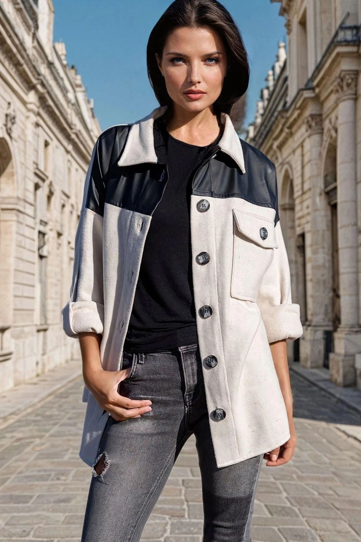 Ekru, Deri Detaylı, Desenli Kaşe Gömlek