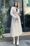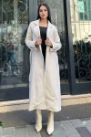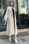 Ekru Kruvaze Yaka, Çift Cepli, Beli Kemerli, Uzun Balıksırtı Kaşe Kaban (Astarsız)