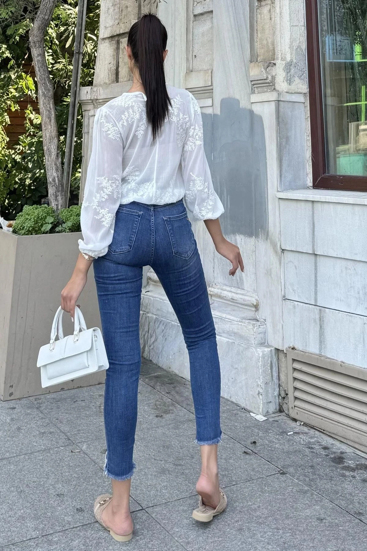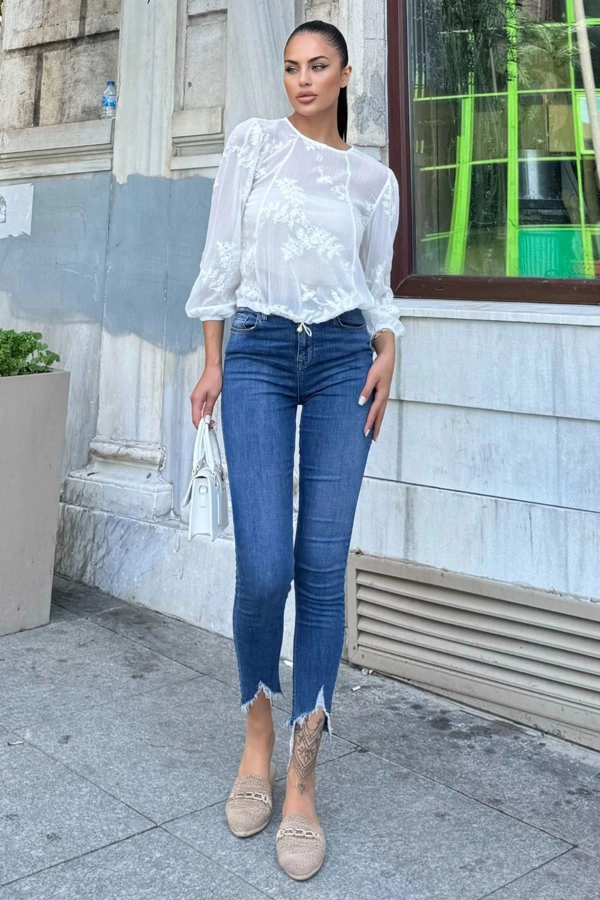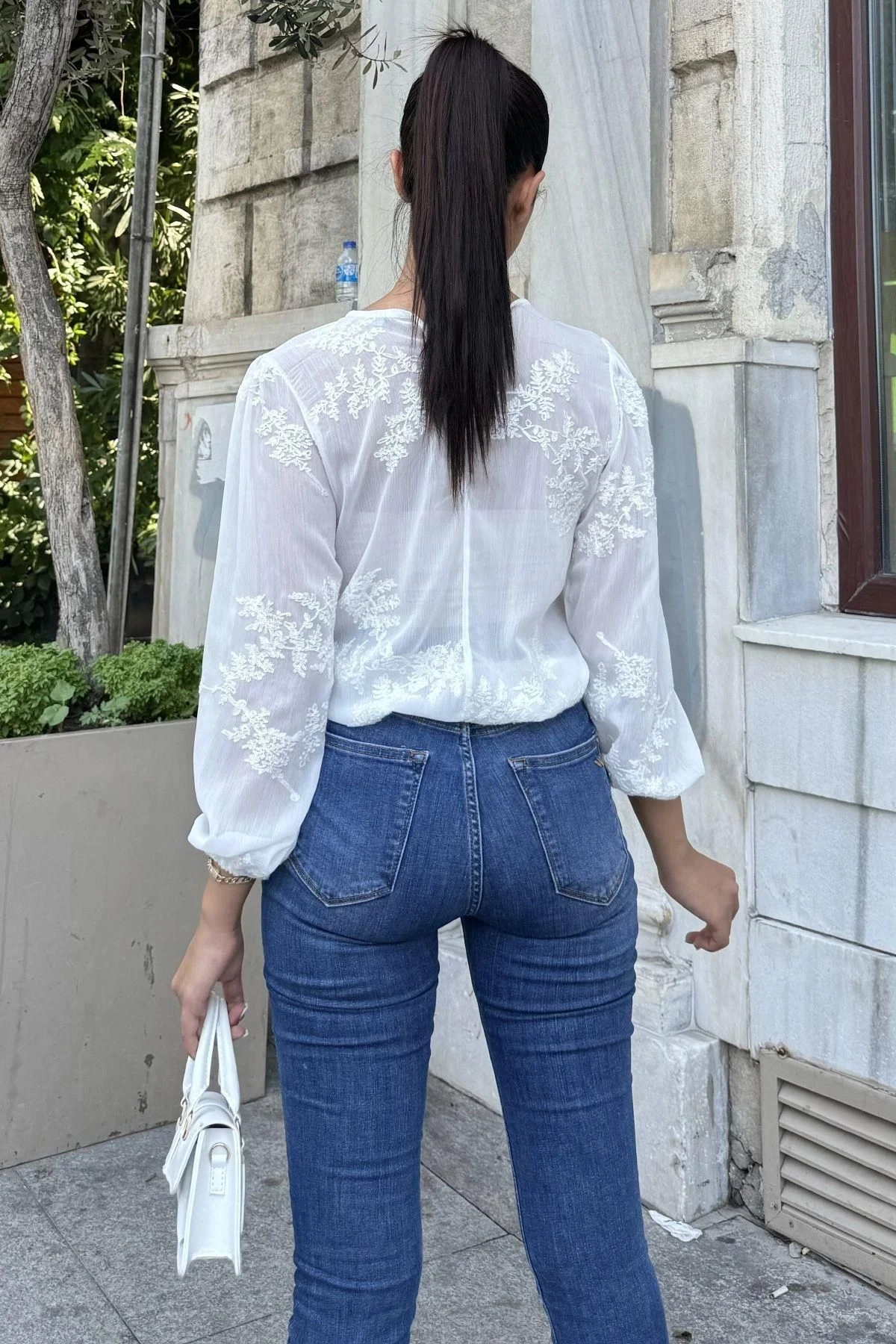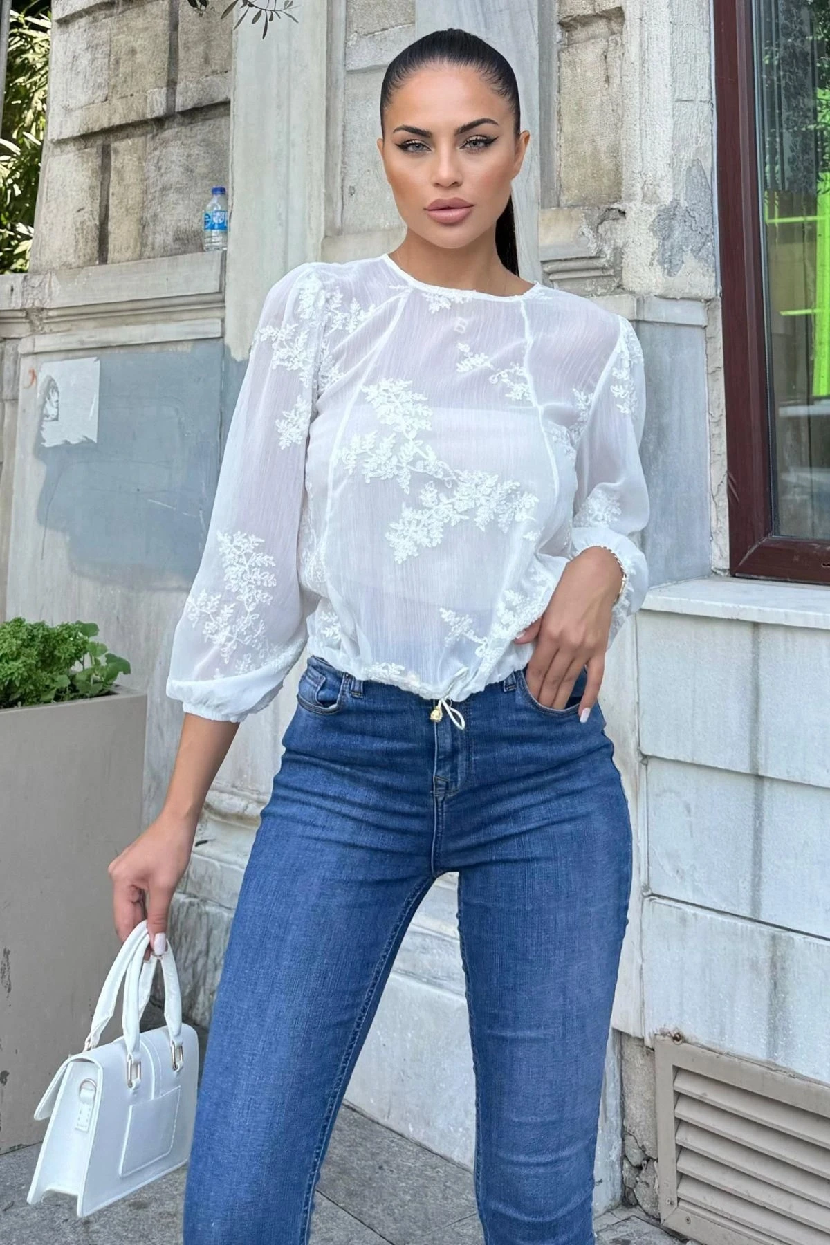 Ekru Nakışlı Bürümcük Şifon Bluz