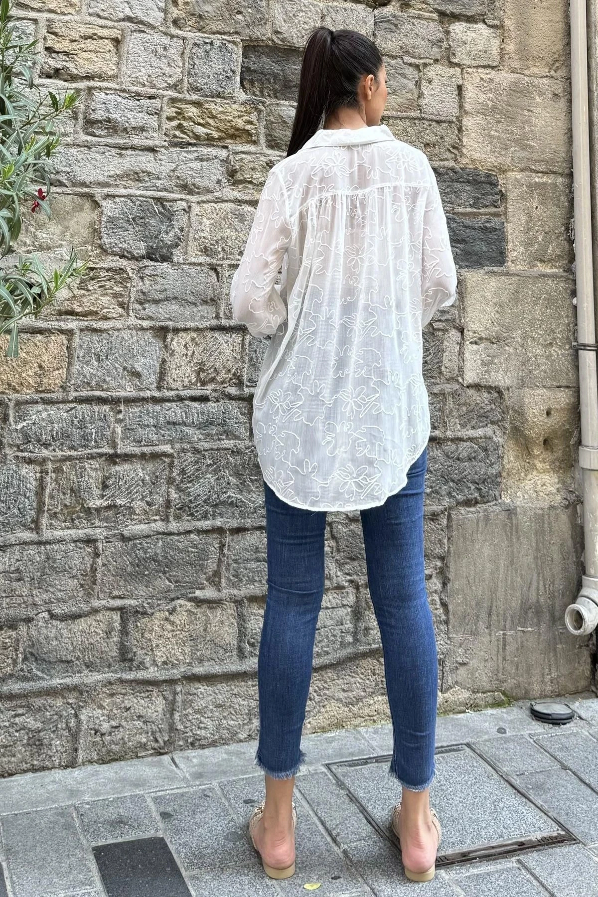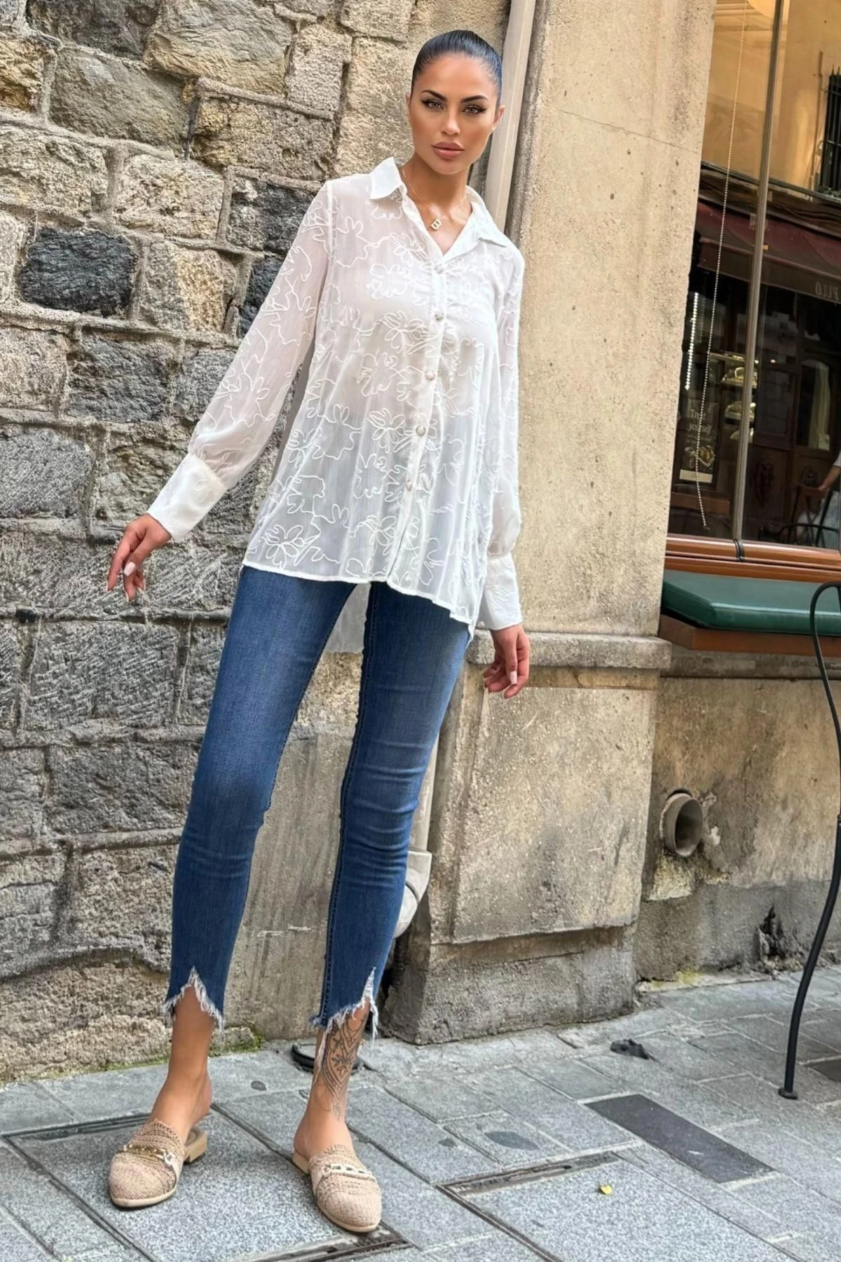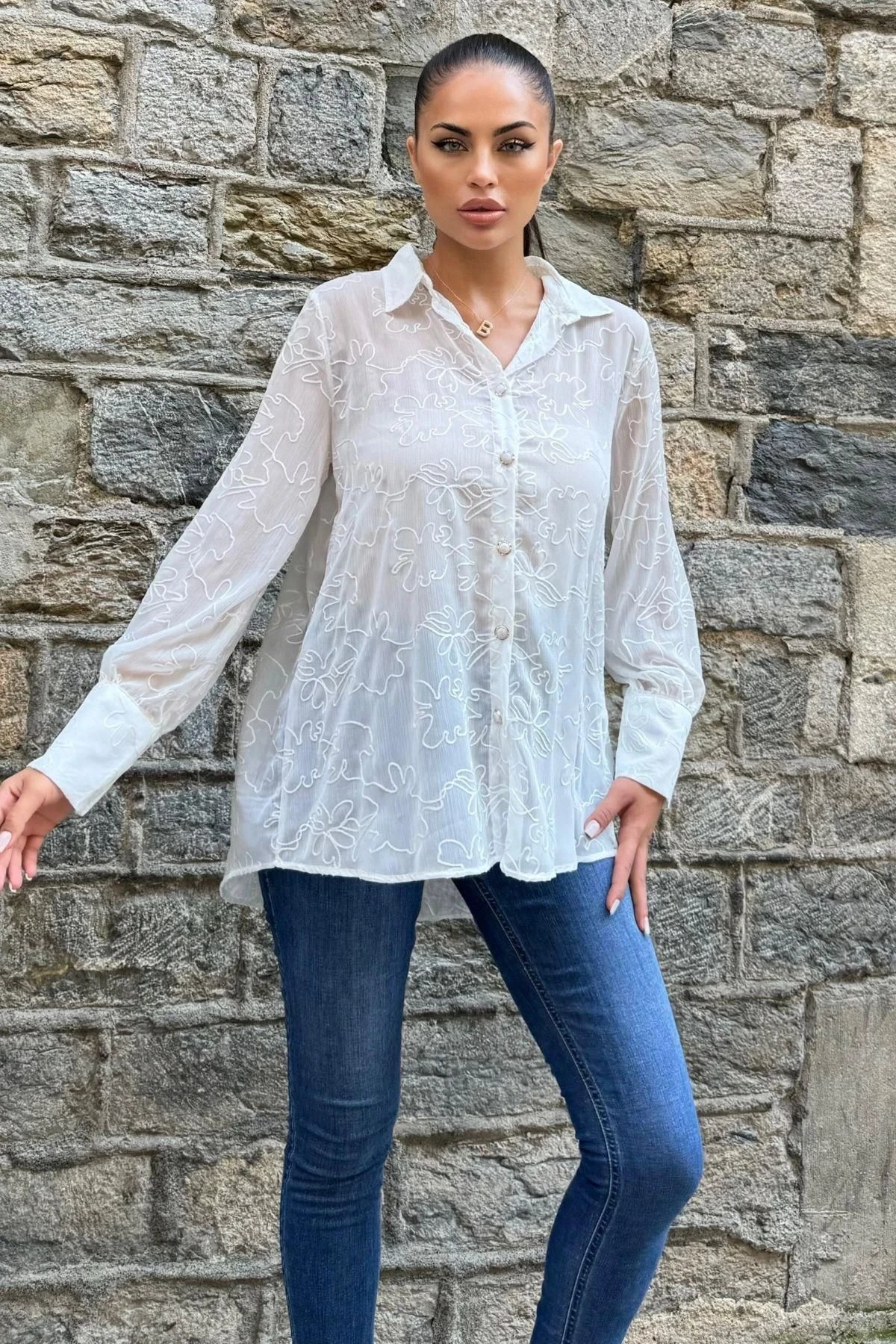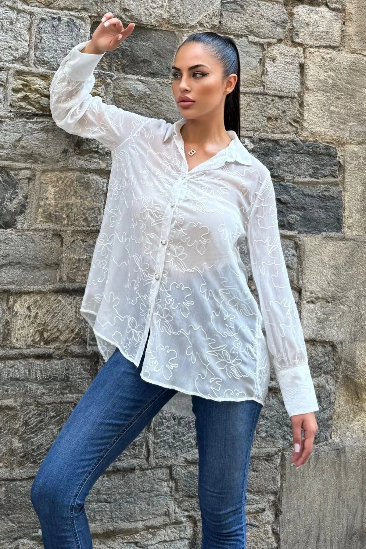 Ekru Nakışlı Bürümcük Şifon Bluz