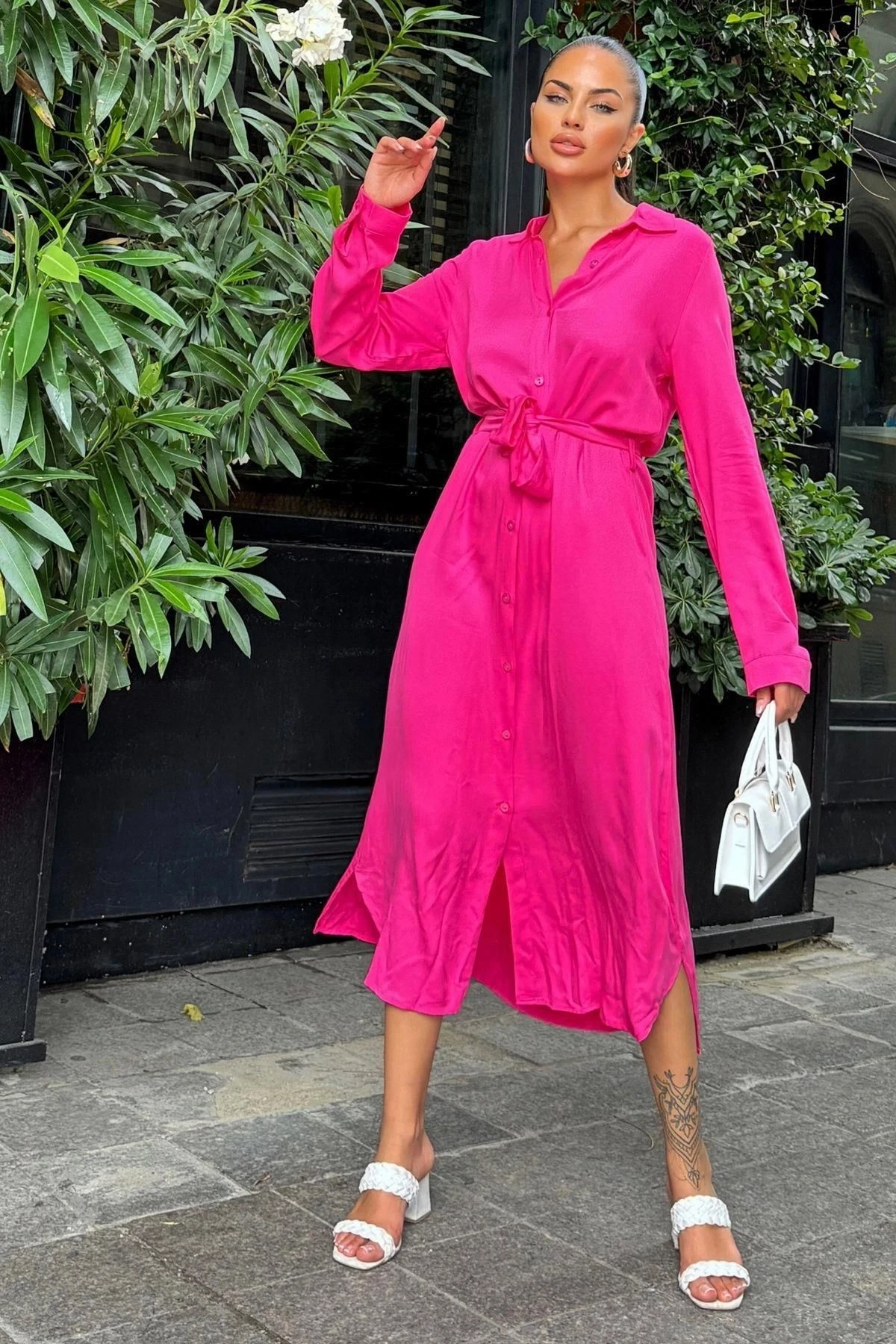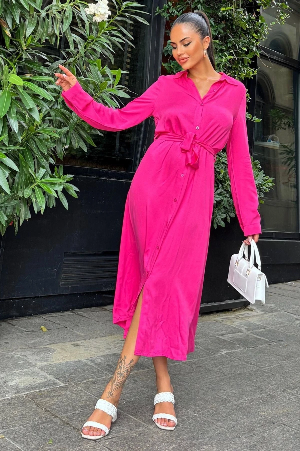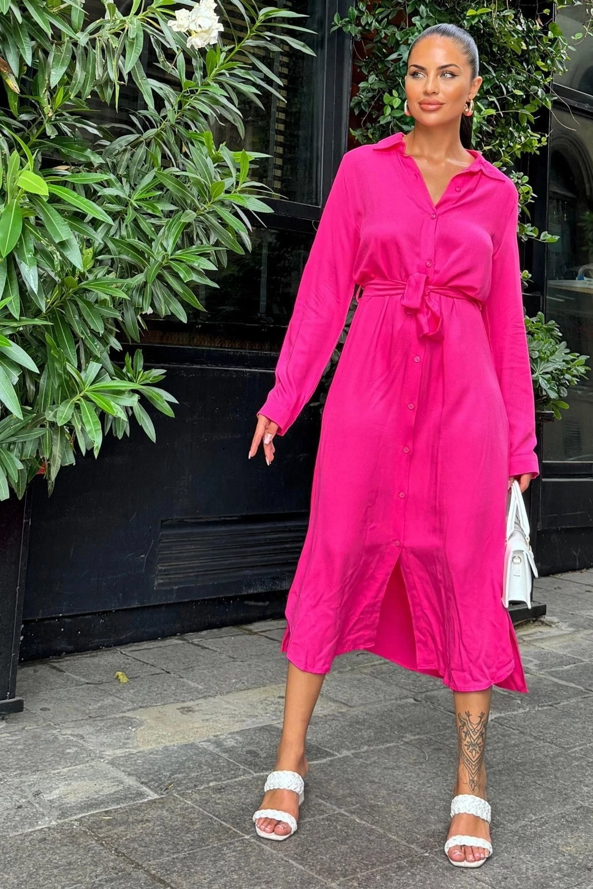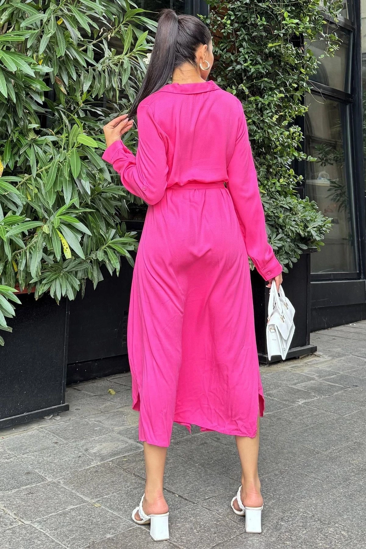 Fuşya Kuşaklı Viskon Fit Elbise Gömlek