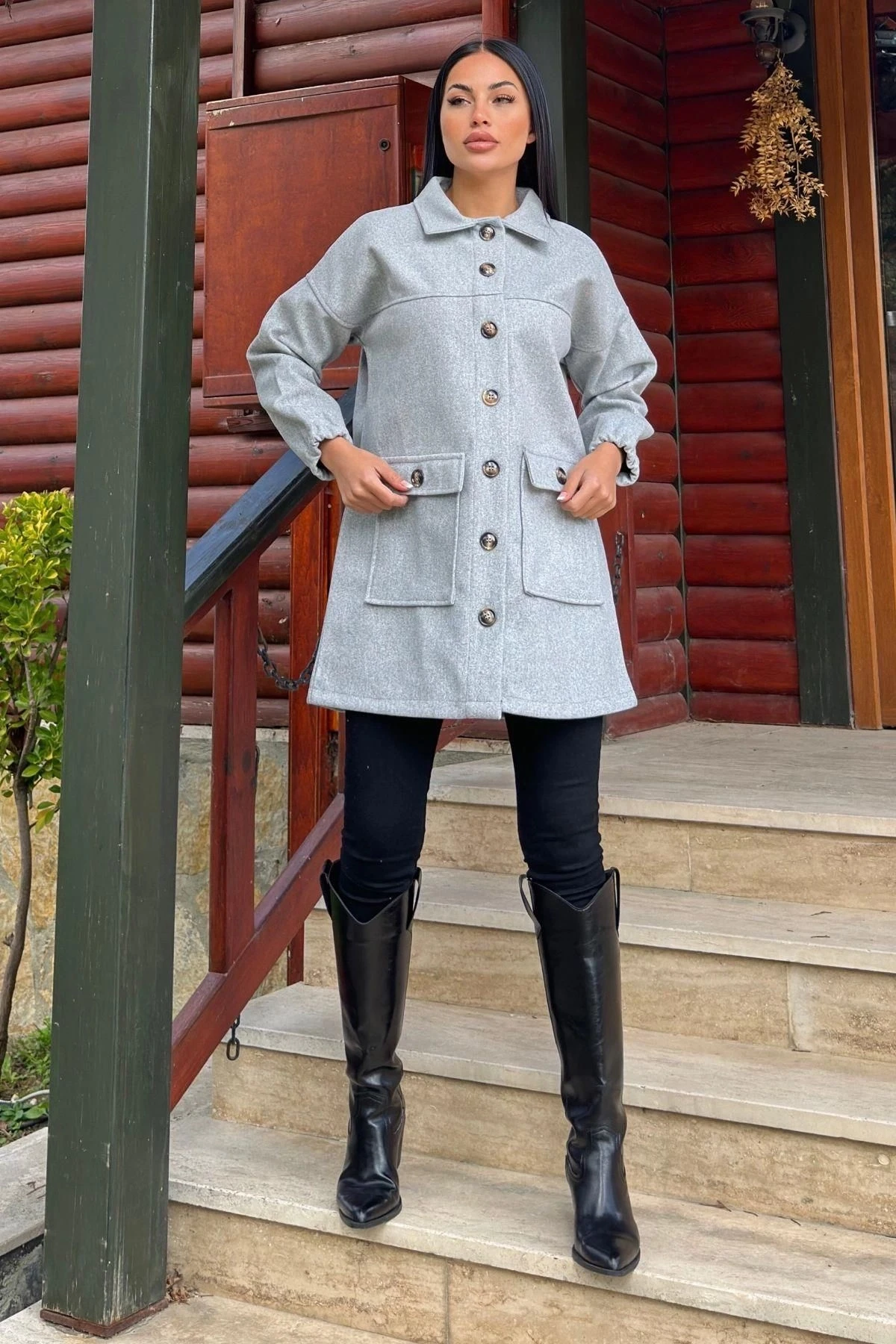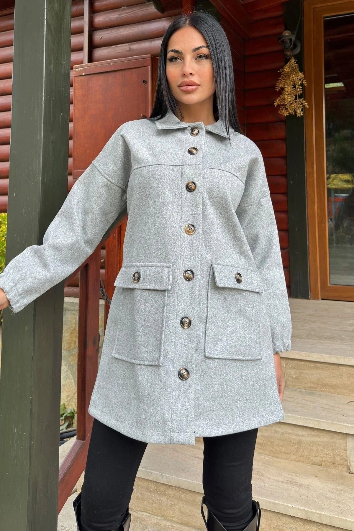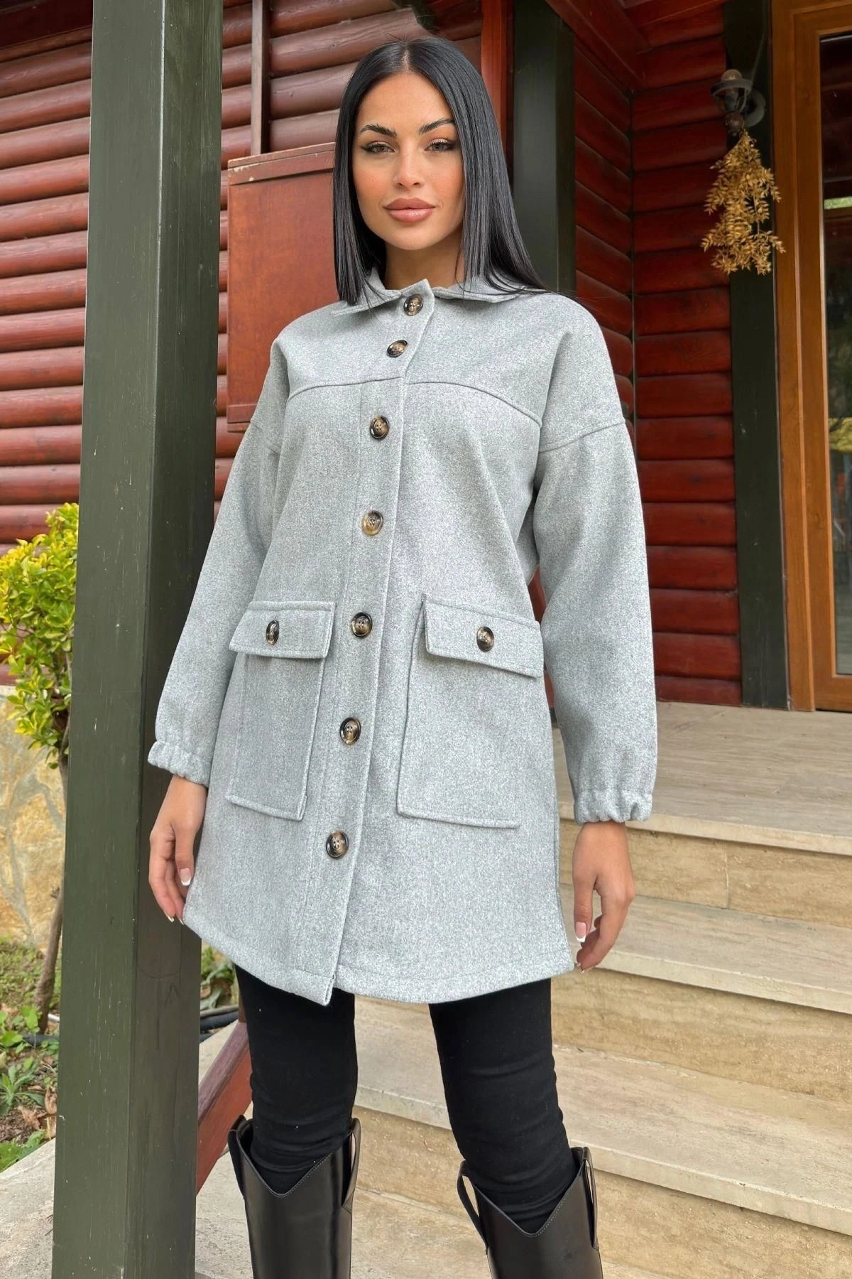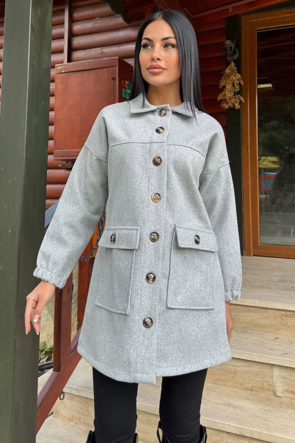 Gri Düğme Detaylı Kapaklı Cep, Midi Polar Kaşe Ceket