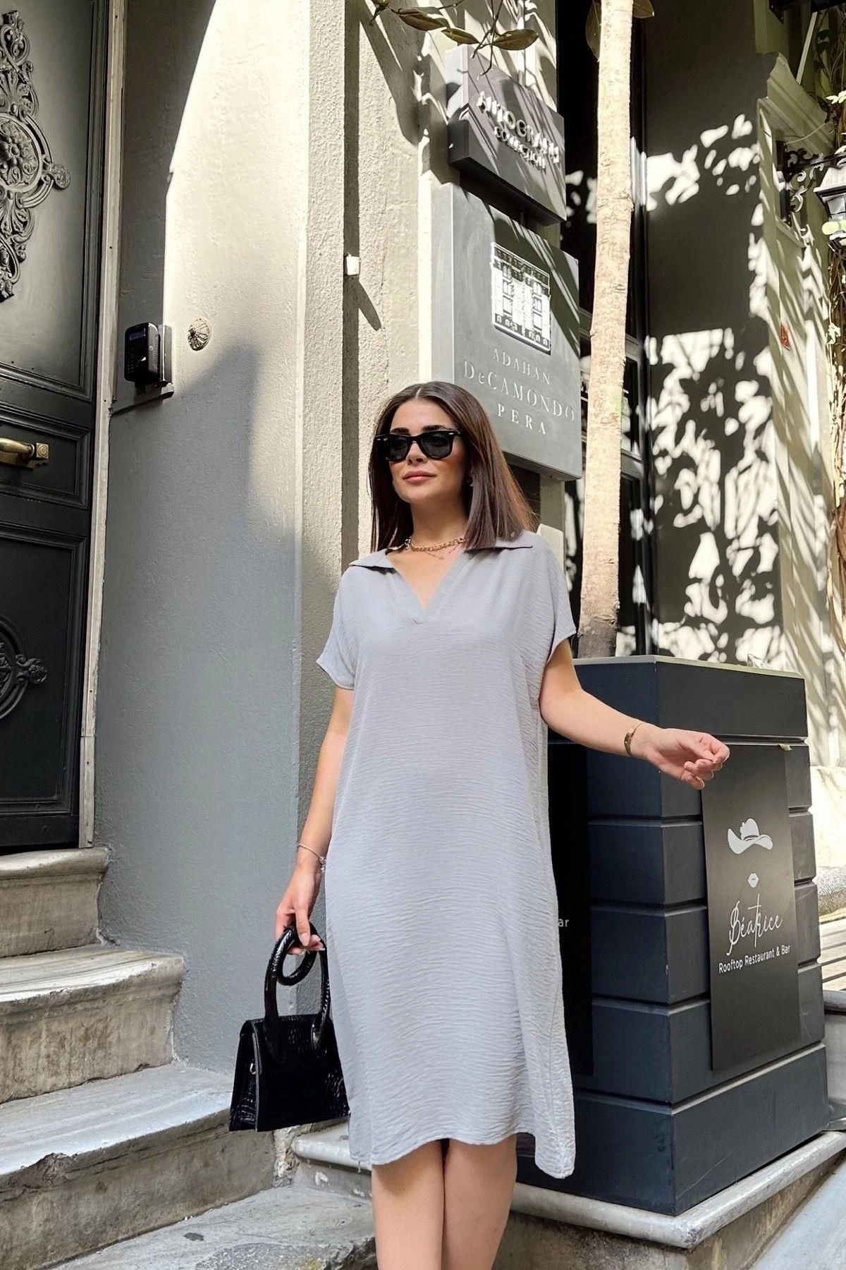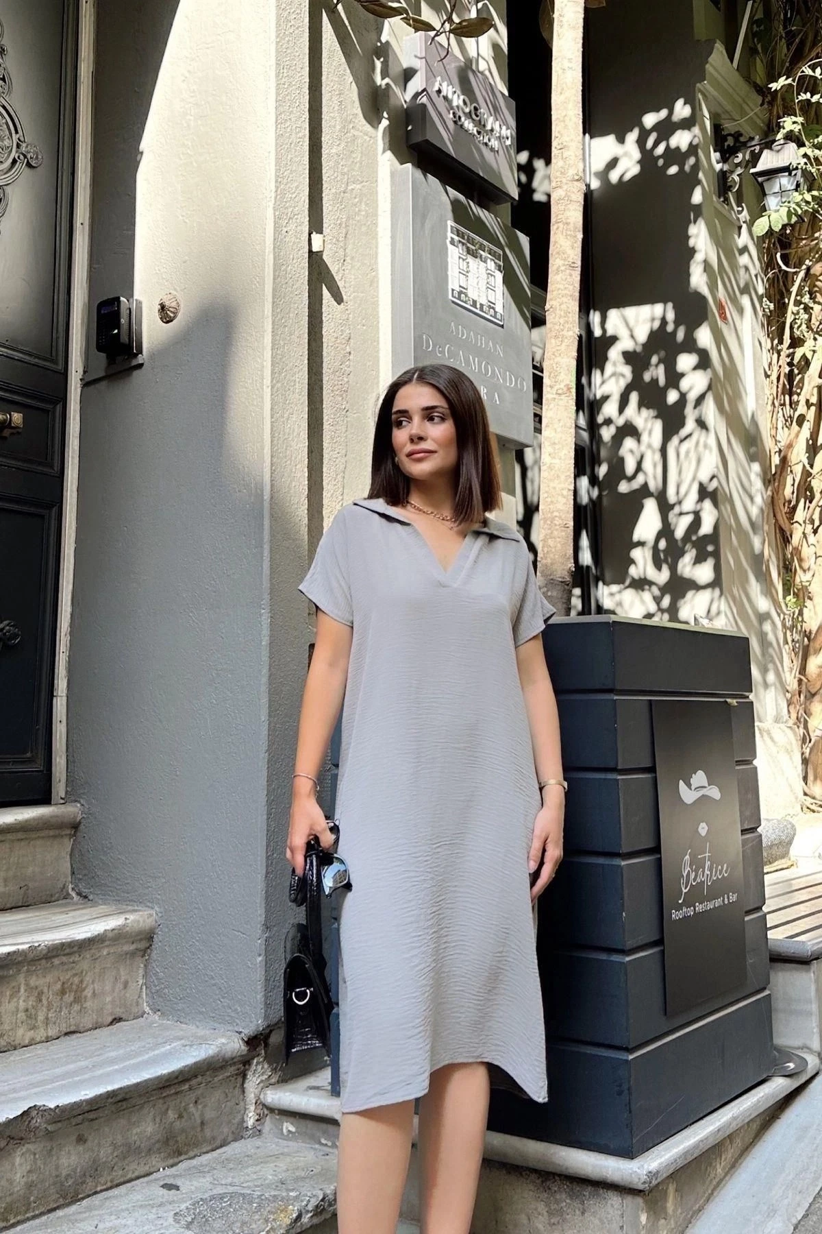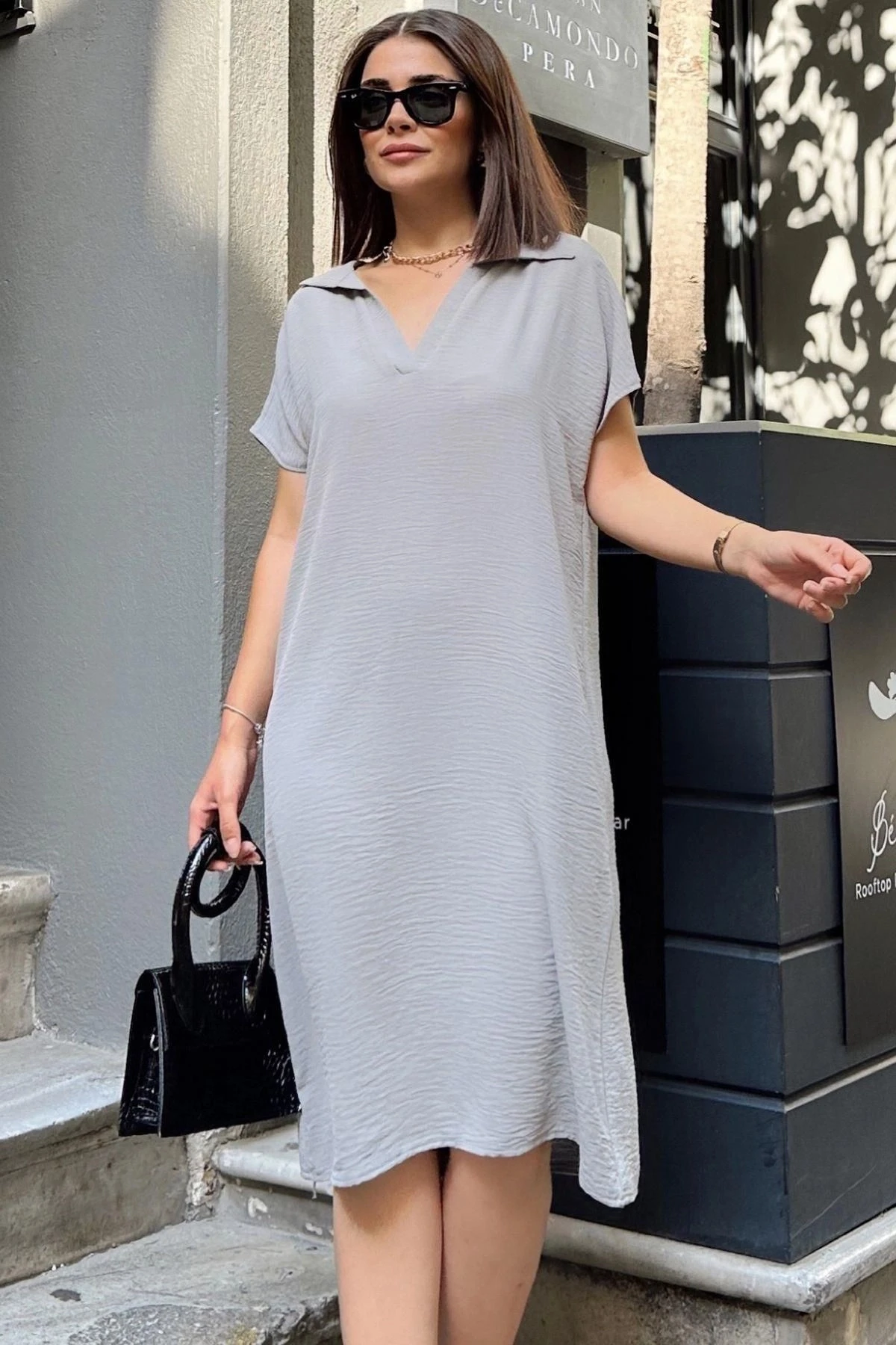 Grı Kısa Kol, Polo Yaka, Dokulu Kumaş, Basic Kalıp/Kesim, Aerobin Rahat Midi Elbise