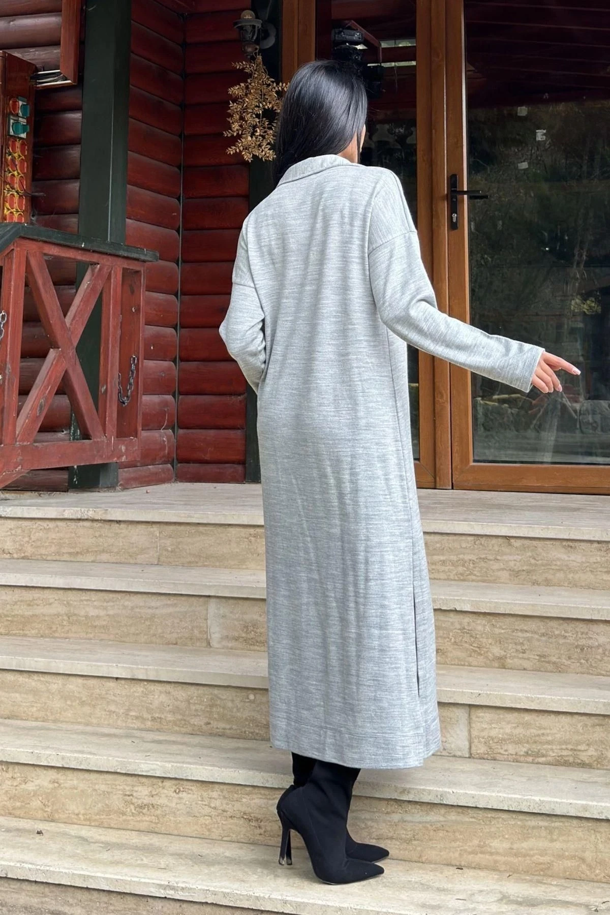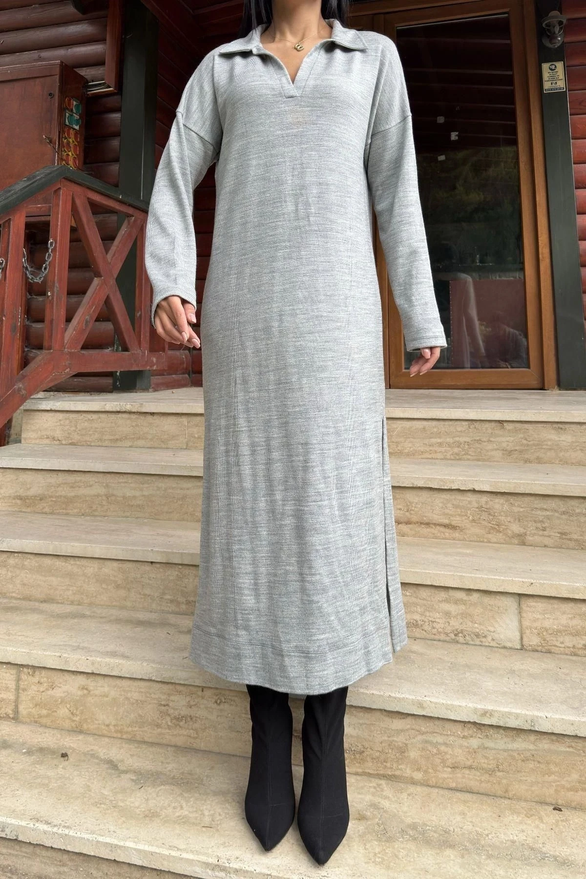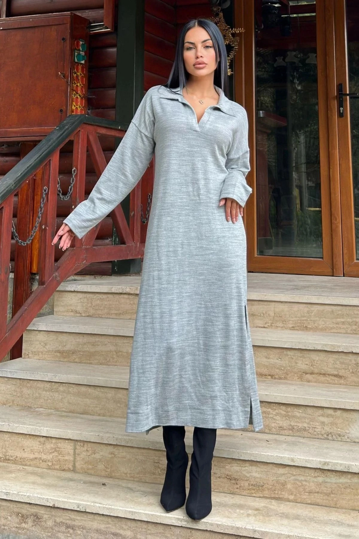 Gri Polo Yaka, Uzun Kol, Yırtmaçlı, Salaş, Akrilik Örme Uzun Elbise