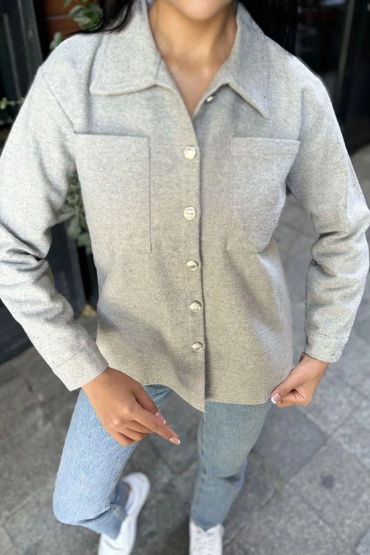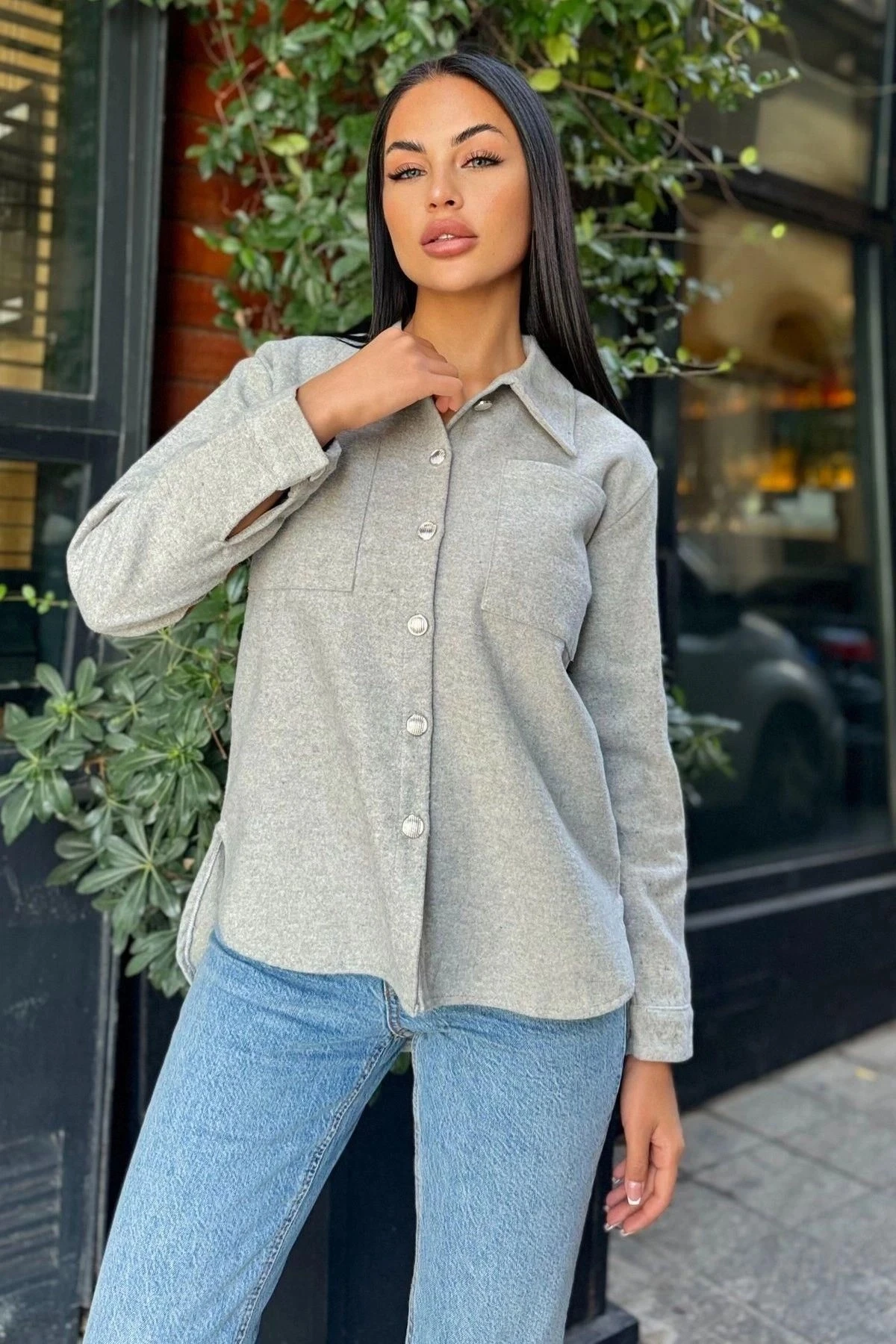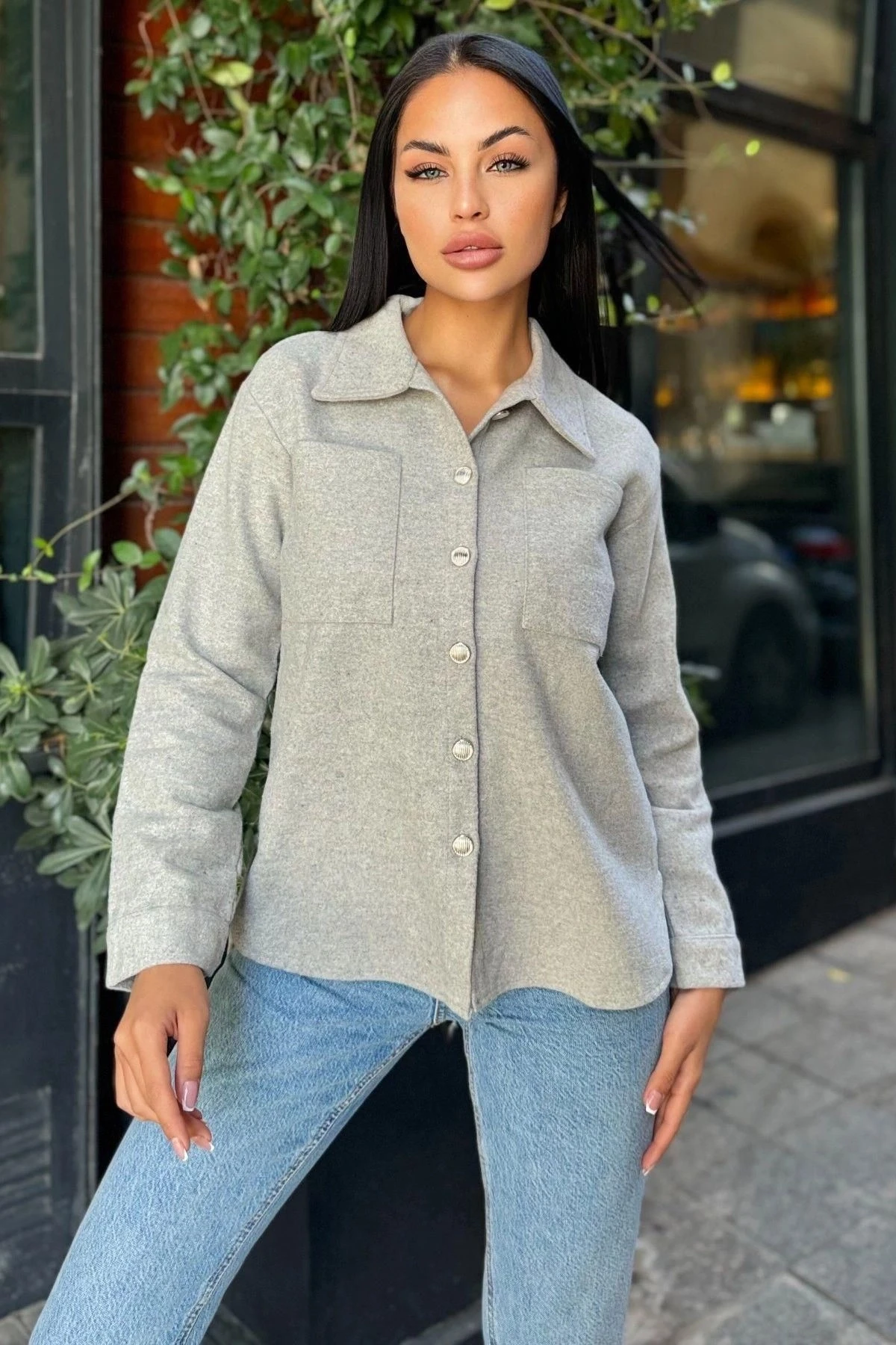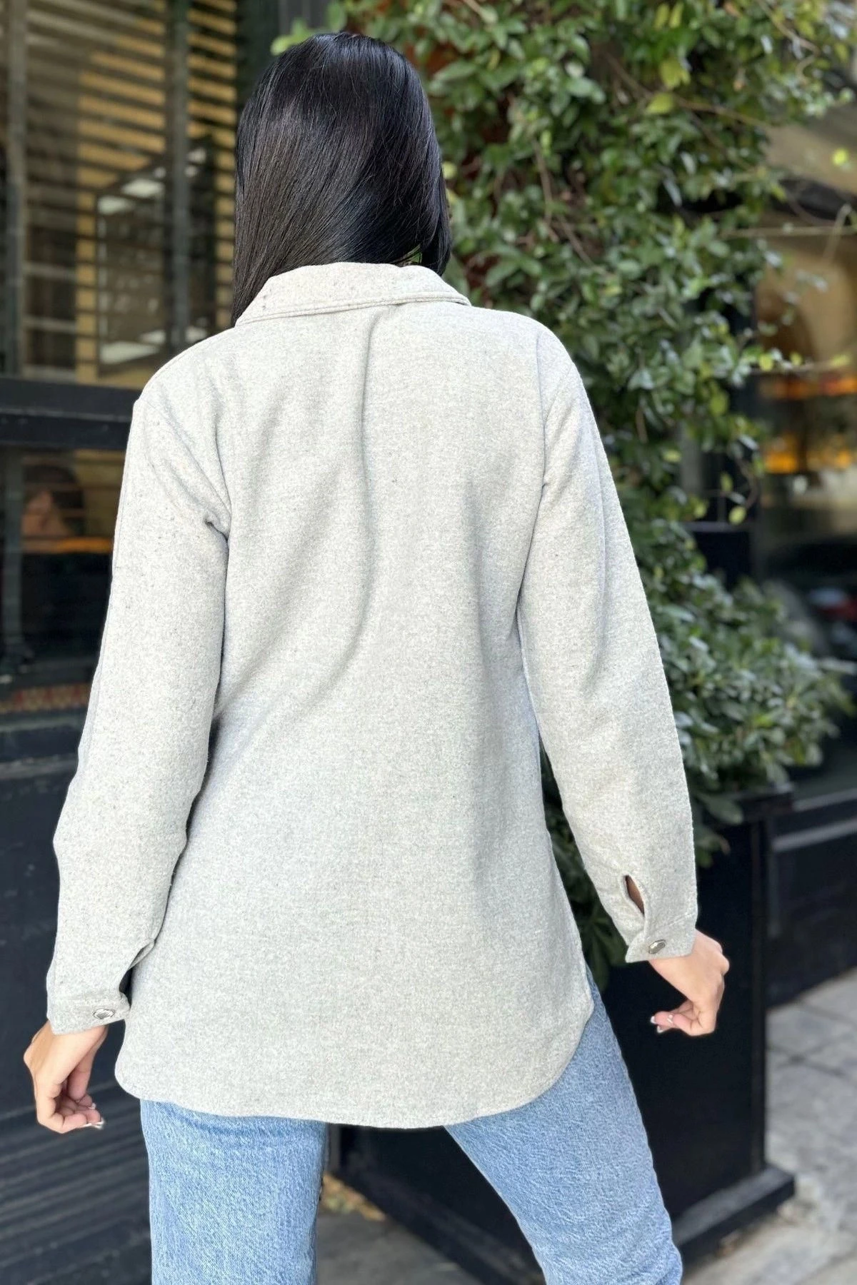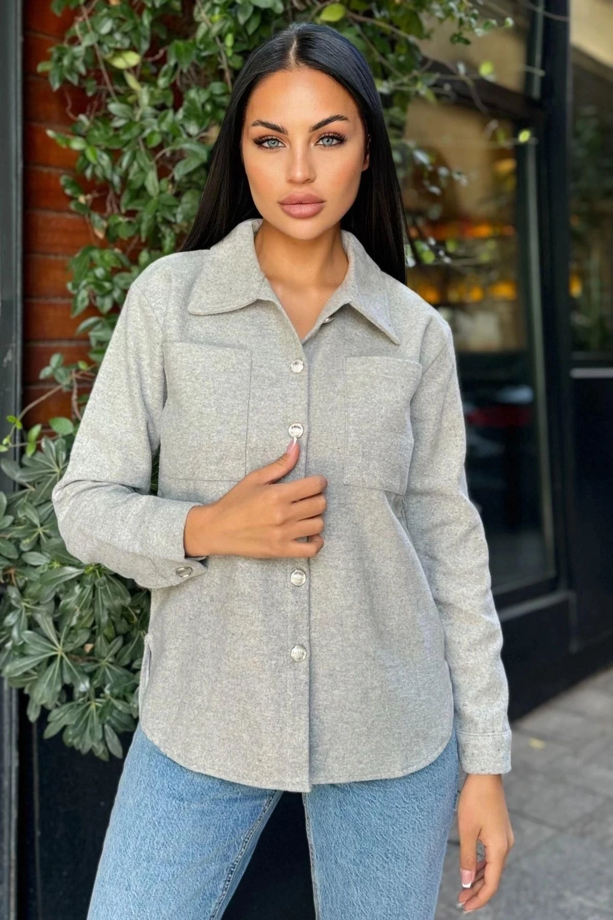 Gri Uzun Kol, Çift Cepli, Eteği Oval Kesim, Kaşe Gömlek Ceket