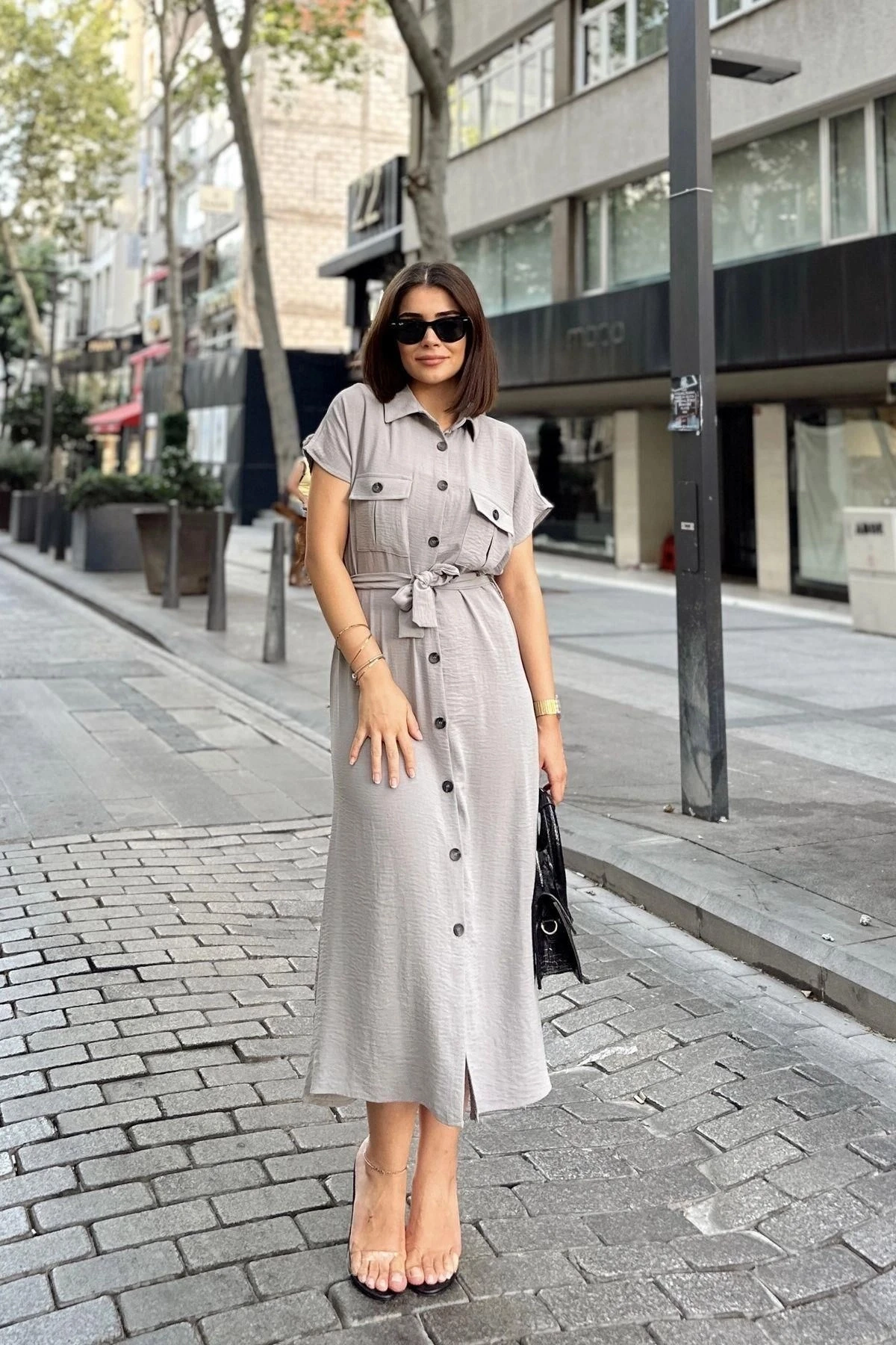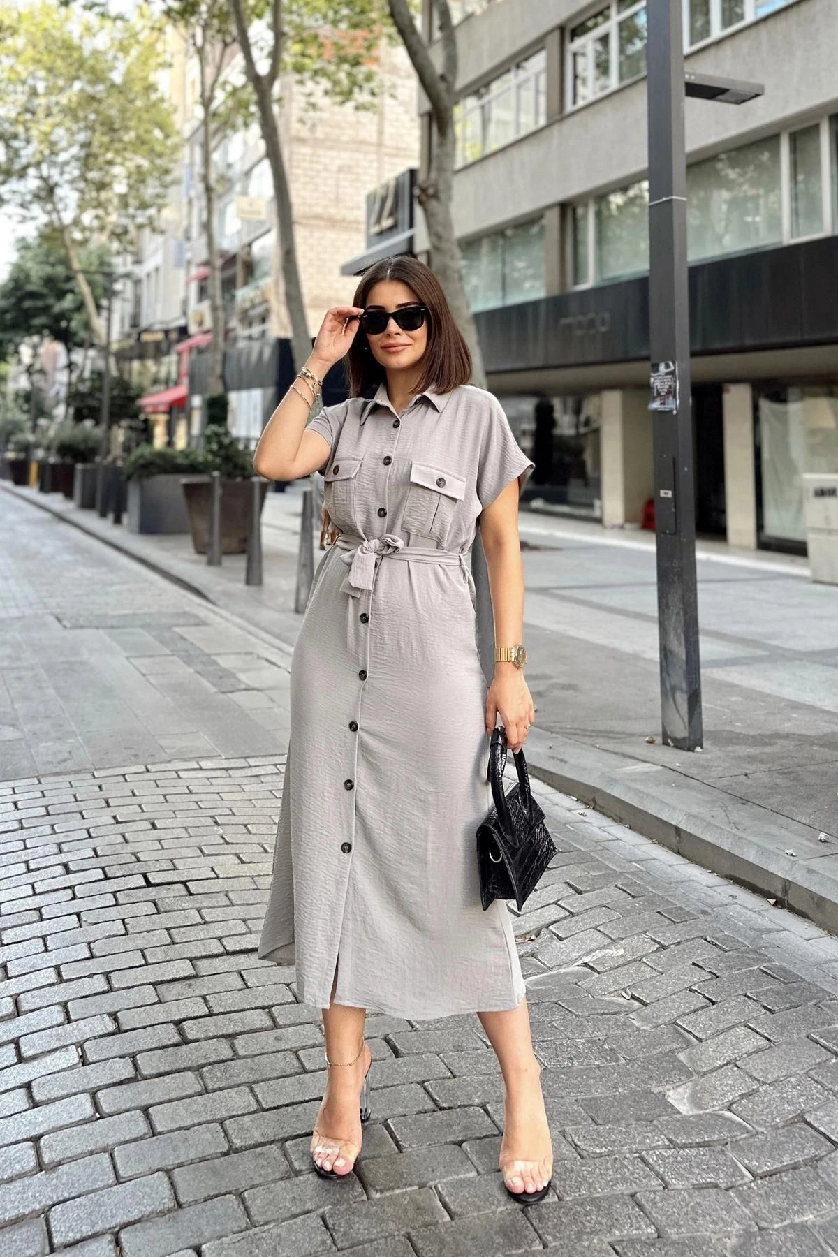 Gri/Taş Kısa Kol, Gömlek Yaka, Düz Desen, Çift Cepli, Aerobin Kumaş, Kuşaklı Maxi Elbise