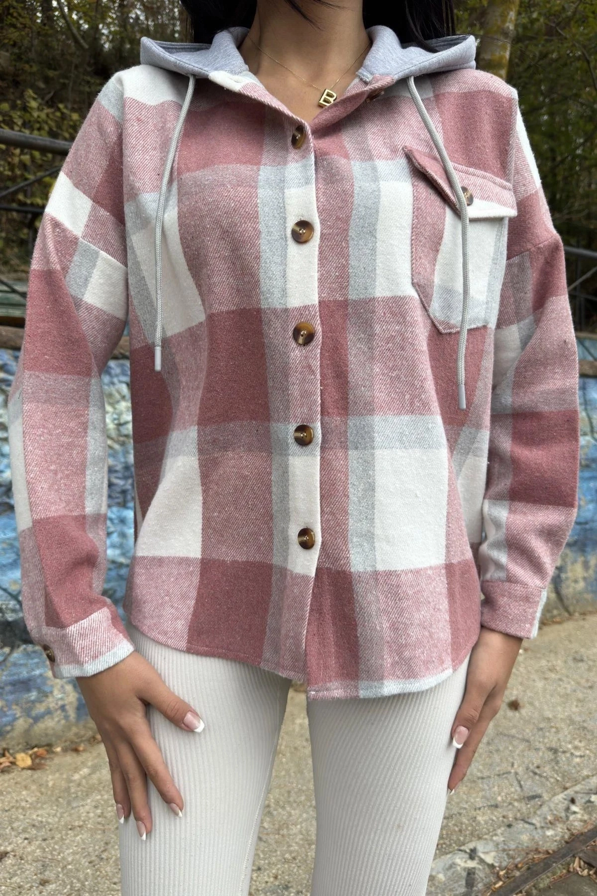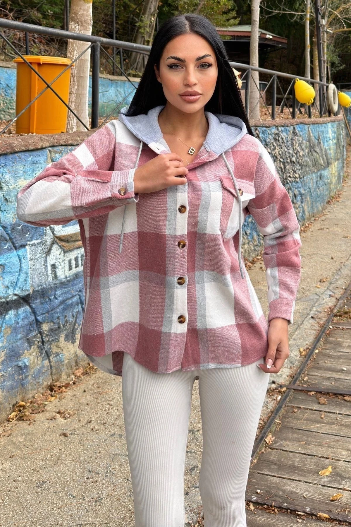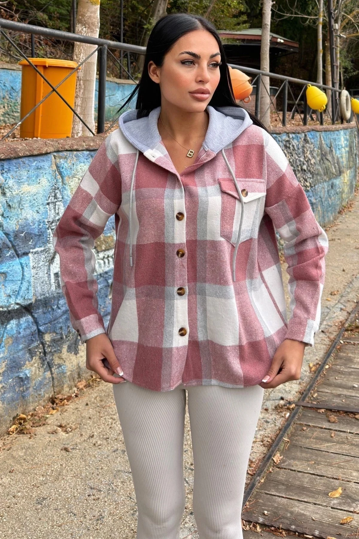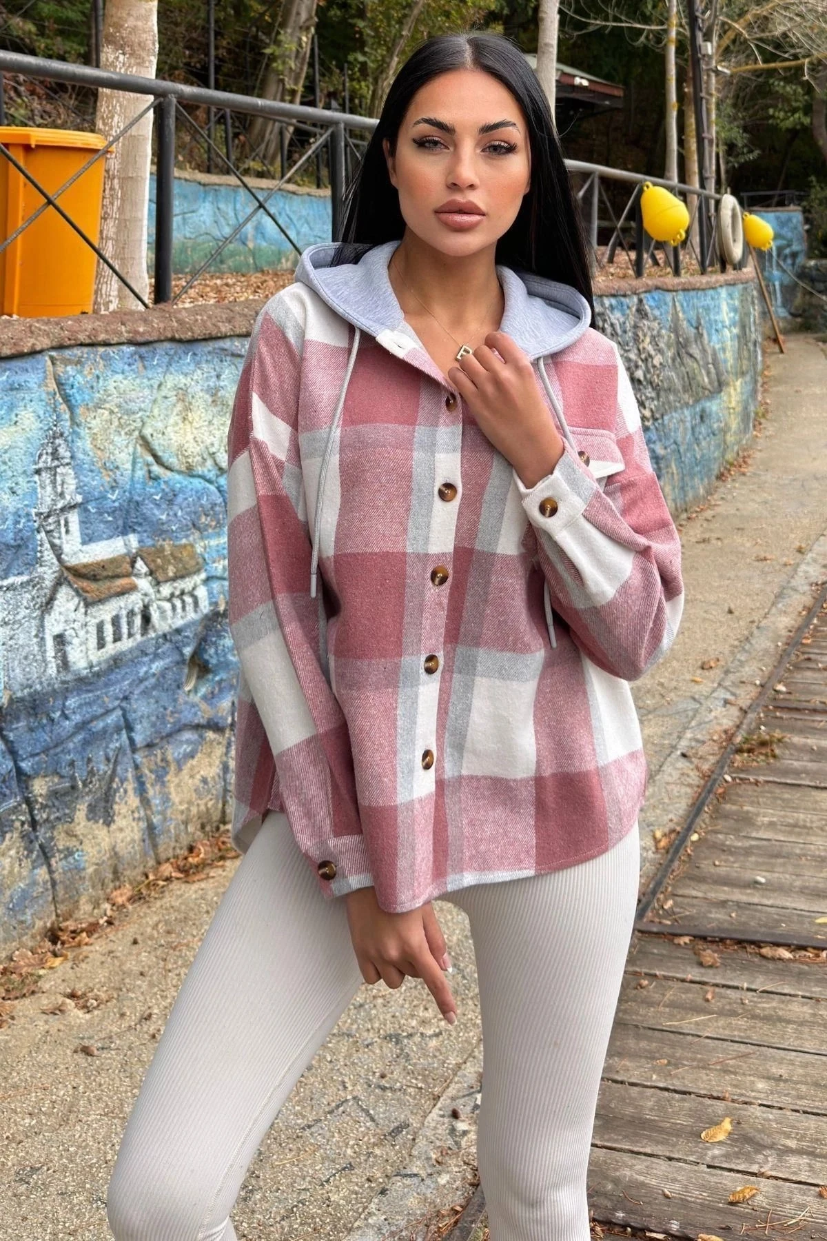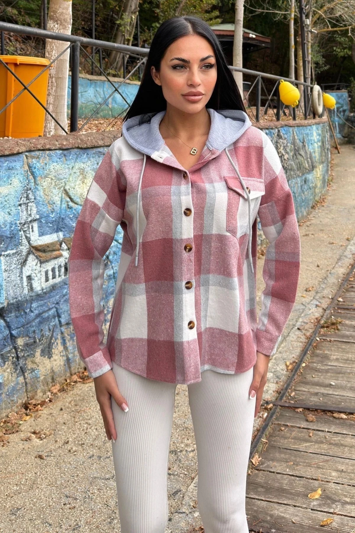 Gül Kurusu Ekose Desenli, Yumuşak Dokulu, Kapüşonlu Oduncu Gömlek