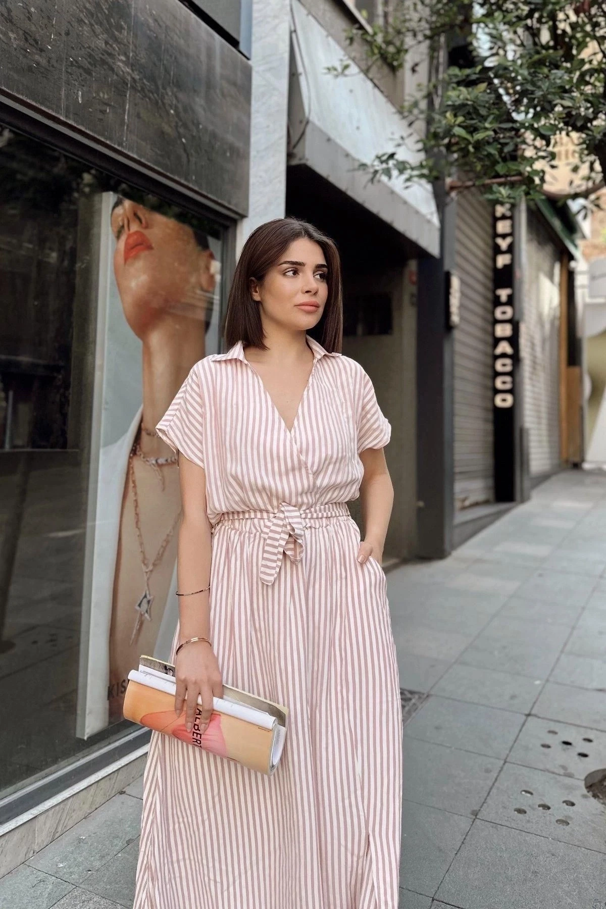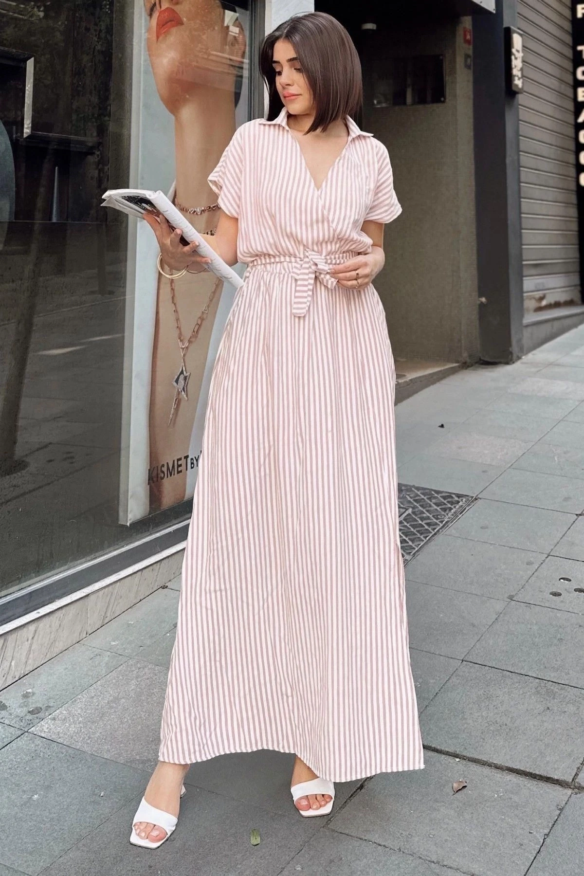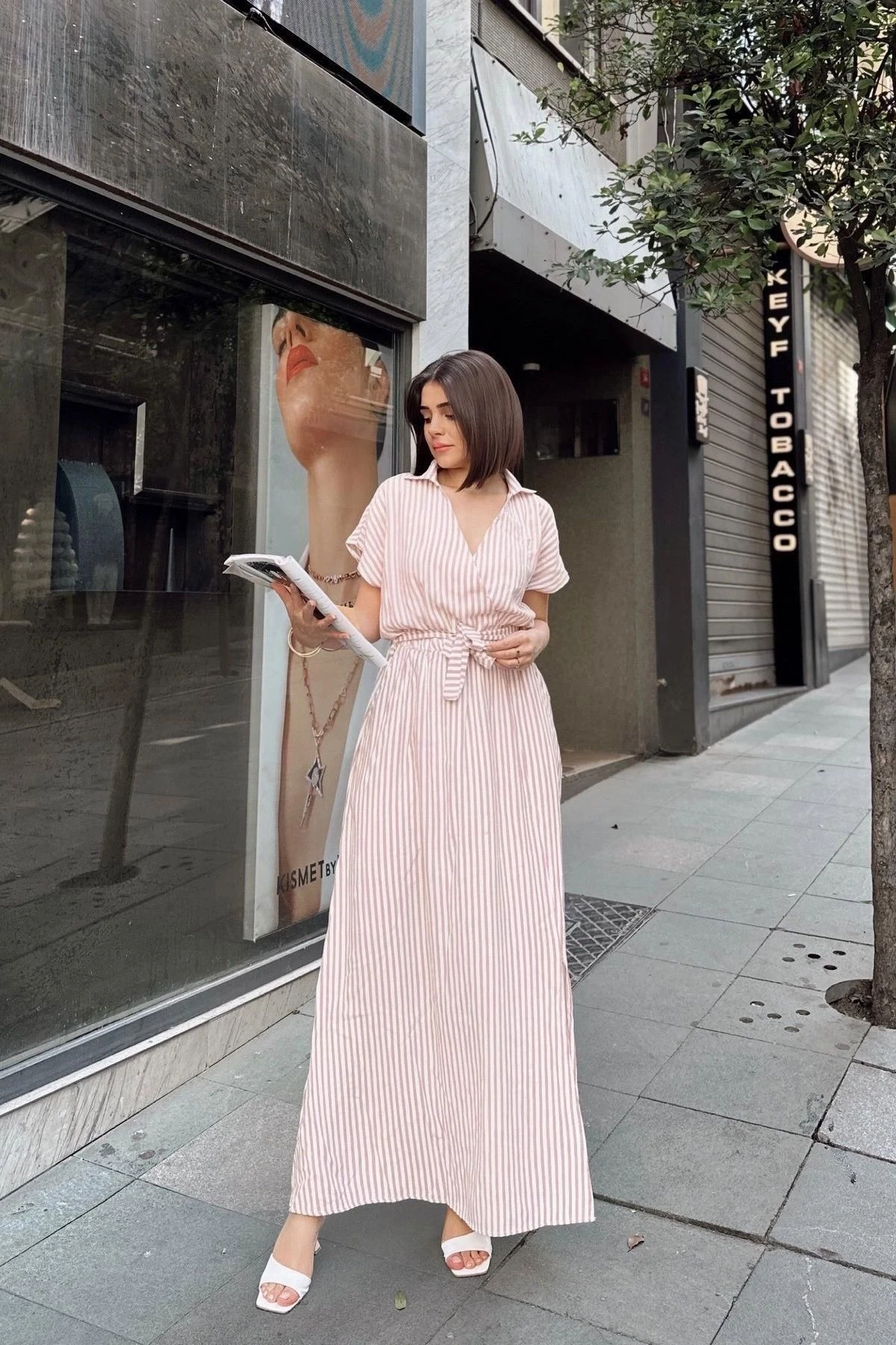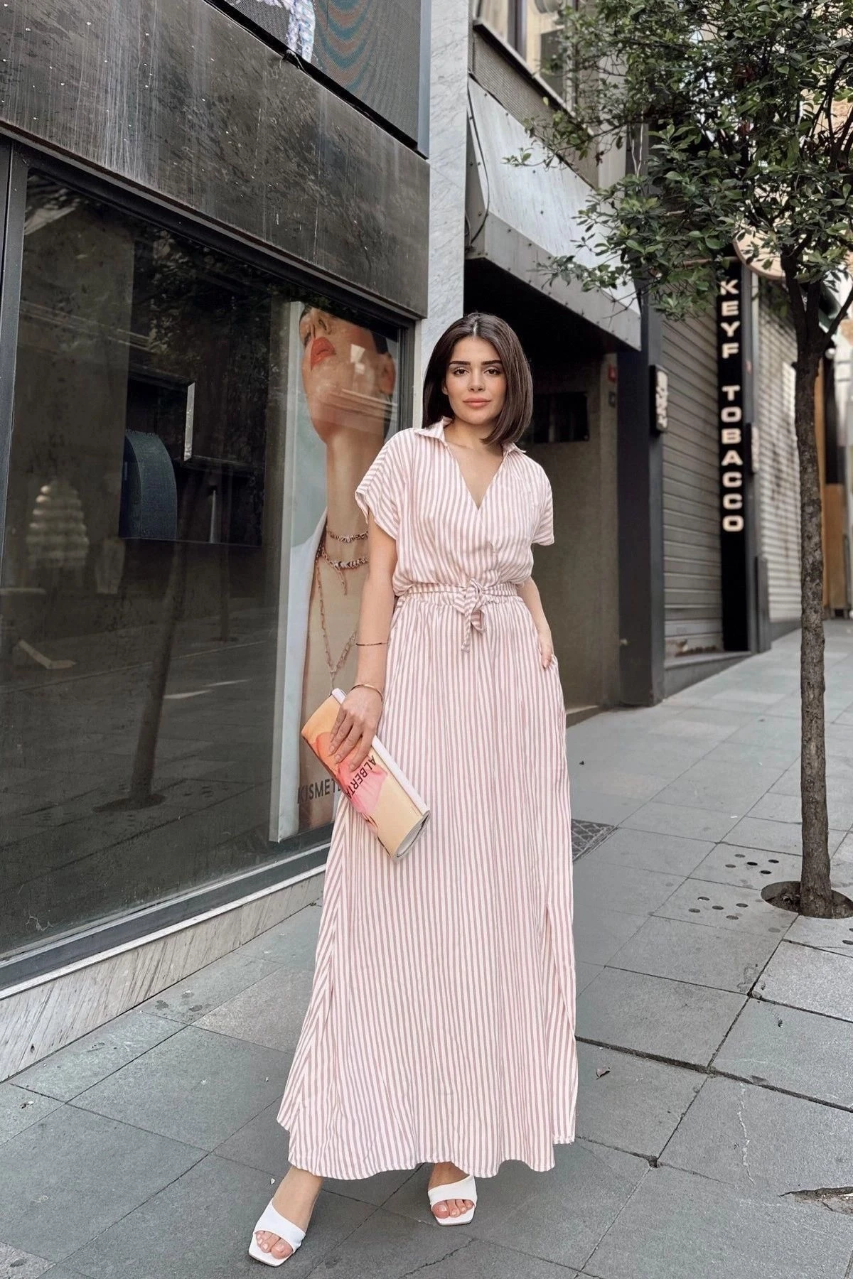 Gül Kurusu & Ekru Kruvaze Polo Yaka, Kısa Kol, Çizgili Yazlık Kumaşlı, Yırtmaçlı, Kemerli/Kuşaklı, Maxi Uzun Elbise, şıklığı ve yaz havasını bir araya getiren bir seçenektir.; Bu elbise, %60 cotton %40 polyester karışımı kumaş kullanılarak özenle tasarlanmıştır.; Kumaş seçimi, elbisenin rahatlık ve hafiflik sağlamasını hedefler.; Yazlık kumaş, hava alabilir ve nefes alabilir bir yapıya sahiptir, böylece sıcak havalarda bile rahat bir giyim deneyimi sunar.; %60 cotton %40 polyester karışımı kumaş ise elastik özelliklere sahip olup hareket özgürlüğü sağlar.; Gül kurusu ve ekru renklerin uyumlu kombinasyonu, elbiseye zarif ve romantik bir görünüm katar.; Çizgili desen ise modern bir tarz sunar.; Bu renk ve desen seçimi, elbiseyi dikkat çekici ve şık bir hale getirir.; Kruvaze polo yaka detayı, elbiseye sofistike bir hava katar ve boyun bölgesinde hoş bir vurgu sağlar.; Kısa kol tasarımı ise elbiseyi yaz aylarında serin ve rahat bir seçenek haline getirir.; Yırtmaçlı detayı, bacaklarda hareketlilik ve feminen bir dokunuş sağlar.; Kemerli/kuşaklı tasarım, elbisenin bel kısmını vurgular ve şekillendirir.; Bu detay, elbiseye özgün bir tarz ve çarpıcı bir görünüm katar.; Maxi uzunluk ise zarafeti ve asil bir duruşu destekler.; Gül Kurusu & Ekru Kruvaze Polo Yaka, Kısa Kol, Çizgili Yazlık Kumaşlı, Yırtmaçlı, Kemerli/Kuşaklı, Maxi Uzun Elbise, hem günlük hayatta hem de özel etkinliklerde şıklığı ve rahatlığı bir arada sunan bir seçenektir.; Yazın enerjisini yansıtan renkleri ve modern tasarımıyla dikkat çeken bu elbise, %60 cotton %40 polyester karışımı kumaşıyla konforlu bir giyim deneyimi sunar.; Kendinizi özgür ve şık hissedeceğiniz bu elbiseyle her anınızda tarzınızı konuşturun.