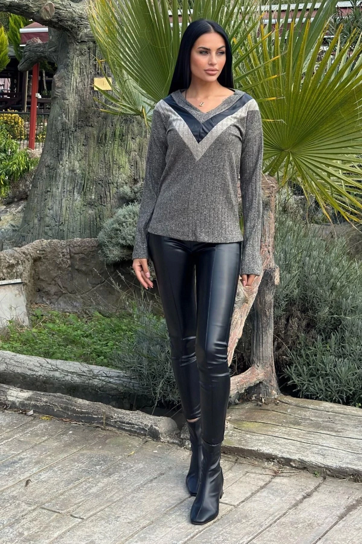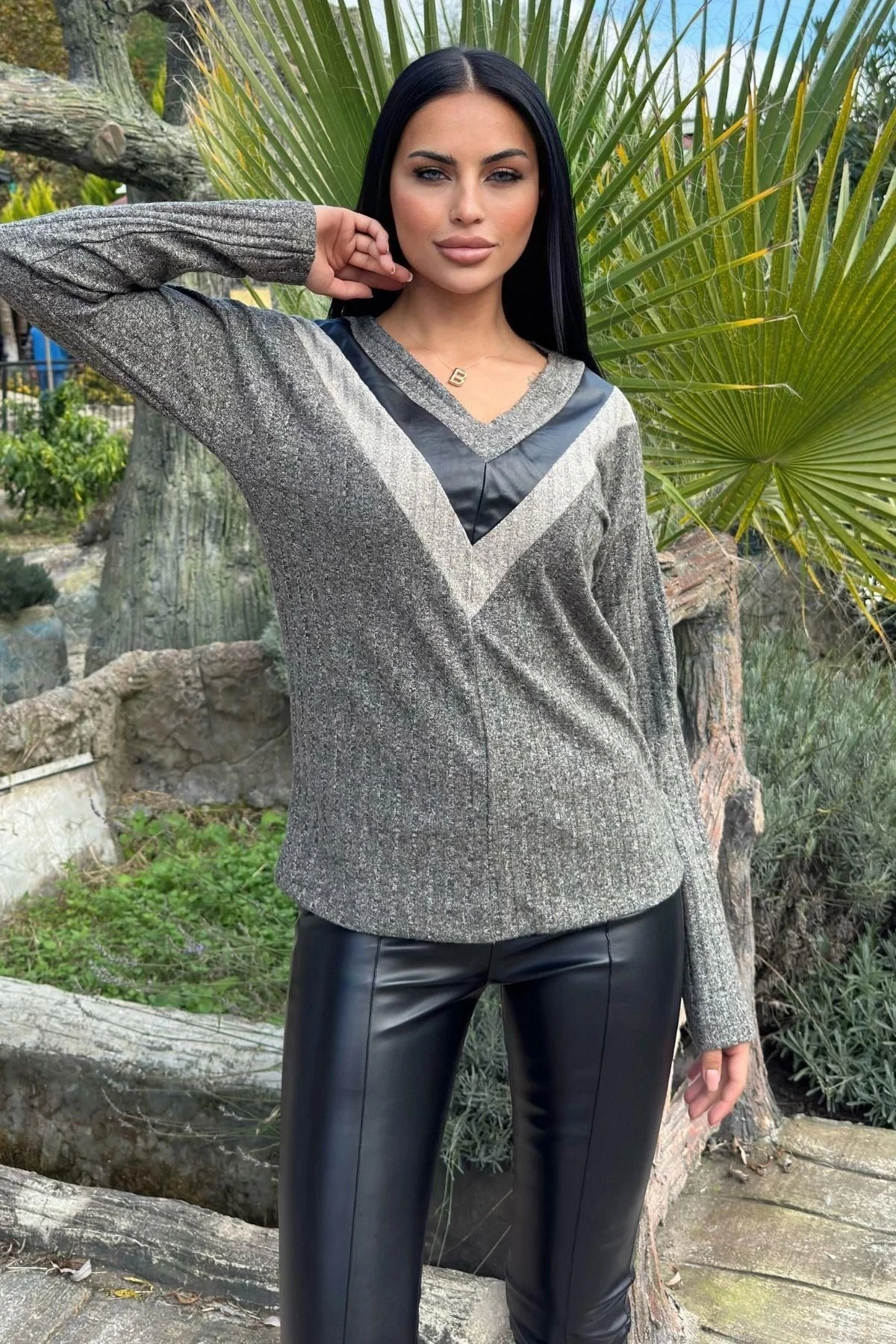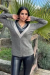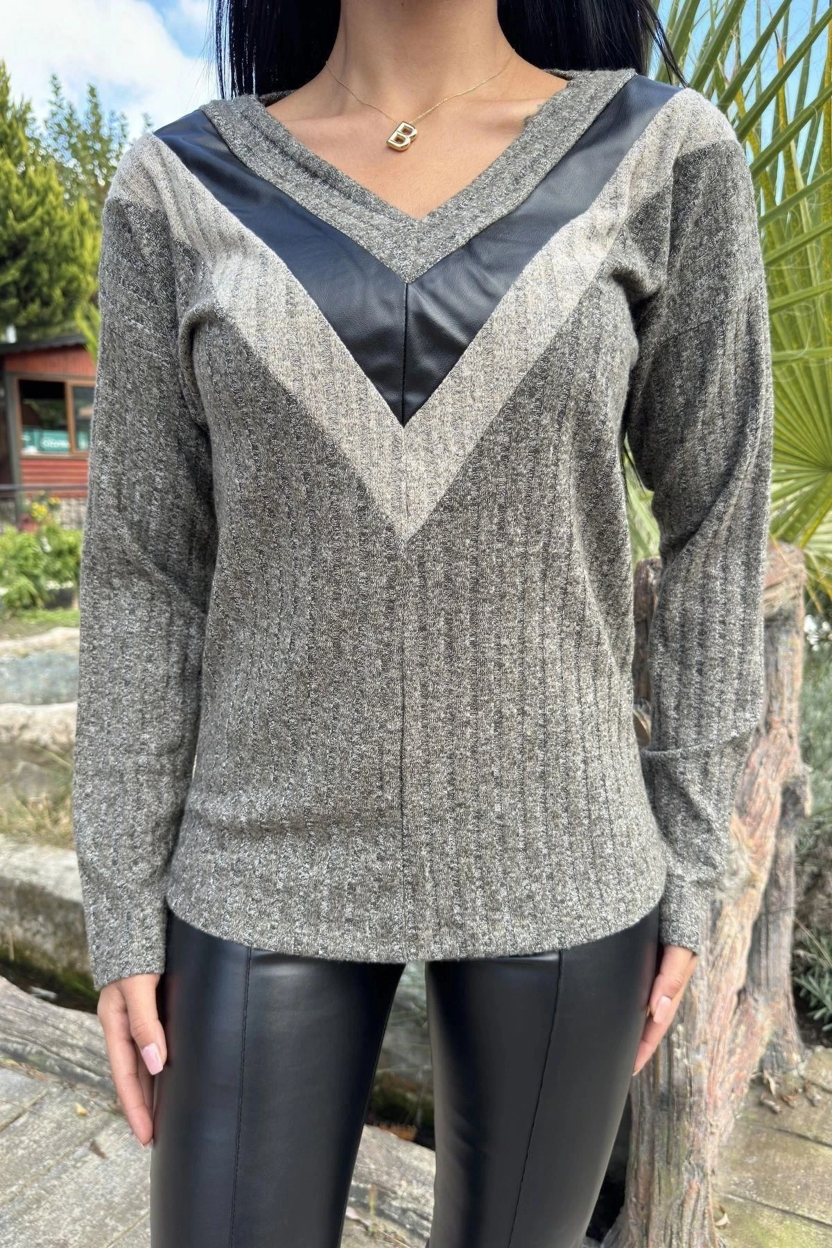 Haki & Antrasit Deri Kontrastlı V Yaka Kaşkorse Kazak