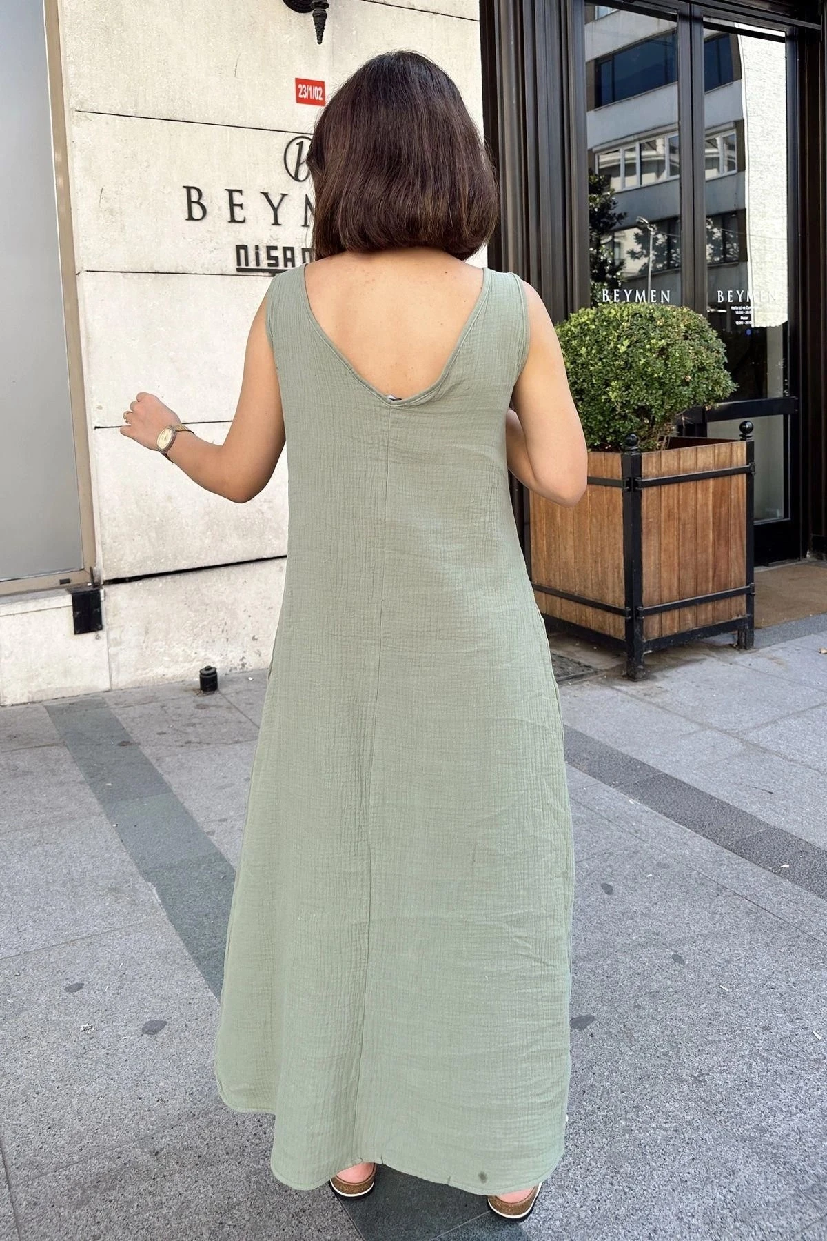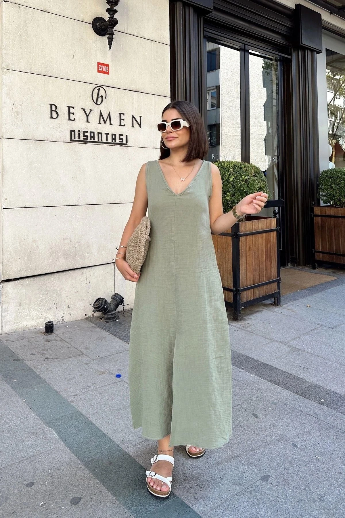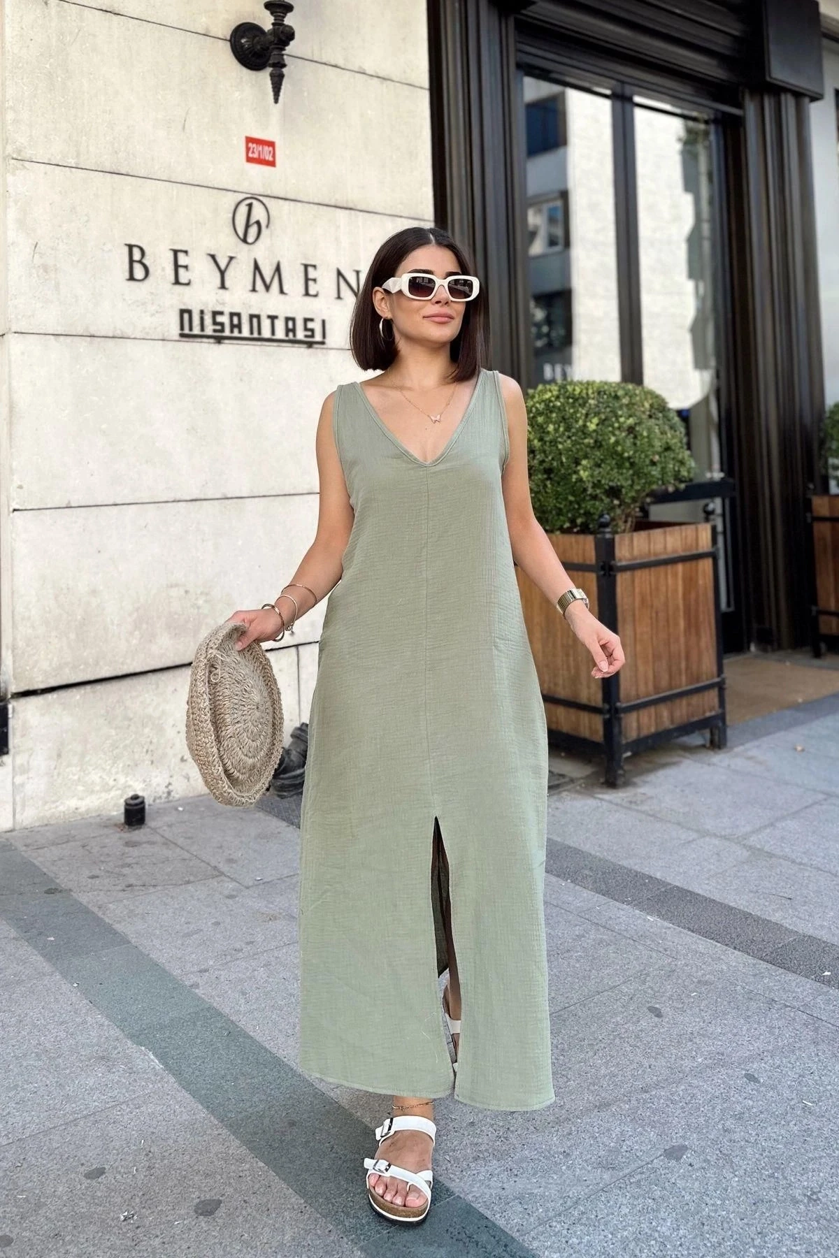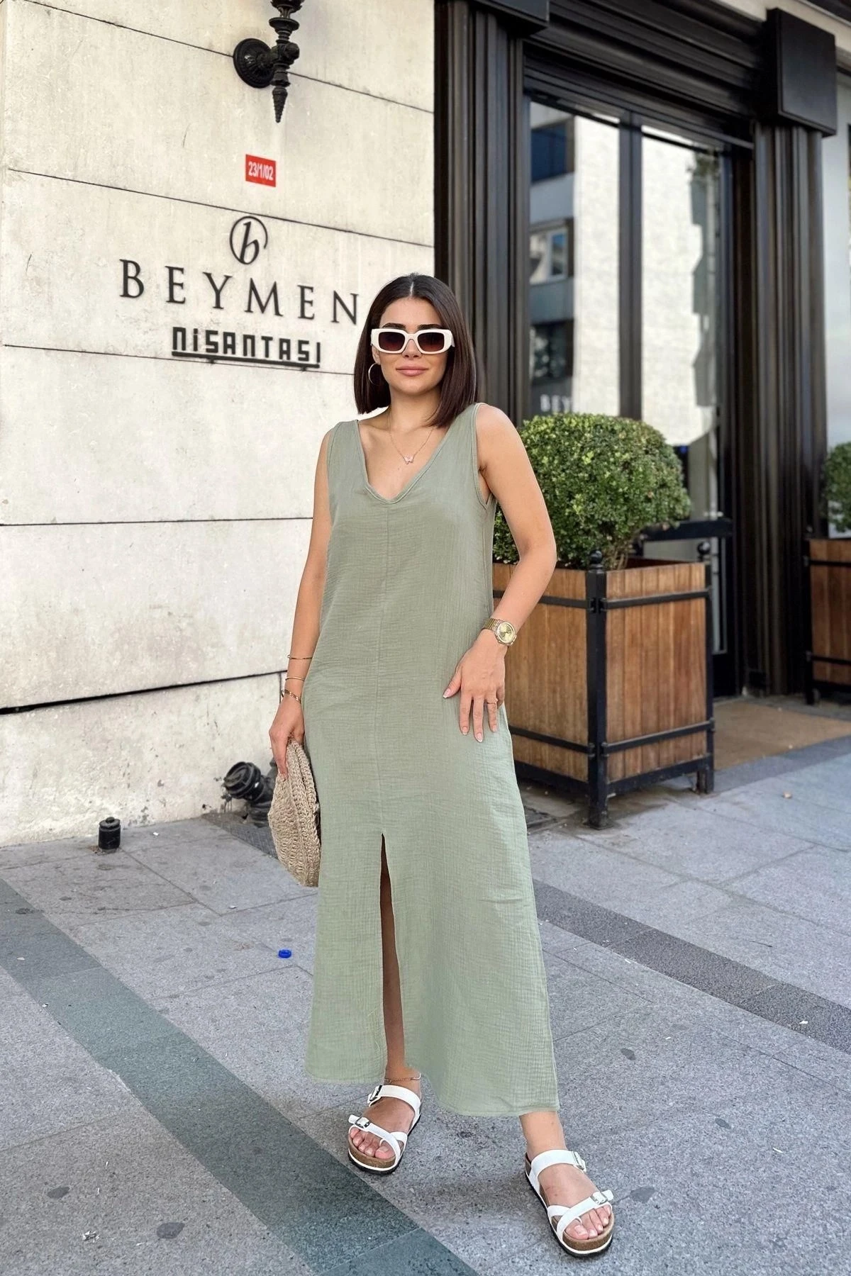 Haki Askılı İthal Müslin Kumaş, Önü Ve Arkası V Yaka, Önden Yırtmaçlı, Maksi/Uzun Salaş Elbise