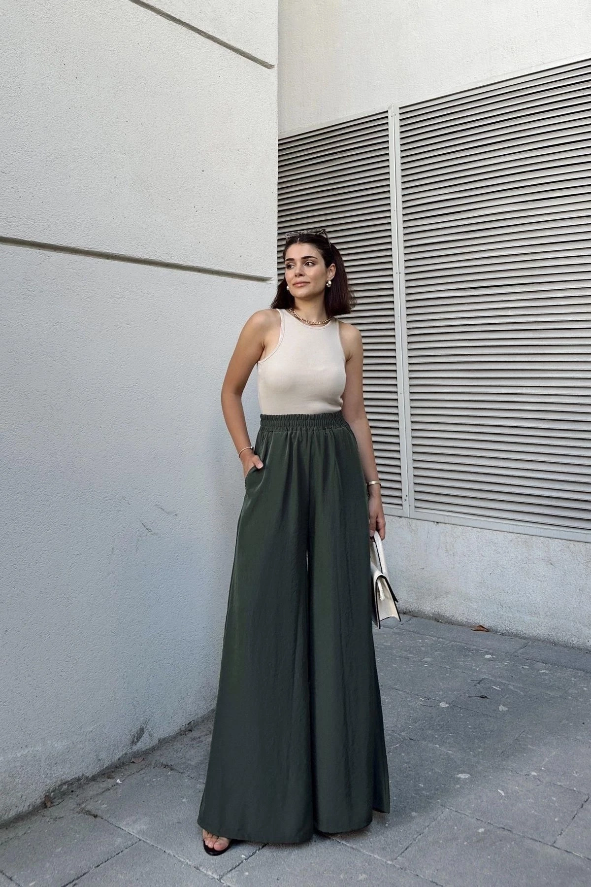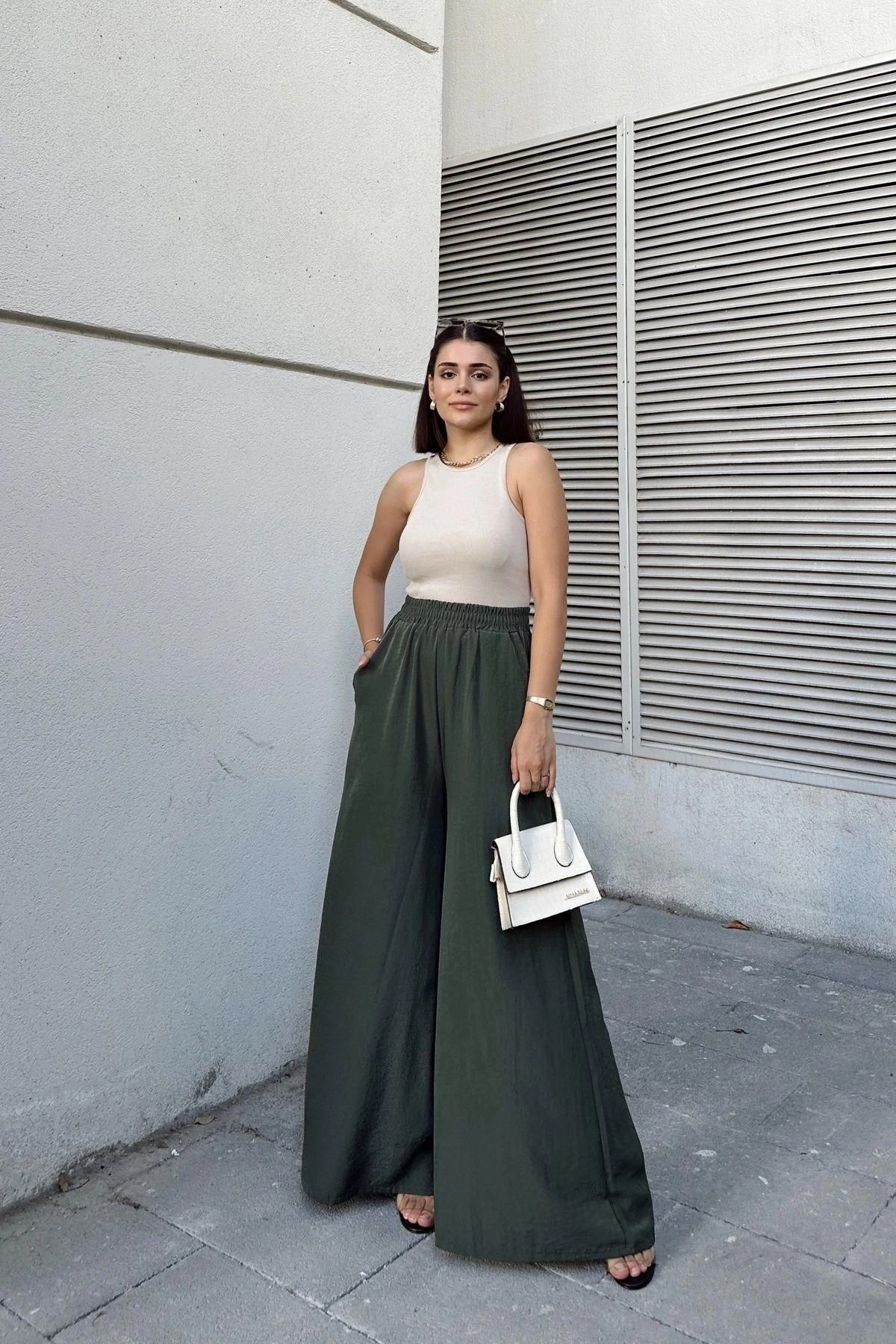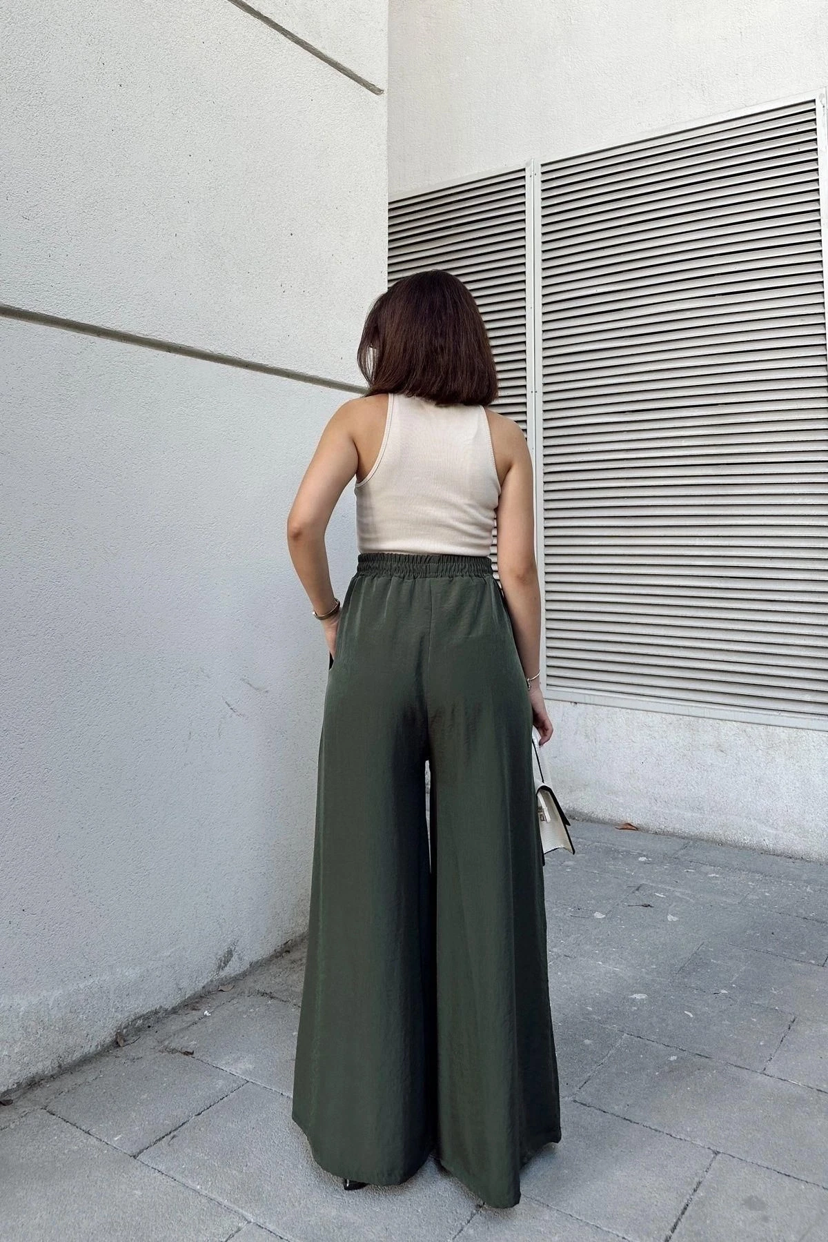 Haki Beli Lastikli, Cepli, İspanyol / Bol Paça Özel Kumaş, Rahat Kalıp Pantolon - Tesettüre Uygun