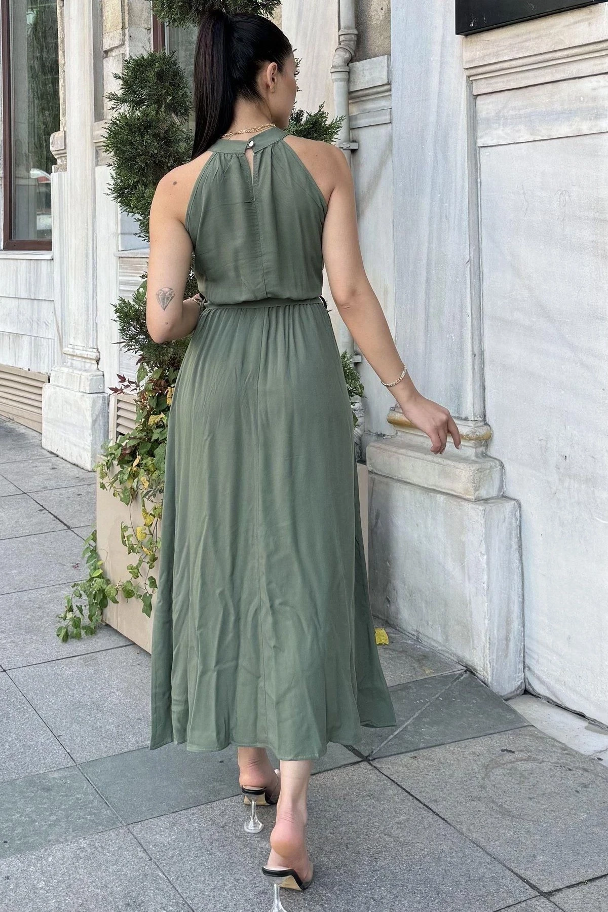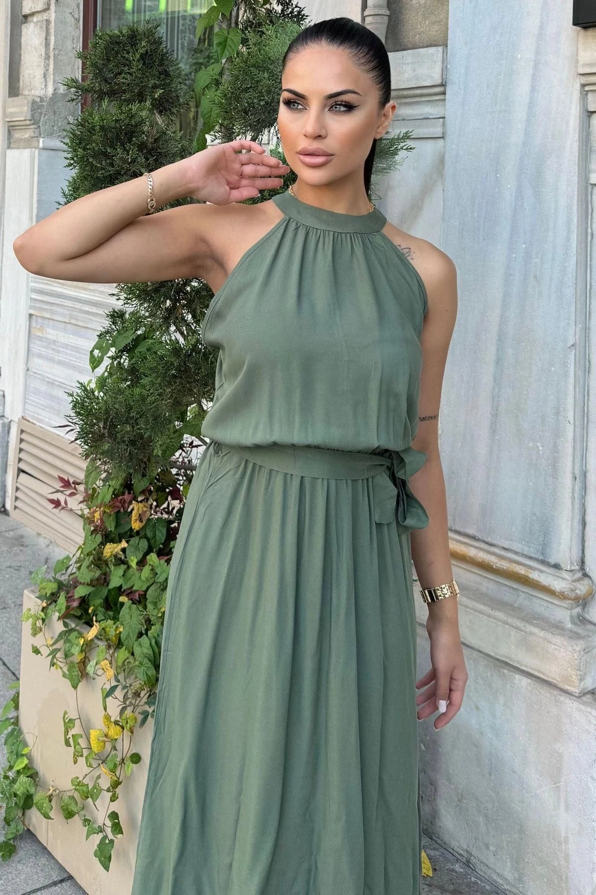 Haki Halter Yaka, Sıfır Kol, Kemer Detaylı Salaş Kesim, Maksi Boy Uzun Rahat Ve Günlük Elbise