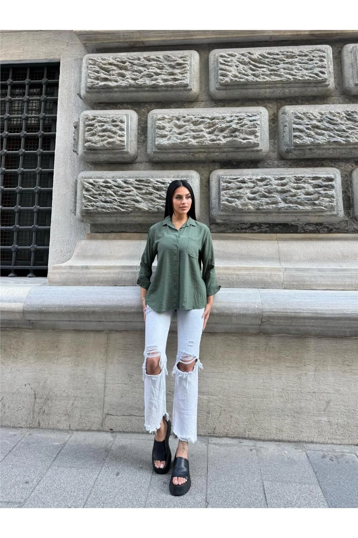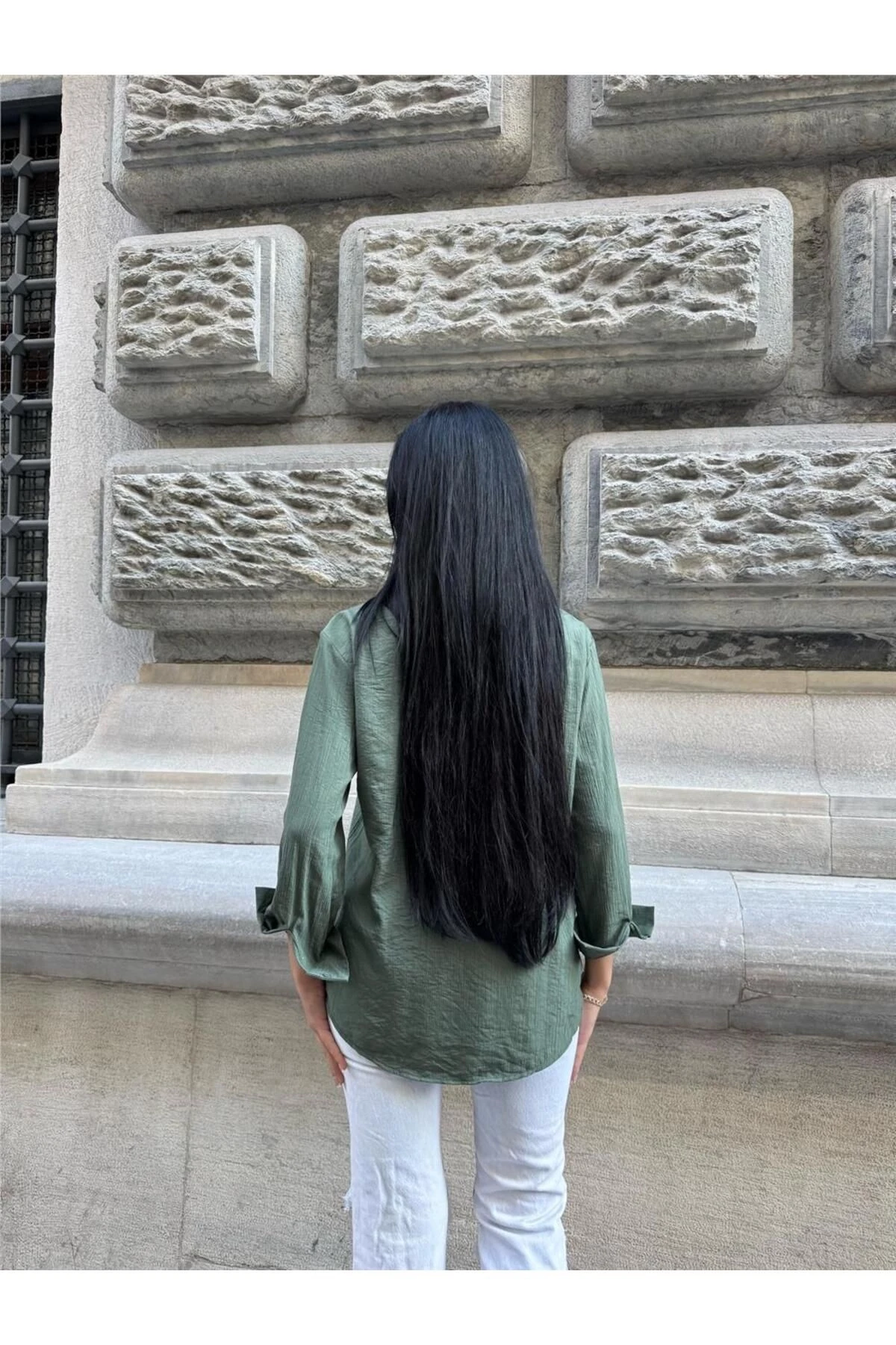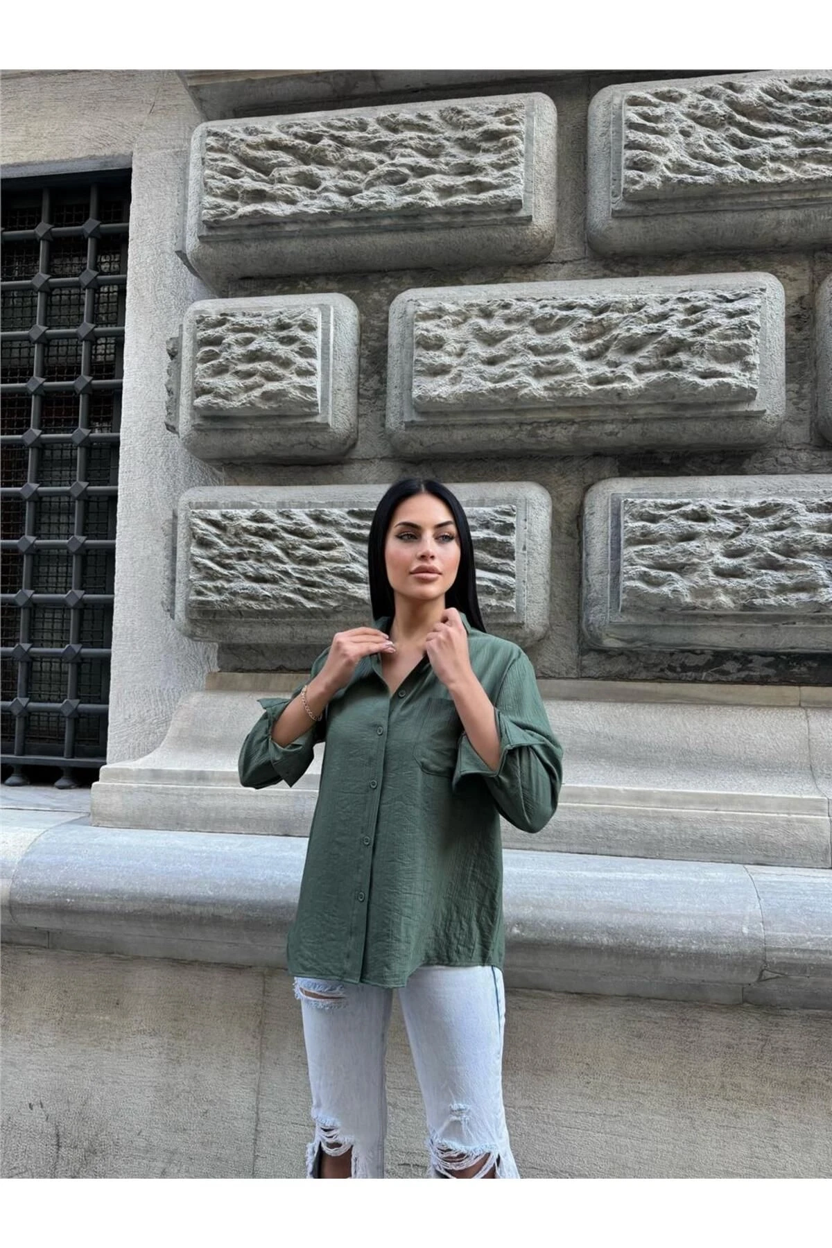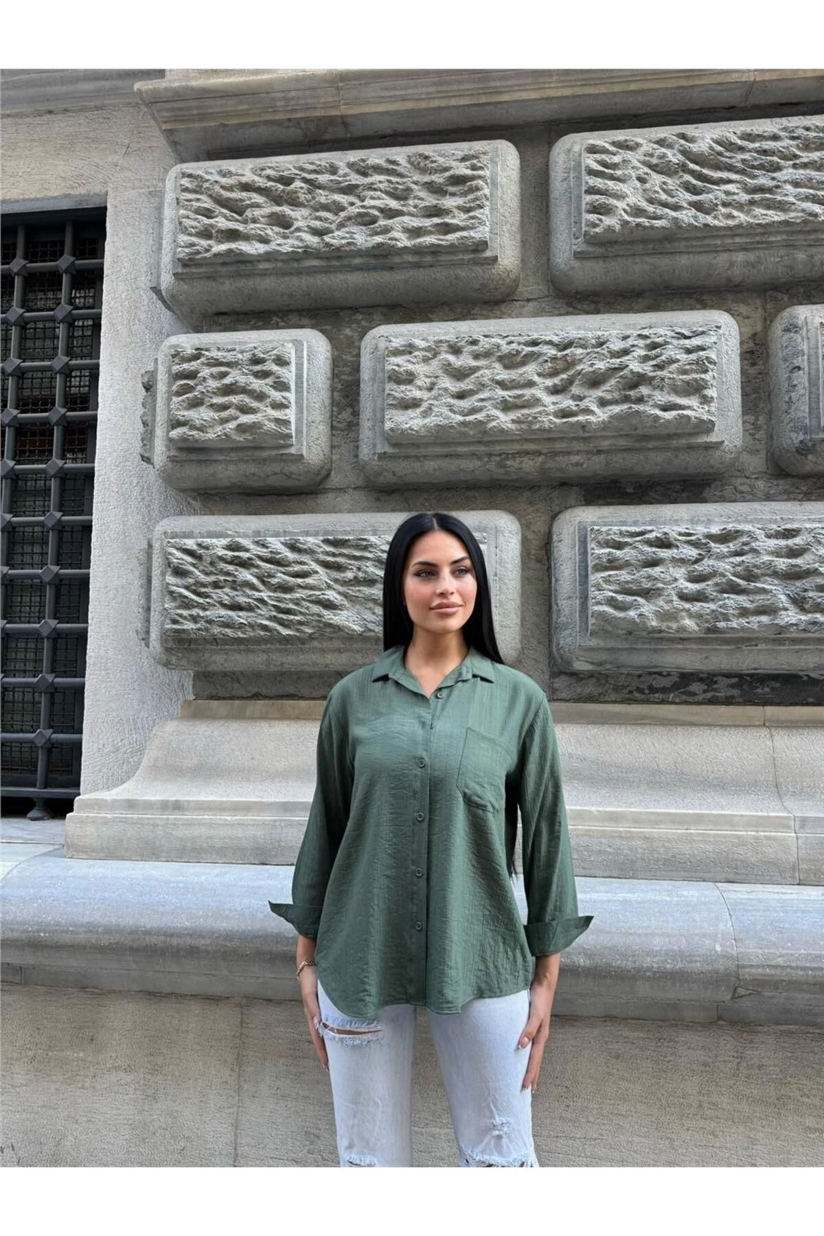 Haki Kırışık Oversize %100 Pamuk Gömlek