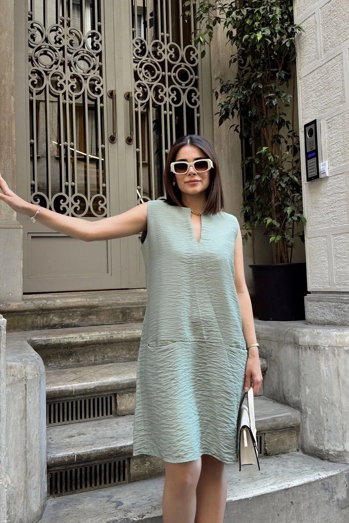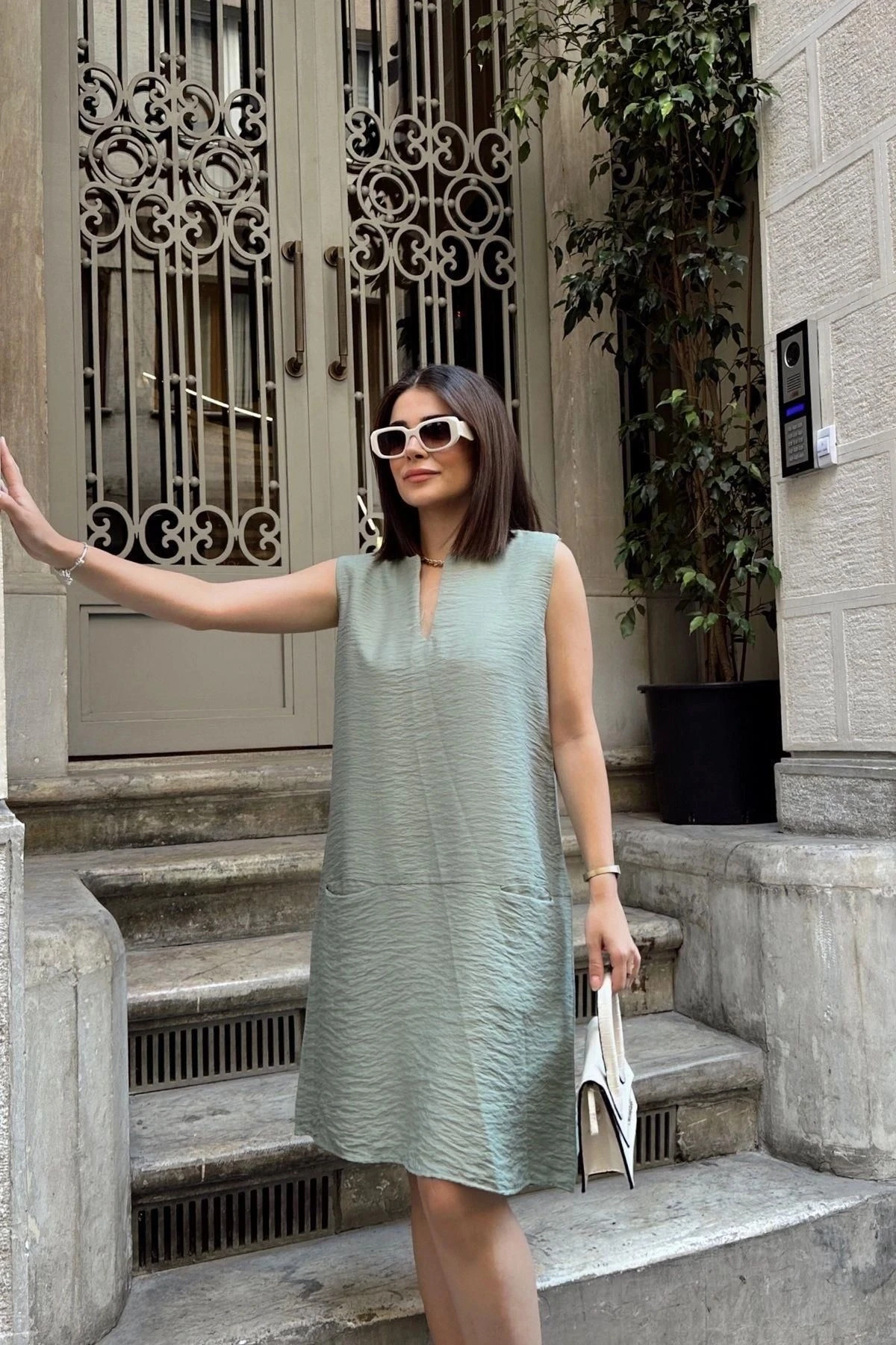 Haki Kolsuz Yakası Yırtmaçlı, Gizli Çift Cepli, A Kesim Rahat Midi Elbise