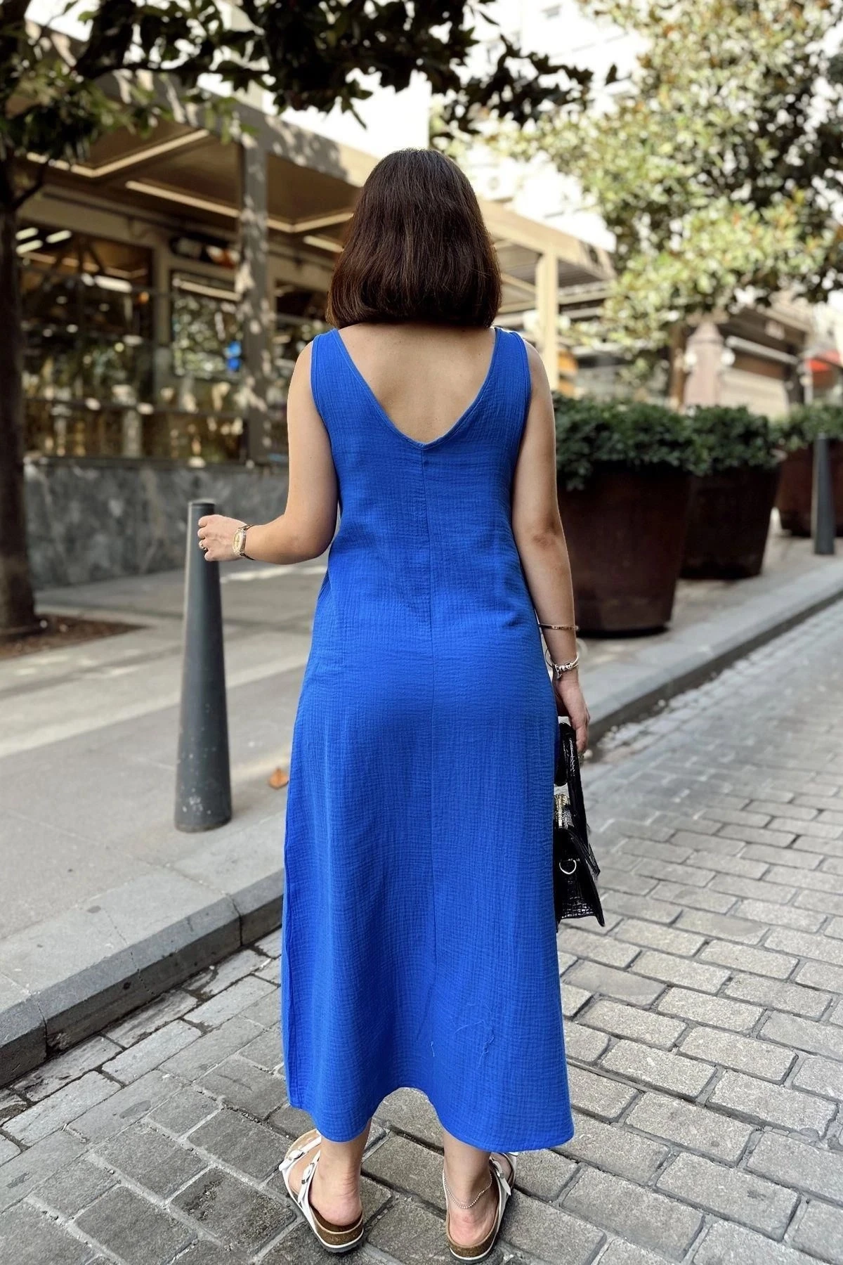 İndigo Askılı İthal Müslin Kumaş, Önü Ve Arkası V Yaka, Önden Yırtmaçlı, Maksi/Uzun Salaş Elbise