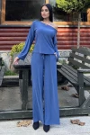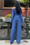 İndigo Bağcık Detaylı Geniş Paça Pantolon & Geniş Yaka Salaş Bluz - Sandy Kumaş Takım