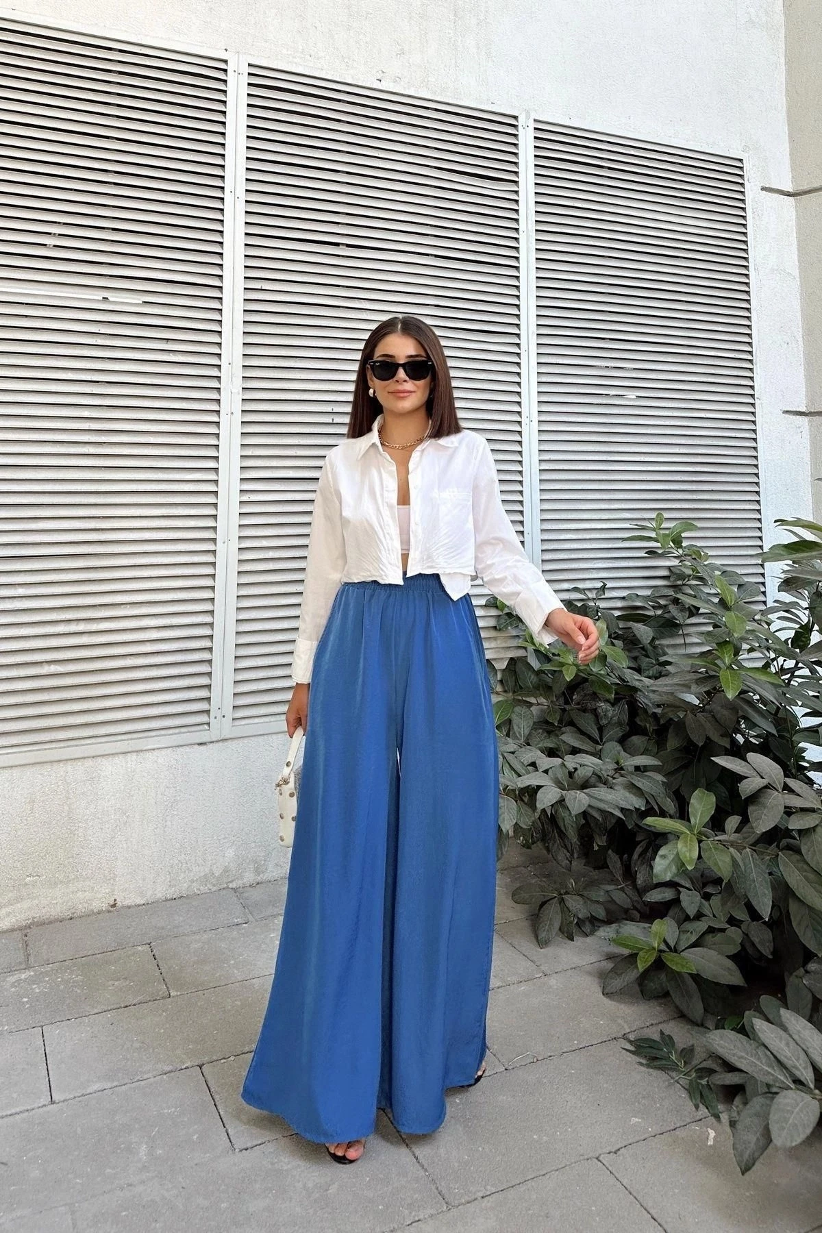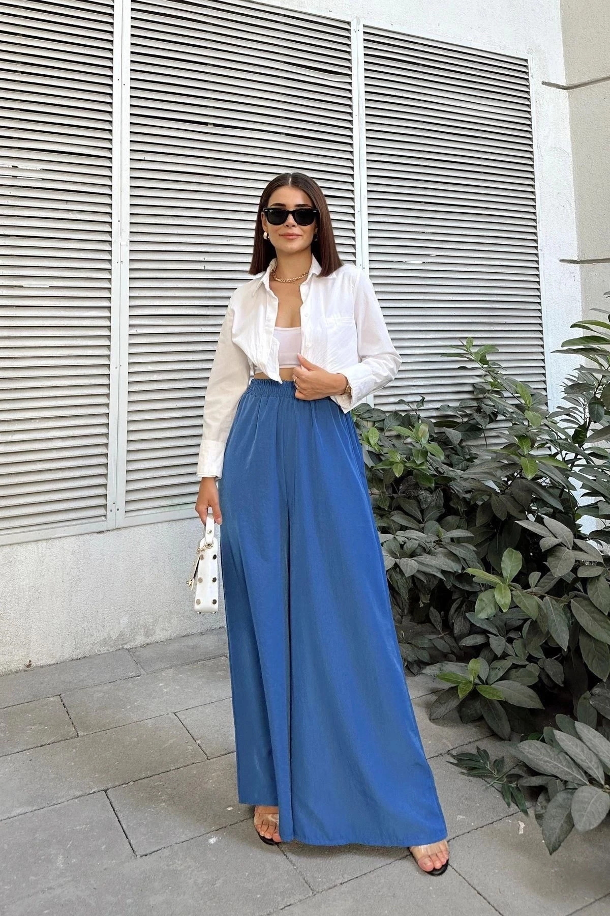 İndigo Beli Lastikli, Cepli, İspanyol / Bol Paça Özel Kumaş, Rahat Kalıp Pantolon - Tesettüre Uygun