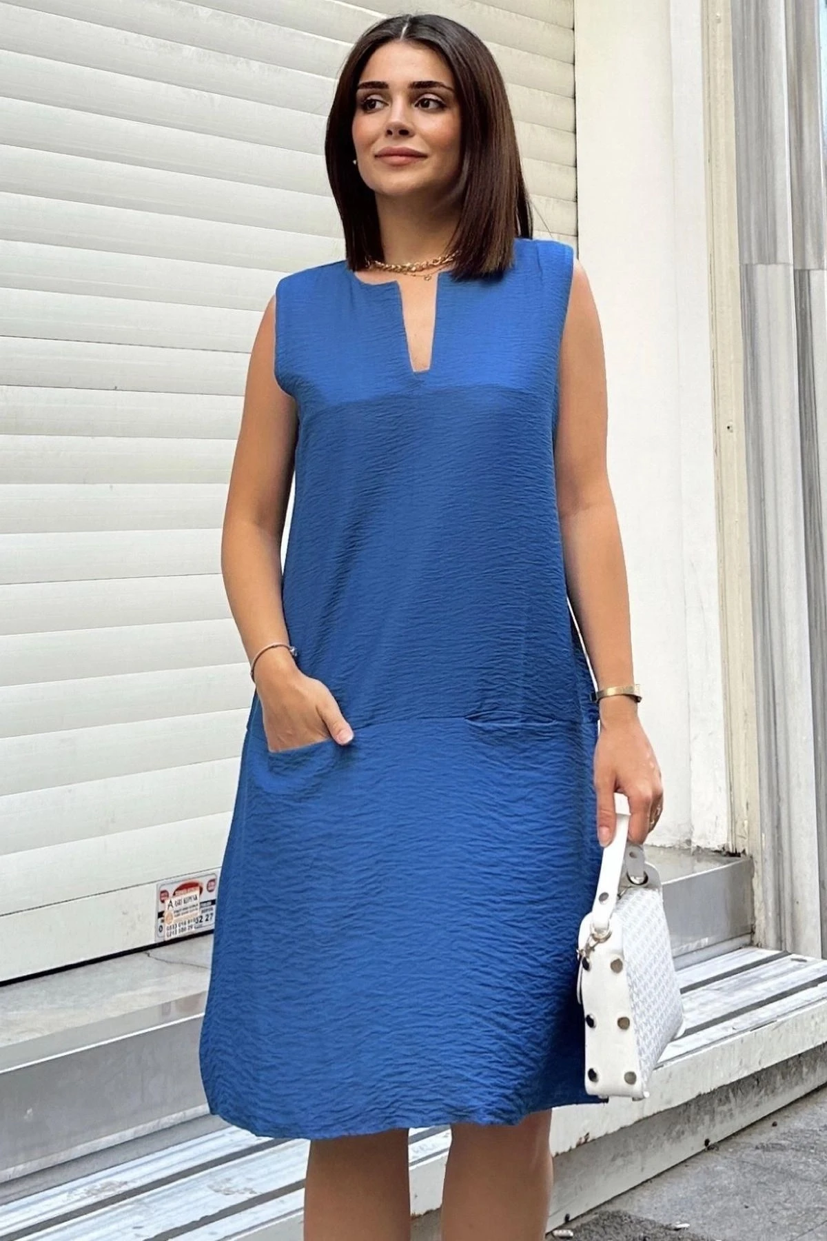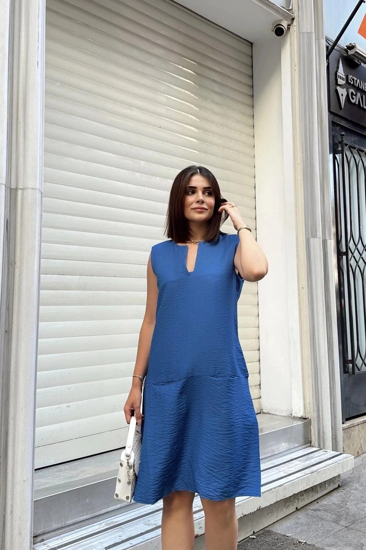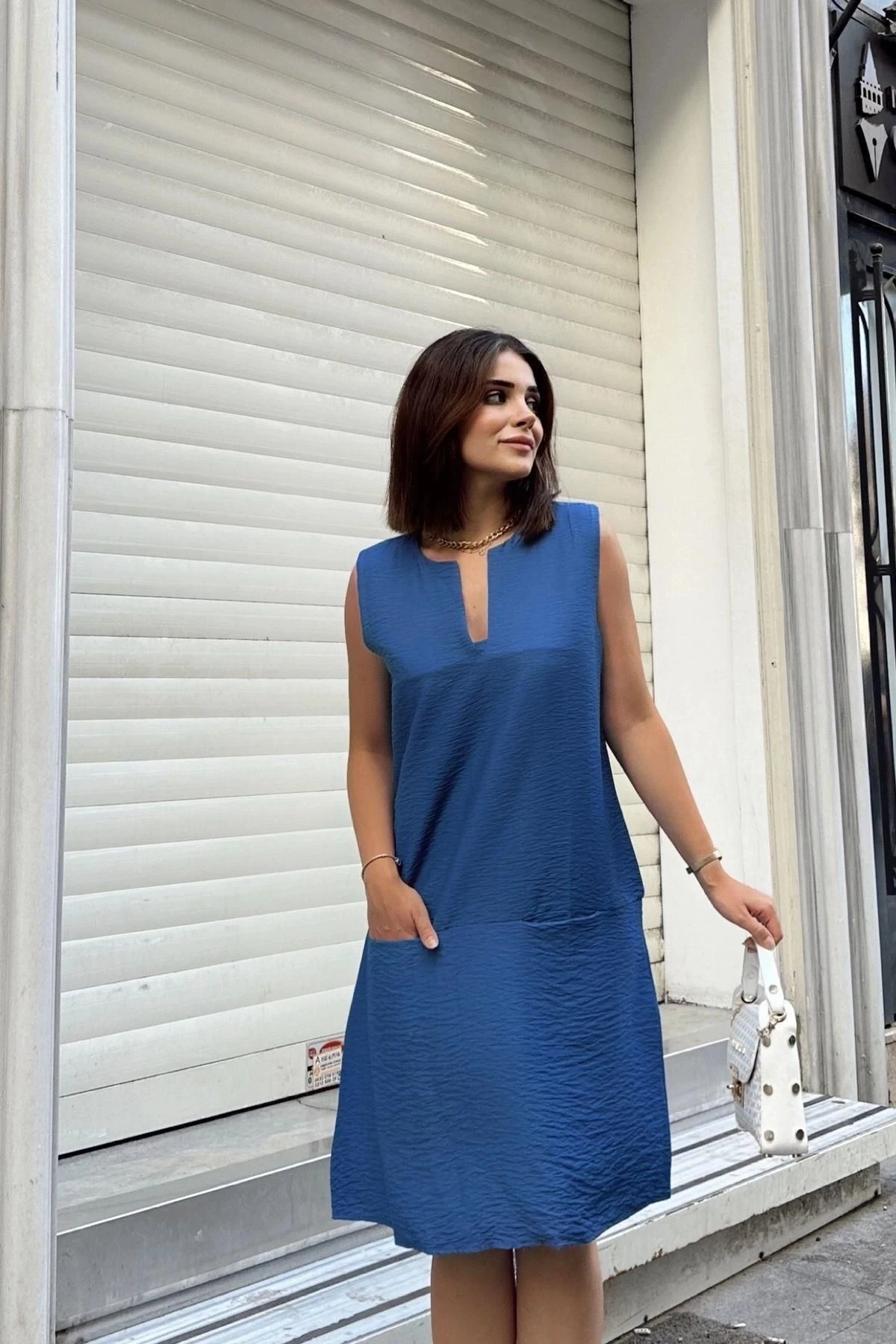 İndigo Kolsuz Yakası Yırtmaçlı, Gizli Çift Cepli, A Kesim Rahat Midi Elbise